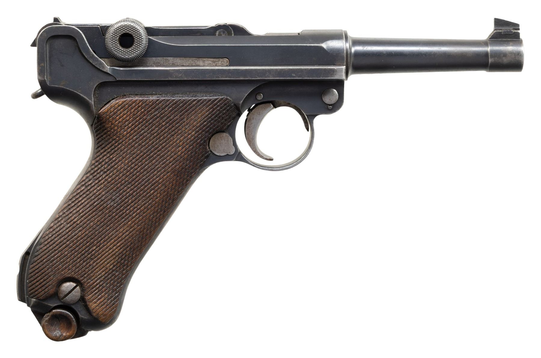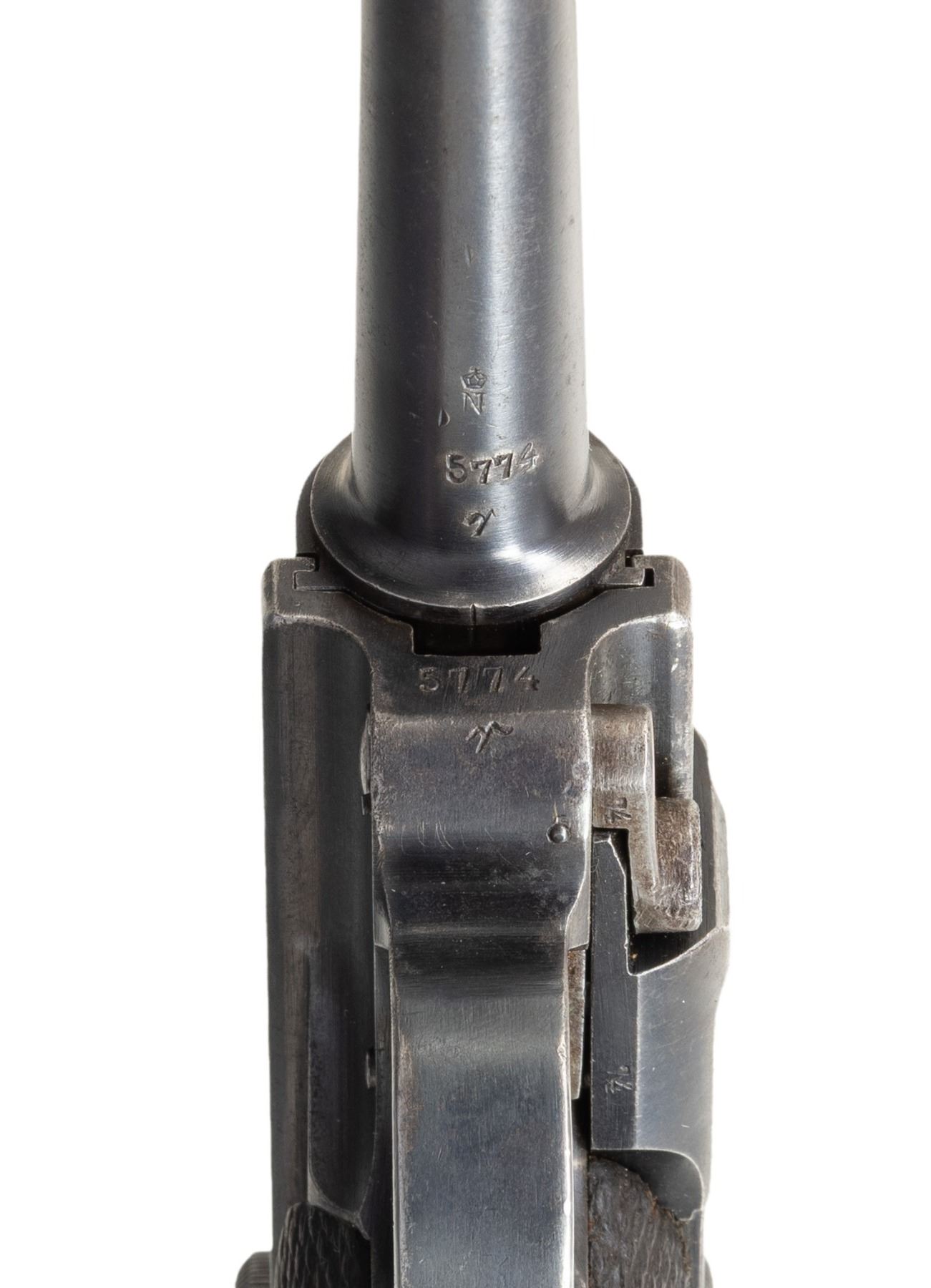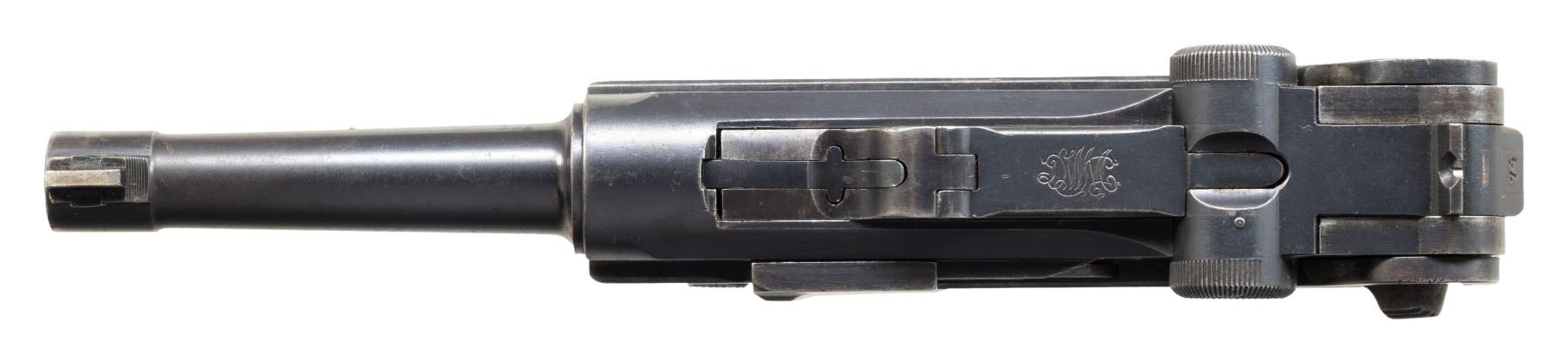 Cal. 30 Luger. S# 5774r. Bbl. 3 3/4". Looking to update their current military sidearm and being unsatisfied with the domestically designed Ahlberg pistol, the Finnish Ministry of Defense went to DWM in hopes of acquiring a contract for the P.08 pistol. DWM, unable to to fulfill this request due to the Treaty of Versailles, could only offer Finland the Model 1920 Commercial Luger chambered in 7.65x21mm Parabellum (.30 Luger). Ultimately, the Finnish Ministry of Defense accepted these Lugers, designating them as the "M/23", with a small number being rebarreled for the 9x19mm cartridge and designated as the "M/08". This example, an M/23 Luger, is marked with a Crown/N commercial nitro proof on the left side of the bbl. extension, which is repeated on the underside of the bbl. and left side of the breechblock. Toggle is marked with the intertwined "DWM" logo. Rear grip strap is import marked "PRI GARDEN CITY KS/ P08 30 LUGER GERMANY" along the sides of the stock lug. Metal components exhibit a blue finish overall, save for on some small parts, which exhibit a straw finish. Frame is mounted with 2-piece checkered wood grips. Dovetailed Lahti pattern blade front sight with fixed rear sight modified into a U-notch configuration, both indicative of Finnish use. Unusually, the underside of the breechblock has been drilled with a small hole that shows through to the firing pin. Nearly all serialized parts are matching in the "hidden" commercial fashion and include the frame, takedown lever, sideplate, bbl. and rear toggle link. Firing pin is mismatched via "78". MAGS: 1 8-rd. mag. with wood plug. CONDITION: metal components retain large amounts of their original factory blue finish, exhibiting areas of wear and thinning that are fading to gray patina, scattered superficial handling marks, as well as scattered spots and patches of light surface oxidation overall. Grip straps exhibit areas of wear that have faded to a gray patina, with scattered spots of light surface oxidation and pitting. Strawed parts retain traces of their original finish, with the balance having faded to gray patina, showing scattered spots of light pitting and age related discoloration. Bore exhibits light pitting and some mild pitting towards the muzzle, while retaining good rifling throughout. Proper manual mechanics. Grips show consistent smoothing, as well as some scattered marks and minor impressions, but otherwise remain sound. (25-6053/MLW). CURIO. $800-1,400.