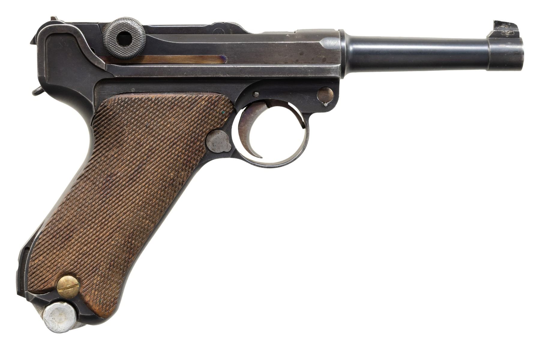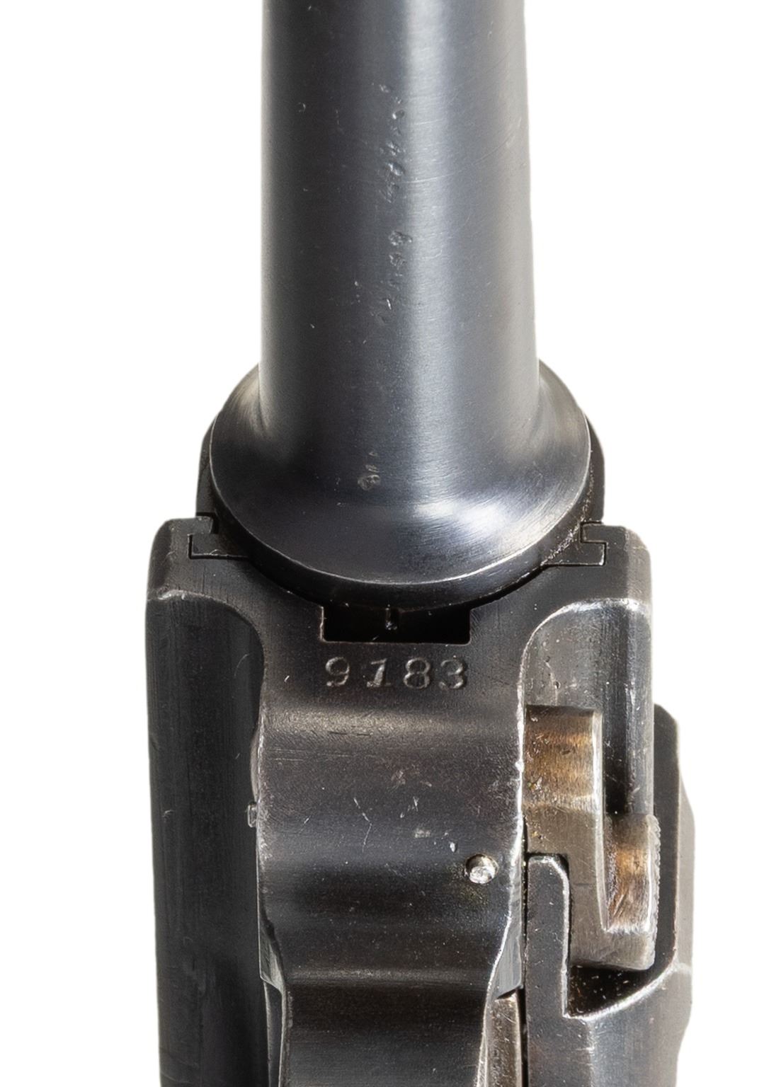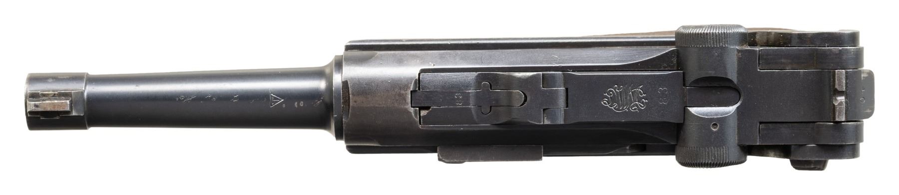 Cal. 30 Luger. S# 9183. Bbl. 3 15/16". Looking to update their current military sidearm and being unsatisfied with the domestically designed Ahlberg pistol, the Finnish Ministry of Defense went to DWM in hopes of acquiring a contract for the P.08 pistol. DWM, unable to to fulfill this request due to the Treaty of Versailles, could only offer Finland the Model 1920 Commercial Luger chambered in 7.65x21mm Parabellum (.30 Luger). Ultimately, the Finnish Ministry of Defense accepted these Lugers, designating them as the "M/23", with a small number being rebarreled for the 9x19mm cartridge. This example, an M/23 Luger, exhibits no commercial proofing, with only the DWM monogram present on the toggle. Rear grip strap is unit marked "PRI GARDEN CITY KS/ P08 30 LUGER GERMANY" on the sides of the stock lug. The top of the Finnish replacement bbl. is marked with the Tikka arsenal insignia towards the breech. Metal components exhibit a Finnish arsenal reapplied blue finish, with some small parts exhibiting a reheated straw finish. Frame is mounted with 2-piece checkered wood grips, retained via a Finnish brass replacement screw on either panel. Dovetailed Lahti pattern blade front sight with fixed rear sight modified into a U-notch configuration. Nearly all numbers are matching and include the frame, takedown lever, sideplate, trigger, safety lever & bar, bbl. extension, trigger bar, breechblock, extractor, firing pin and forward toggle link. Hold-open latch, rear toggle link, and grips are mismatched. MAGS: 1 8-rd. with unmarked aluminum plug. Plug has been ground down around edges. Spine of mag. is marked "4748". CONDITION: metal components retain the majority of their Finnish arsenal blue finish, exhibiting areas of wear and thinning fading to gray patina, scattered superficial handling marks, as well as some pitting beneath the finish overall. Strawed parts exhibit some wear fading to gray patina, with purple heat related coloration present in some areas. Bore is bright, exhibiting streaks of light to mild pitting, while retaining strong rifling throughout. Proper manual mechanics. Breechblock is chipped at the forward corner along the edge of the extractor. Left grip shows moderate smoothing and scattered handling marks, with a chip at the usual area, at and to the right of the safety lever. Right grip panel shows mild smoothing and some minor superficial handling marks. Mag. does not function properly and does not engage the hold-open latch. (25-6081/MLW). 800-1,400.