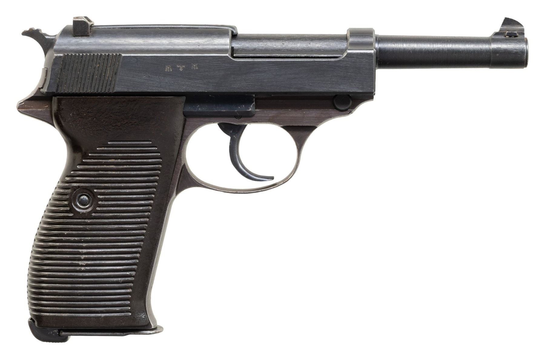 SEMI-AUTOMATIC PISTOL. Cal. 9mm Luger. S# 305L. Bbl. 4 7/8". P.38 semi-automatic pistol mfg. by Walther in 1944. Left side of the slide is marked "P.38", followed by the S#, as well as Walther's mfg. code and the 2-digit year of mfg. "ac 44", with 2 Walther Eagle/359 proofs and an eagle firing proof marked on the right. Left side of frame is marked with a Walther Eagle/359 proof. Underside of bbl. lug is marked "fnh" (indicating 1 of only 8,000 bbls. mfg. by Bomische Waffenfabriken Prague's Strakonice plant delivered to Walther in 1944), with a Prague Strakonice Eagle/WaA76 marked on the left. Metal components exhibit a salt blue finish overall. Frame is mounted with 2-piece grooved brown pressed resin grips. Standard dovetailed blade front sight and U-notch rear sight. All serialized parts are matching and include the frame, slide, bbl., and locking block. MAGS: 1 blued steel mag. marked with a Mauser Eagle/135 proof on the spine. CONDITION: metal components retain the majority of their original arsenal blue finish, exhibiting some spots of light edge wear, with some scattered spots of light surface oxidation present on the firing pin / indicator cover. Front grip strap exhibits wear and thinning that has faded to a gray patina, as well as some spots of light surface oxidation. Mirror bore, retaining well defined rifling throughout. Proper manual mechanics, to include the safety / decocking lever. Grips are very good, showing some superficial handling marks overall, with some small chips present along the edges of the grooves on the right panel. (25-5627/MLW). CURIO. $700-1,100.