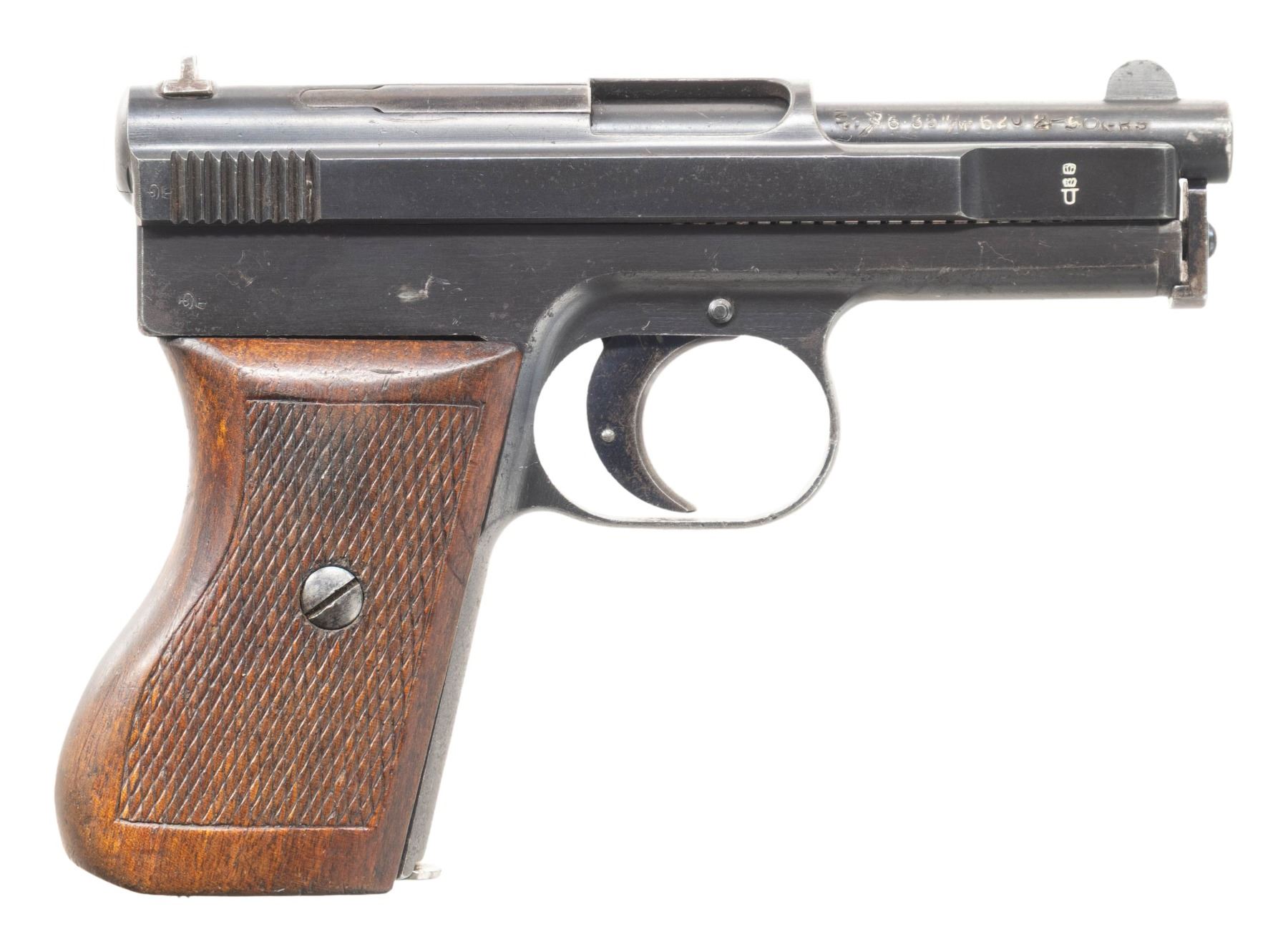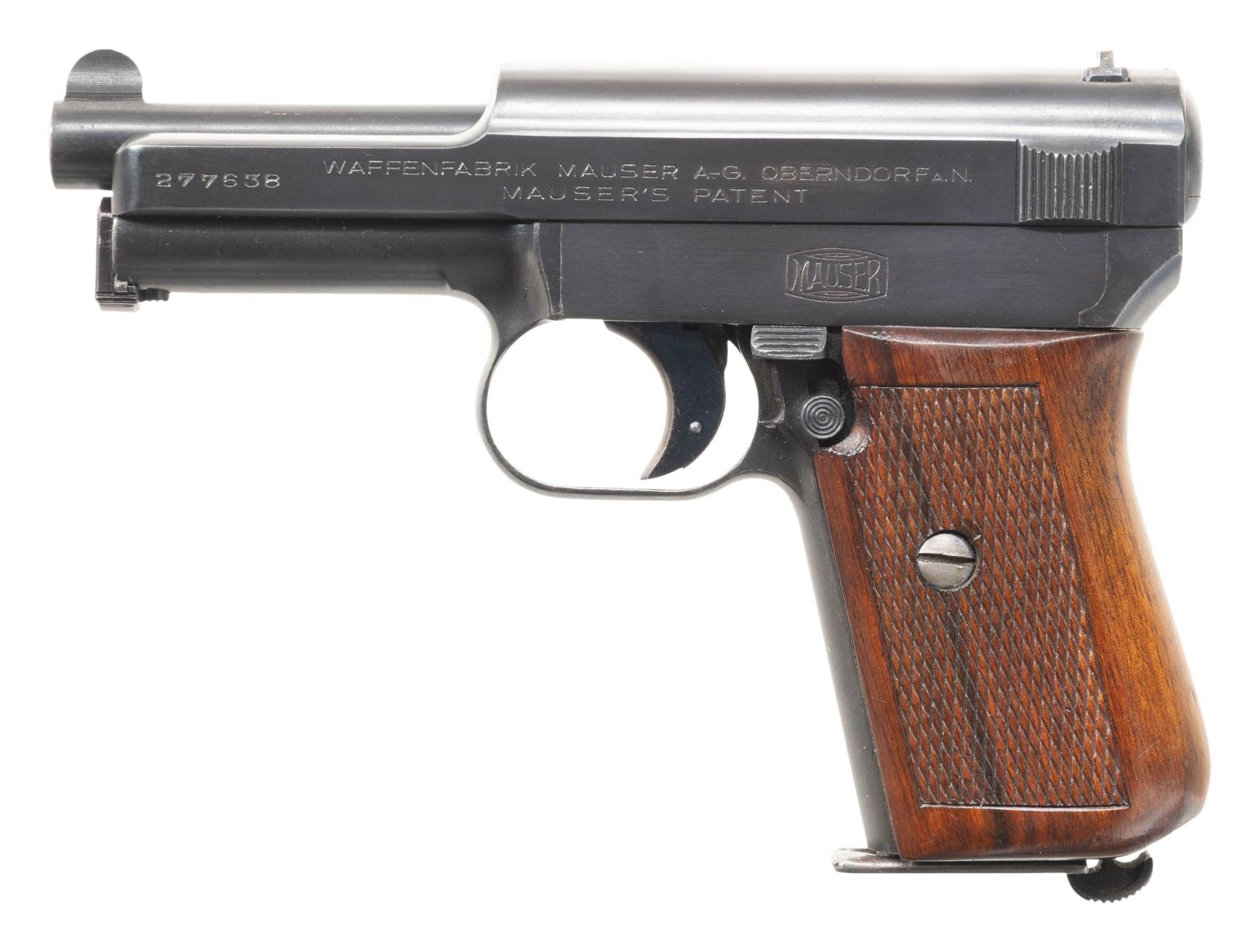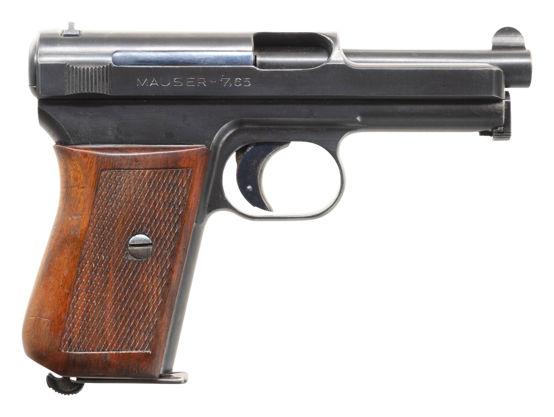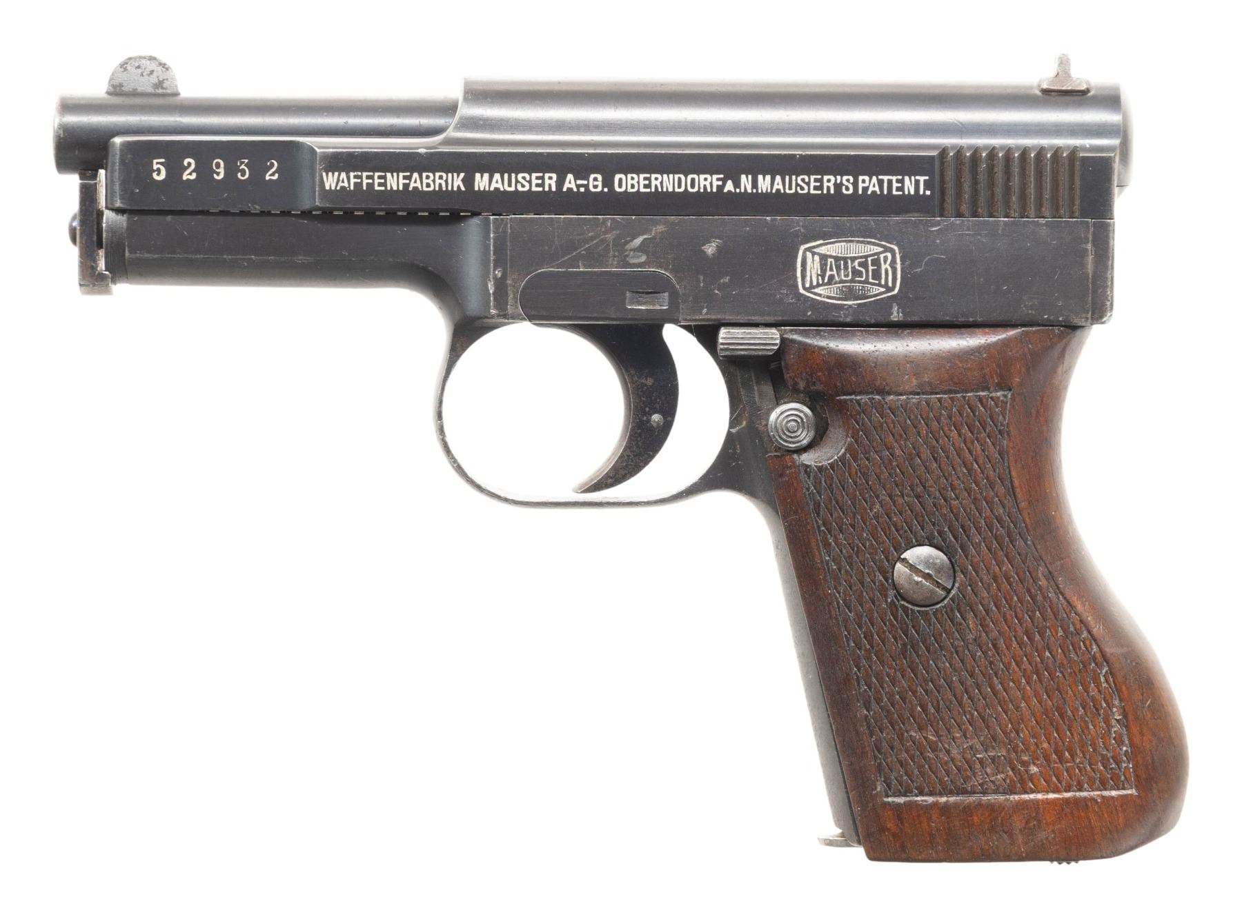 SEMI-AUTOMATIC PISTOLS. 1) MAUSER MODEL 1914 SEMI-AUTOMATIC PISTOL. Cal. 7.65mm S# 277638. Bbl. 3 3/8". Model 1914 semi-automatic pistol mfg. by Mauser. Left side of the slide is marked with the S#, followed by Mauser's mfg. information, with "MAUSER - 7,65" marked on the right. Sideplate is marked with the Mauser banner logo. Metal components exhibit a blue finish overall, save for on the trigger, extractor, and heel mag. release which exhibit a nitre blue finish. Frame is mounted with a 1-piece flat checkered wood wrap around grip. Standard fixed half-moon blade front sight and dovetailed U-notch rear sight. All serialized parts are matching and include the frame, sideplate, slide, and bbl. MAGS: 1 8-rd. CONDITION: very good, with metal components retaining the vast majority of their original factory blue finish, exhibiting some spots of light wear, some superficial handling marks, as well as some scattered spots of light surface oxidation. Front grip strap exhibits consistent light surface oxidation. Bright bore, exhibiting light pitting, while retaining well defined rifling throughout. Grip shows some superficial marks and minor impressions from handling and storage, but otherwise remains very good overall. (25-5361/MLW). 2) MAUSER MODEL 1910 SIDE LATCH SEMI-AUTOMATIC PISTOL. Cal. 6.35mm (.25 ACP). S# 52932. Bbl. 3 1/8". Model 1910 Side Latch semi-automatic pistol mfg. by Mauser. Left side of the slide is marked with the S#, followed by Mauser's mfg. information, with a small British Crown/GP proof and a German double crowned "U" proof marked on the right. Sideplate is marked with the Mauser banner logo. Right side of the bbl. exhibits a string of British proofs. Metal components exhibit a blue finish overall, save for on the trigger, extractor, and heel mag. release, which are nitre blued. Frame is mounted with a 1-piece flat checkered wood wrap around grip. Fixed half-moon blade front sight and dovetailed V-notch rear sight. All serialized parts are matching and include the frame, sideplate (interior), slide, and bbl. MAGS: 1 unidentified approx. 9-rd. CONDITION: metal components retain the majority of their original factory blue finish, showing some light wear, scattered superficial handling marks, as well as scattered spots and patches of light to mild surface oxidation and pitting present overall. Bore exhibits consistent mild to moderate pitting, while retaining strong rifling throughout. Proper manual mechanics. Grip shows some scattered marks from handling and storage, but otherwise remains sound. (25-5423/MLW). BOTH CURIO. $600-900.