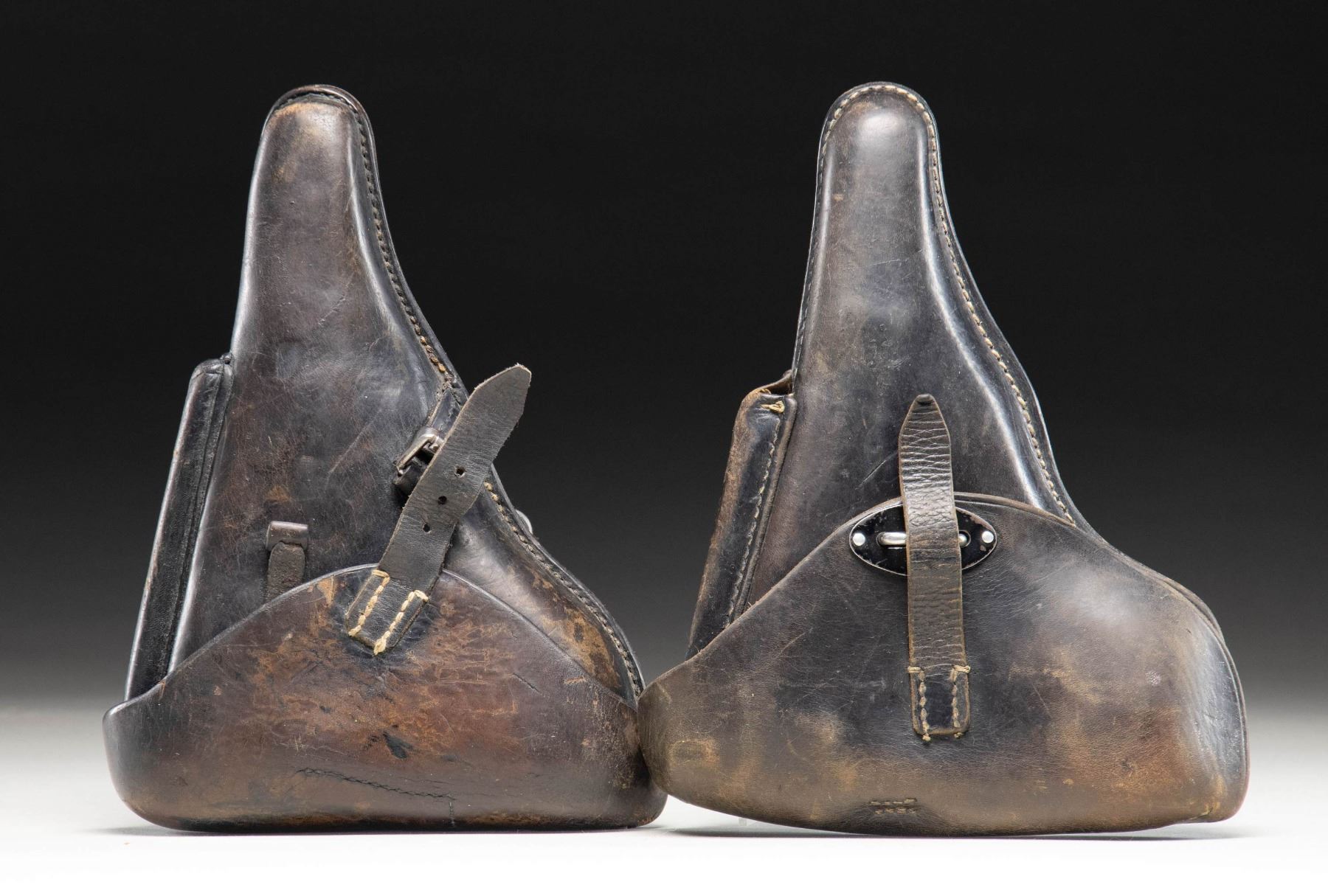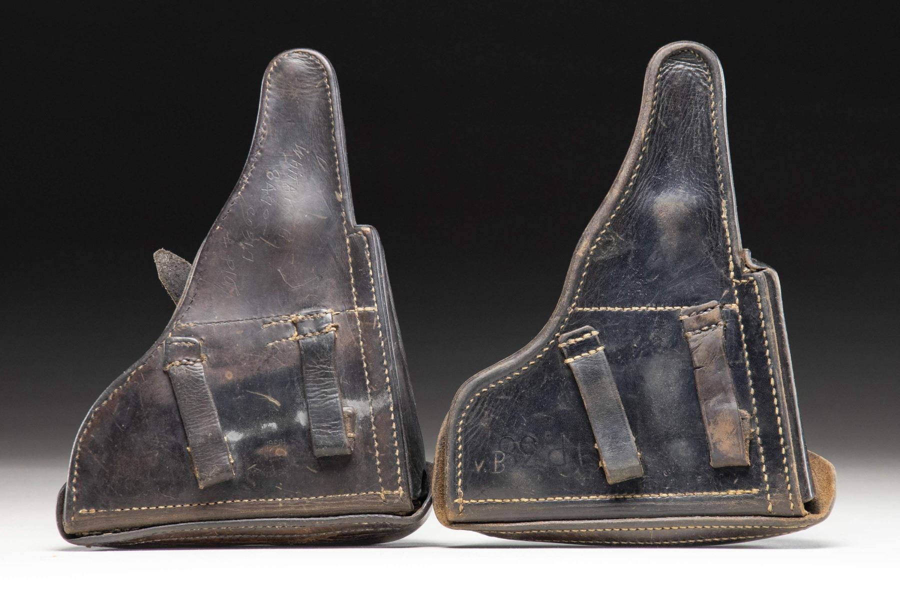 Lot consists of: 1) Brown leather P.08 Luger pistol holster mfg. by Hans Romer in 1936. Rear of holster is marked "HANS ROMER/ NEU-ULM/ 1936" between the belt loops, with a partially legible apparent U.S.G.I. "WHITA/ 8490/ CO.317/ 4. PLOT" marked towards the toe. Spare mag. and loading tool are absent. CONDITION: holster remains malleable, exhibiting general overall wear, with areas of age related cracking and crazing. Stitching remains tight and intact. 2) Brown leather P.38 pistol holster mfg. by Moritz Stecher Lederwerk in 1942. Rear of the holster is marked with Moritz' mfg. code "jwa", followed by an Eagle/WaA300 proof, the 2-digit year of mfg. "42", "P.38", and a small hand inscribed upside down "v.B". Spare mag. is absent. CONDITION: holster remains malleable, exhibiting general overall wear, with areas of light to mild age related cracking and crazing. Stitching on base of mag. pouch is absent. PROVENANCE: Estate Collection of John "Jack" Dhooghe. (02-25589/MLW). NON-GUN. $300-500.
