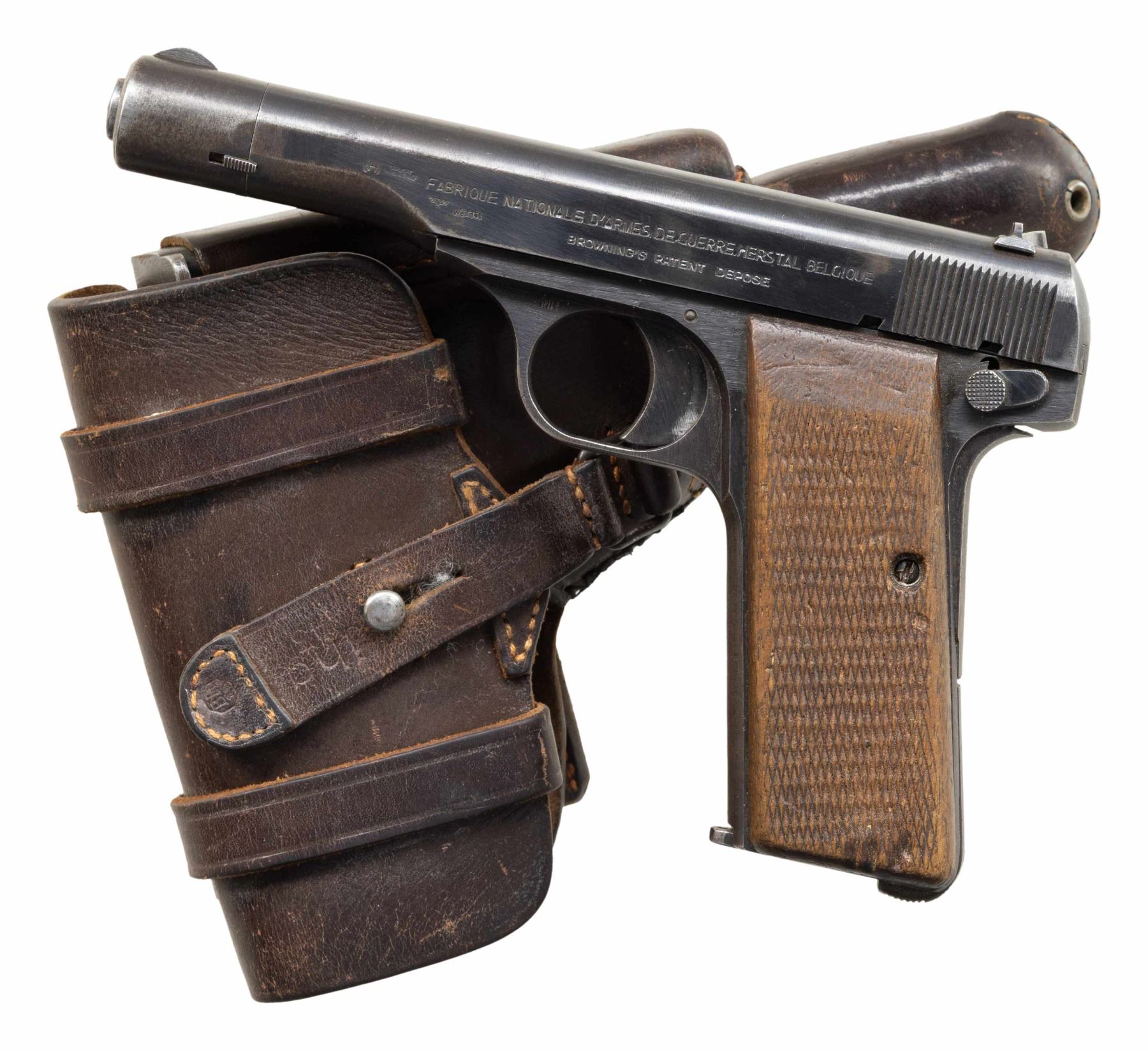 SEMI-AUTOMATIC PISTOL WITH HOLSTER. Cal. 7.65mm. S# 11232b. Bbl. 4 7/16". Model 1922 semi-automatic pistol mfg. by Fabrique Nationale while under German occupation between May to December of 1943. Left side of the slide is marked "FABRIQUE NATIONALE D'ARMES DE GUERRE HERSTAL BELGIQUE/ BROWNING'S PATENT DEPOSE", as well as with an "(H)" (Heer), eagle firing proof, and 2 Eagle/WaA140 proofs. Metal components exhibit a blue finish overall, save for on the bbl., which is polished in-the-white. Frame is mounted with 2-piece checkered wood grips. Standard fixed half-moon blade front sight on slide extension and dovetailed V-notch rear sight. All serialized parts are matching and include the frame, slide (interior), slide extension, as well as the bbl. MAGS: 2 9-rd. UNATTACHED ACCESSORIES: brown leather holster marked "jhg/ 43" (Gustav Genschow & Co.) on the closure flap strap. CONDITION: metal components retain large amounts of their original arsenal blue finish, exhibiting areas of wear and thinning that are fading to gray and brown patinas, scattered spots of light surface oxidation, as well as some spots of light pitting overall. Bright bore, exhibiting scattered spots of light to mild pitting, while retaining strong rifling throughout. Proper manual mechanics. Grips show smoothing and scattered marks from handling and storage, with several impressions present on the bottom of the left panel. Holster remains malleable, exhibiting general overall wear, with some light to mild age related cracking and crazing. (25-6160/MLW). CURIO. $700-1,000.