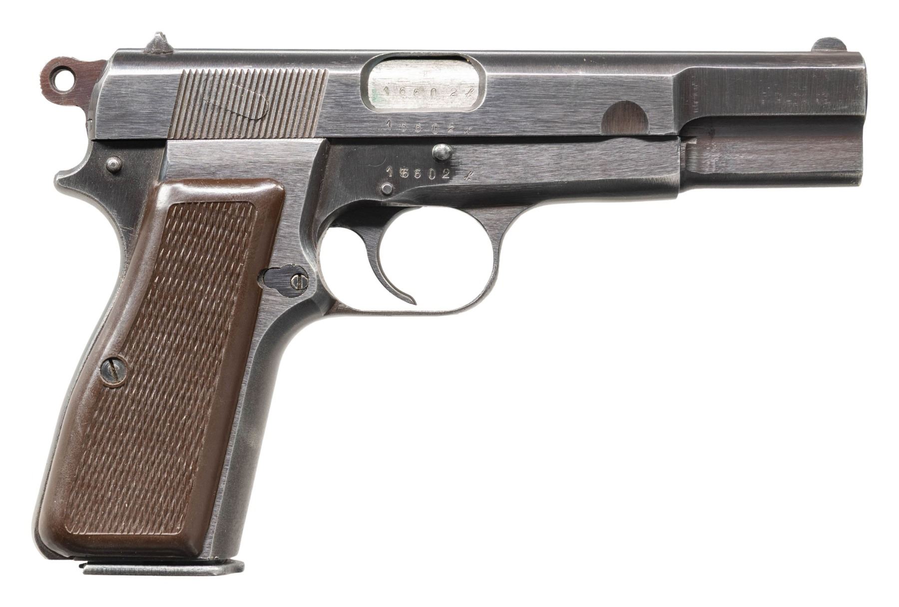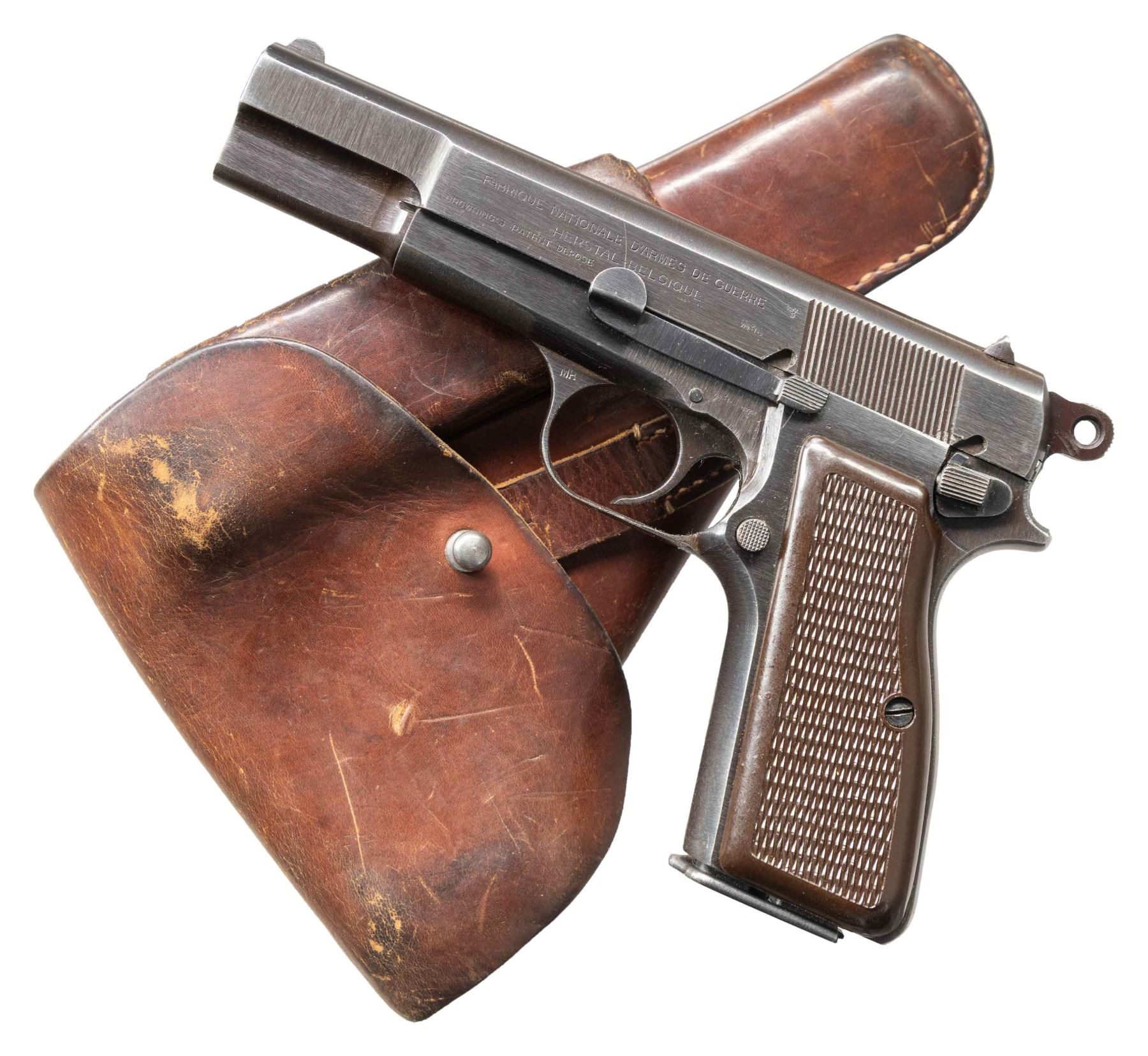 HIGH POWER SEMI-AUTOMATIC PISTOL WITH HOLSTER. Cal. 9mm Luger. S# 16602b. Bbl. 4 5/8". High Power semi-automatic pistol mfg. by Fabrique Nationale while under German occupation between January - August of 1944. Left side of the slide is marked "FABRIQUE NATIONALE D'ARMES DE GUERRE/ HERSTAL - BELGIQUE/ BROWNING'S PATENT DEPOSE", followed by an eagle firing proof and an Eagle/WaA140 proof (repeated on left side of frame). Left side of the forward trigger guard web is stamped "MR". Left side of the bbl. is marked with 2 Eagle/WaA140 proofs, with an eagle firing proof marked on the right. Metal components exhibit a blue finish overall, save for on the bbl., which is polished in-the-white. Frame is mounted with 2-piece checkered brown bakelite grips. Thumbprint slide features a fixed half-moon blade front sight and dovetailed U-notch rear sight. All serialized parts are matching in the "stacked" fashion, and include the frame, slide, and bbl. MAGS: 2 non-WaA proofed WWII production blued steel 13-rd. mags with split tail floorplates. UNATTACHED ACCESSORIES: correct period brown leather holster, marked with an illegible name in black ink on the interior of the closure flap. CONDITION: metal components retain the majority of their original arsenal blue finish, exhibiting some light to mild edge wear, some scattered superficial handling marks, as well as some scattered spots of light surface oxidation overall. Grip straps exhibit light thinning, with scattered spots of light surface oxidation. Near mirror bore, exhibiting some scattered spots of light pitting, while retaining well defined rifling throughout. Proper manual mechanics. Grips are very good overall. Holster remains malleable, exhibiting scattered marks from handling and storage, as well as some scattered spots/areas of age related cracking and crazing. PROVENANCE: Estate Collection of John "Jack" Dhooghe. (25-5520/MLW). CURIO. $1,200-1,800.