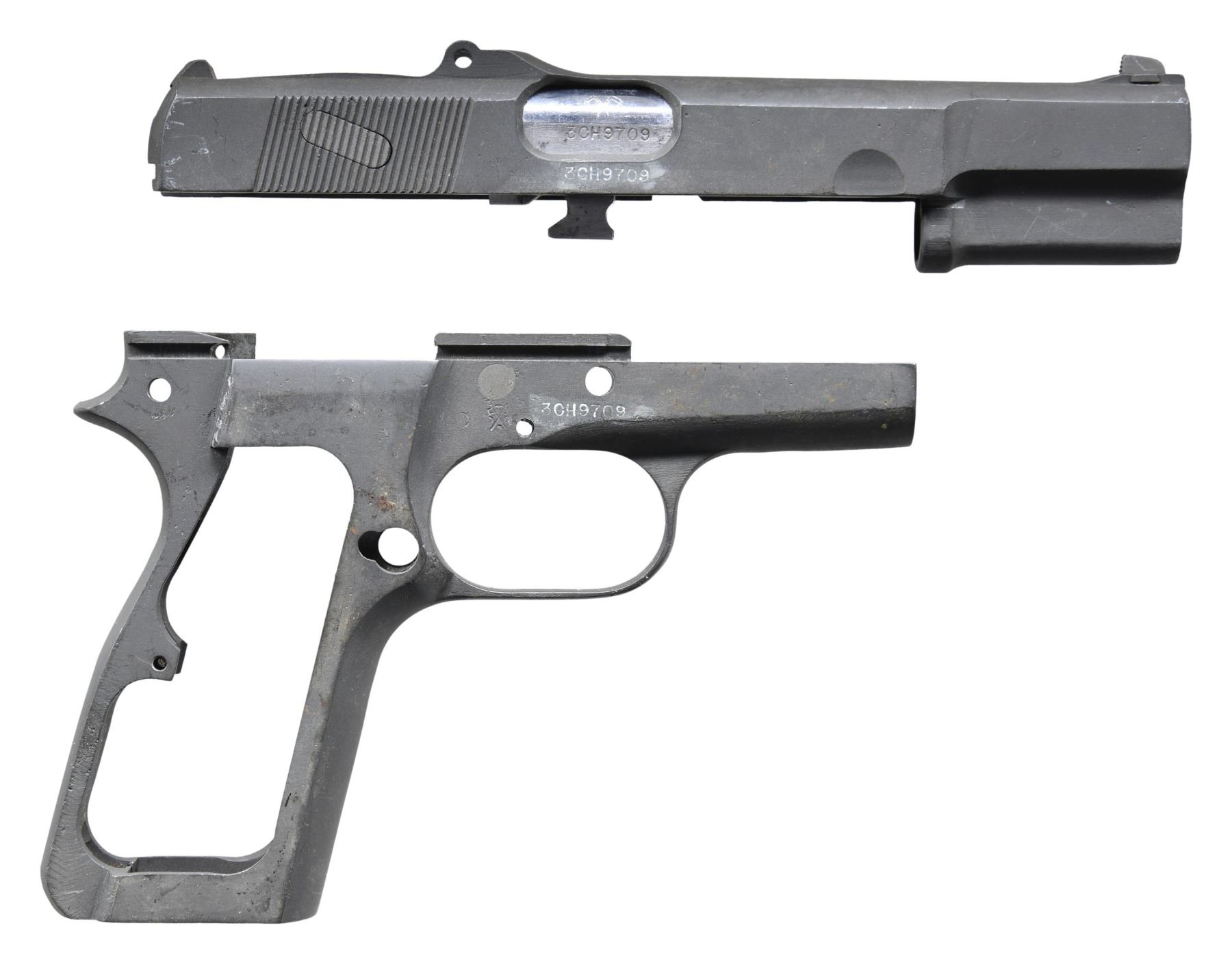 SLIDE, & BARREL. Cal. 9mm Luger. S# 3CH9709. Bbl. 4 5/8". MK.I* semi-automatic pistol frame, slide, and bbl. mfg. by Inglis under contract for China. The left side of the slide is marked "MK.I*" above "BROWNING FN 9MM HP" and "INGLIS CANADA". Right side of the frame and bbl. exhibit Canadian proofing. Frame and slide a reapplied parkerized finish, with the bbl. being polished in-the-white. Muzzle crown has been ground flat. Dovetailed blade front sight. All serialized parts are matching and include the frame, slide, and bbl. Frame is completely stripped, with the slide's tangent rear sight being absent. CONDITION: metal components retain large amounts to the majority of their reapplied parkerized finish, exhibiting some areas of light to mild wear and thinning (primarily on edges), scattered superficial handling marks, and some spots of pitting beneath the finish overall. Very bright bore, exhibiting scattered areas of light to mild pitting, while retaining well defined rifling throughout. (25-469/MLW). MODERN. $300-500.