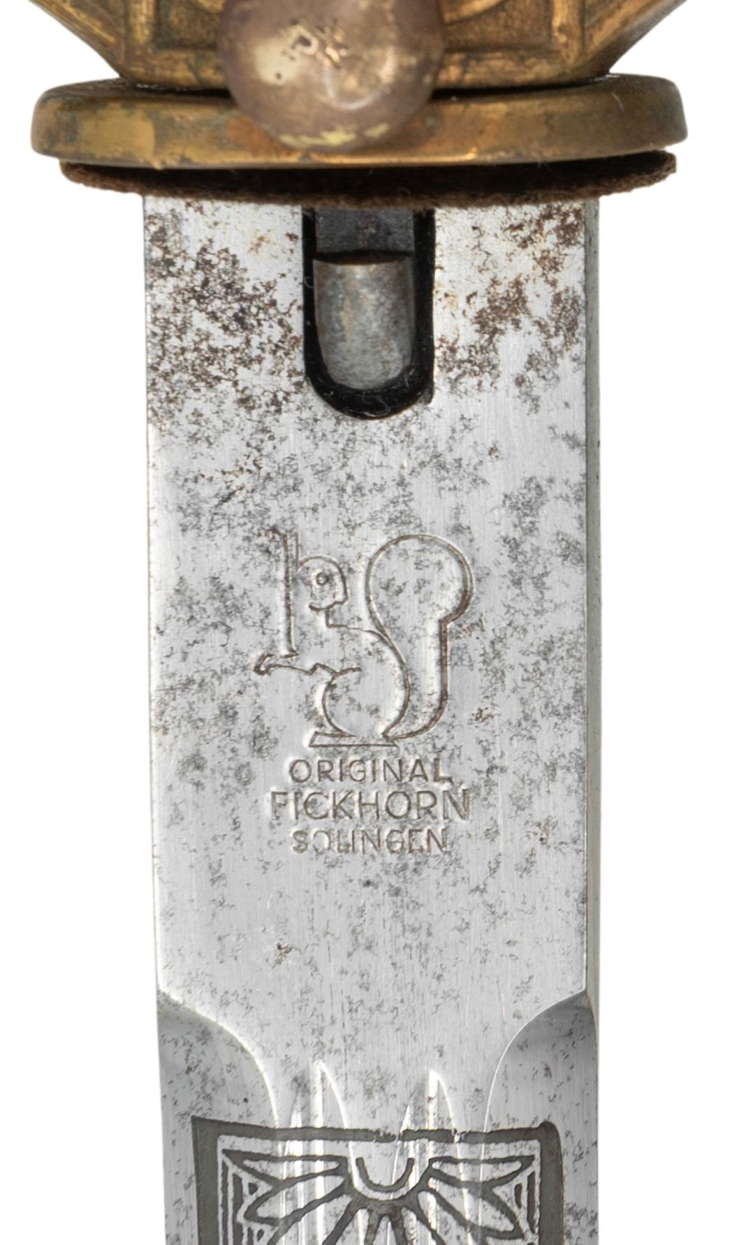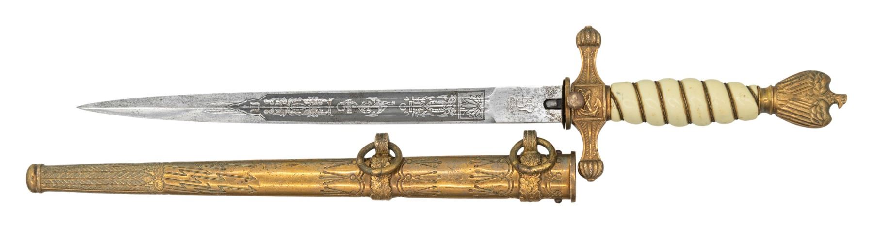 A very good WWII German Navy dagger measuring 16 5/8" overall with an etched blade that includes foliate and nautical motifs. The blade is marked "(logo) ORIGINAL EICKHORN SOLINGEN" with the 1941-42 mark. Gilded brass hilt with an anchor on the crossguard and a fully articulated eagle pommel. Wire wrapped cream colored grip, Gilded brass scabbard with the lightning bolt motif. CONDITION: blade shoes original factory polish with some very minor staining. Hilt show slight wear to the gilded finish and the grip is undamaged. Scabbard is nice with only one very shallow dent. (02-26158/BF). NON-GUN. $700-900.