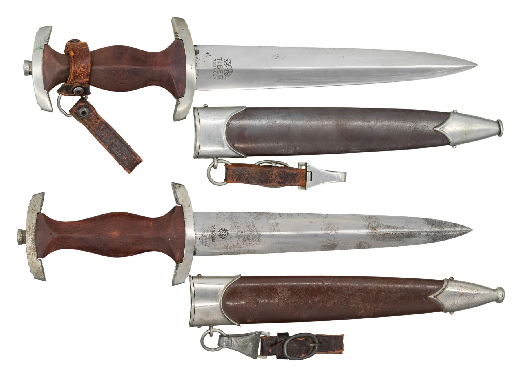 1) This SA dagger measures 15" overall with a blade that is etched "Alles fur Deutchland" and marked "RZM M7/42" indicating manufacture by WKC-Waffenfabrik GmbH of Solingen-Wald. Plated cross guard and pommel guard. Brown wooden grip with inset enamel SA button and eagle. Brown anodized scabbard with plated mounts and original hanger. CONDITION: blade shows scattered darkened areas. The dagger and scabbard mounts show oxidation and minor finish loss. Grip shows light wear with a few dings. Scabbard has oxidation to scattered areas of the body and the hanger is solid. 2) SA dagger measures 14 1/2" overall with a blade that is etched "Alles fur Deutchland" and marked "(logo) TIGER SOLINGEN". Nickel silver cross guard and pommel guard. Brown wooden grip with inset enamel SA button and eagle. Brown anodized scabbard with plated mounts and original hanger. CONDITION: blade shows just a few scattered dark spots. The dagger and scabbard mounts have good finish but the scabbard ball tip is crushed. Grip shows light wear with a few dings. Scabbard has light overall wear and the hanger is well used. (02-26117/BF). NON-GUN. $600-900.