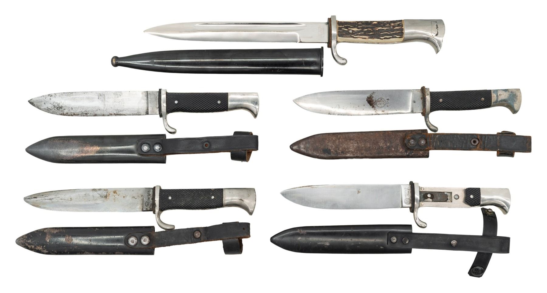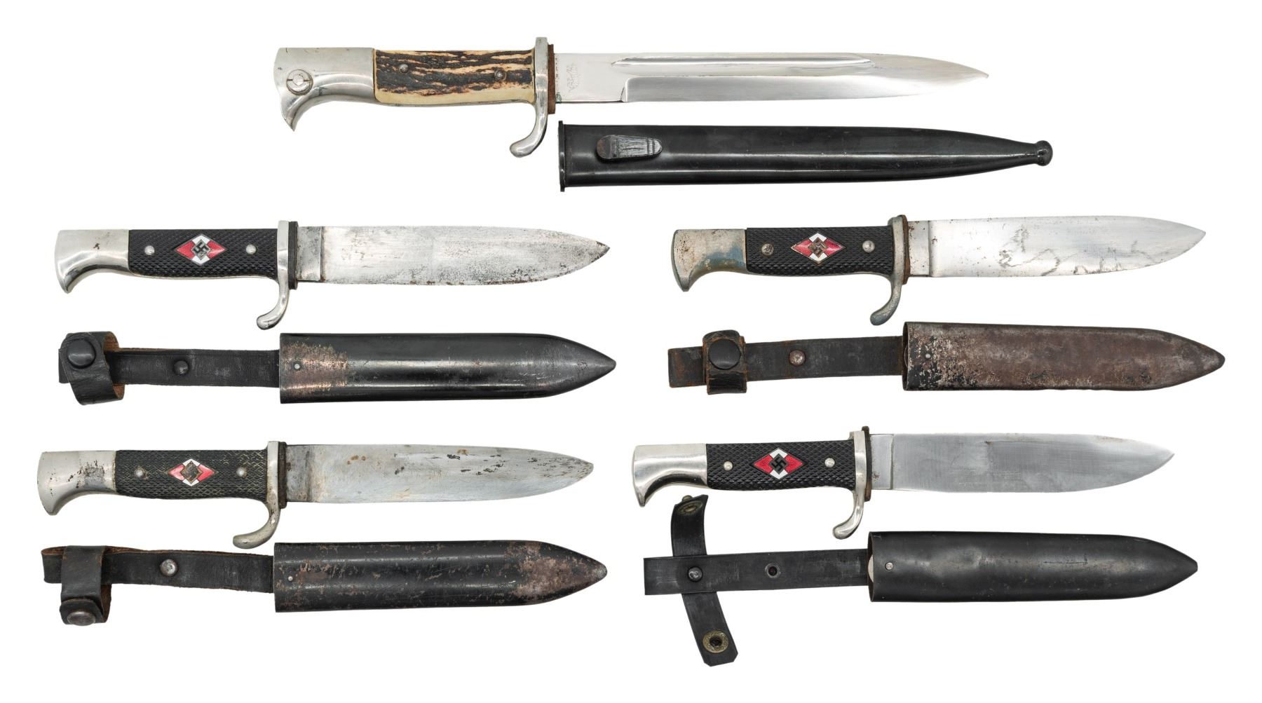 1) WWII German HJ side knife measuring 10 1/4" overall with a plain blade marked "RZM M7/13". Plated hilt with stylized bird's head pommel. 2 piece black cross hatched grips with an inset HJ diamond on the front. Black enameled steel scabbard with leather belt loop. CONDITION: blade shows some sharpening and does not fit in the scabbard well. Hilt shows light wear. Scabbard retains 85% finish and the belt loop is solid. 2) WWII German HJ side knife measuring 10" overall with a plain blade marked "RZM M7/5". Plated hilt with stylized bird's head pommel. 2 piece black cross hatched grips with an inset HJ diamond on the front. Black enameled steel scabbard with leather belt loop. CONDITION: blade shows heavy sharpening and a blunt tip. Hilt shows light wear. Scabbard retains 75% finish and the belt loop is solid. 3) WWII German HJ side knife measuring 10 1/4" overall with a plain blade marked "RZM M7/8". Plated hilt with stylized bird's head pommel. 2 piece black cross hatched grips with an inset HJ diamond on the front. Black enameled steel scabbard with leather belt loop. CONDITION: blade shows light sharpening. Hilt shows moderate wear. Scabbard retains 20% finish and the belt loop is solid. 4) WWII German HJ side knife measuring 10" overall with a plain blade marked "RZM M7/42 1942". Plated hilt with stylized bird's head pommel. 2 piece black cross hatched grips with an inset HJ diamond on the front. Black enameled steel scabbard with plastic belt loop. CONDITION: blade shows no sharpening. Hilt shows nearly no wear but the back grip is missing. Scabbard retains 98% finish and the belt loop is very solid. 5) WWII German dress bayont measuring 13 3/4" overall with a plain single fullered blade marked "(tiger logo)" and "TIGER SOLINGEN". Plated hilt with bird's head effigy pommel and 2-piece stag grips. Black enameled iron scabbard. CONDITION: light wear overall. (02-26154/BF). NON-GUN. $1,000-1,400.