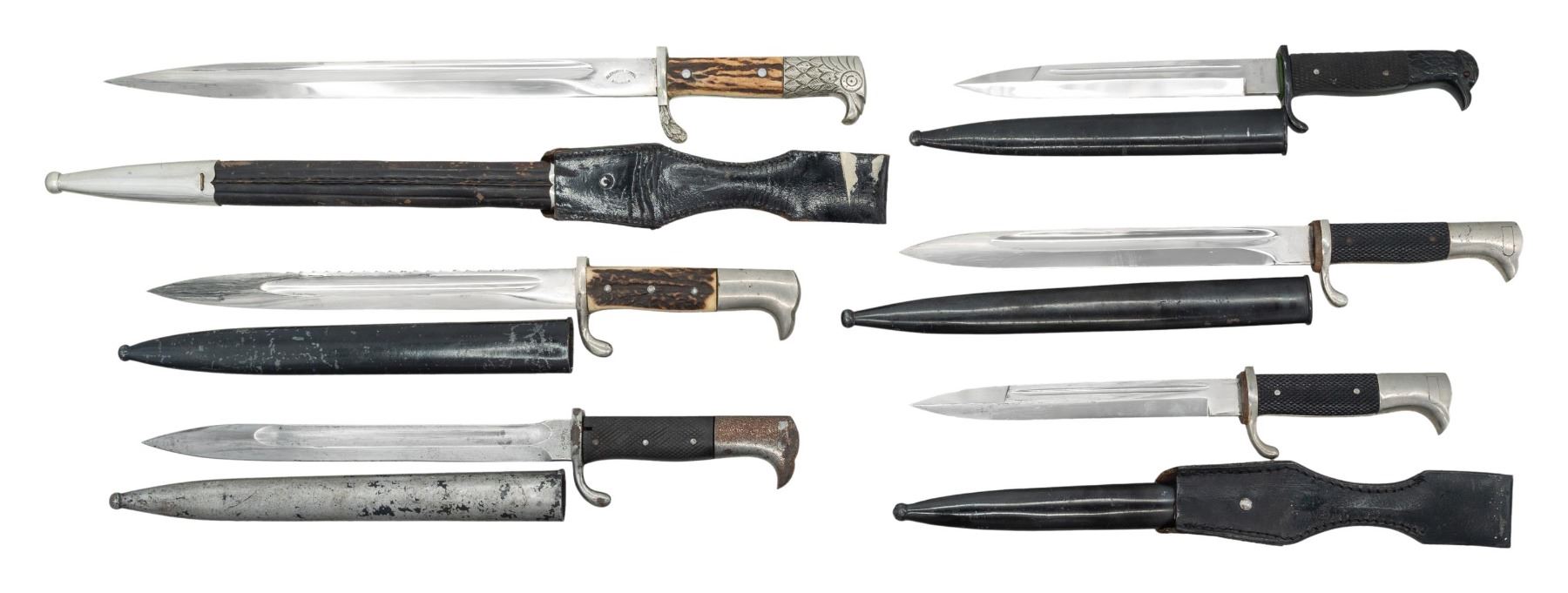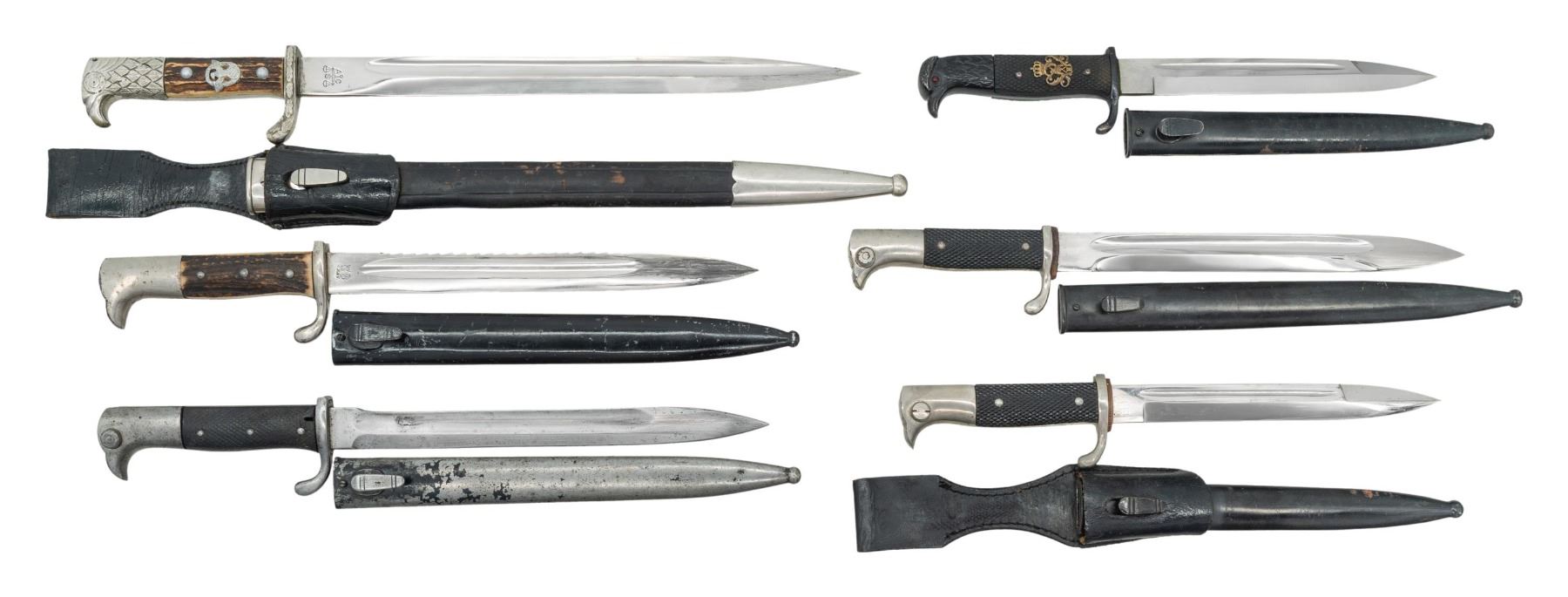 This lot consists of the following: 1) Alex Coppel German Dress Bayonet. One side of blade has scale logo & other Alex Coppel name & logo. Pommel & crossguard have leaf engraving. Bone grips with party eagle & symbol. Leather scabbard & frog present. CONDITION: leather shows scattered crazing, denting & flaking. Metal parts & handles very good overall. 2) CG Haenel Dress Bayonet. 1914 dated blade. Black rubber grip panels. Scabbard present. CONDITION: blade shows scattered edge wear & oxidation. Other metal parts of bayonet show overall oxidation & flaking. Grips show heavy checkering wear with some cracks. Scabbard shows overall flaking black paint with some oxidation. 3) Eickhorn Dress Bayonet. Blade has Eickhorn marking & logo. Nickel finish. Checkered black handles. Metal scabbard present. CONDITION: metal shows scattered moderate flaking & oxidation. Handles show checkering & handling wear. Scabbard shows scattered flaking with some oxidation. 4) WW1 German Dress Bayonet. Blade marked "GES GESCH". Grips have Saxon cipher. Pommel has eagle shape. Black scabbard. CONDITION: metal of bayonet & scabbard show scattered flaking with some oxidation. Grip panels show staining & light handling wear. 5) FW Holler Dress bayonet. Blade has FW Holler logo. Leather frog & steel scabbard present. CONDITION: metal parts of bayonet show light flaking & oxidation. Leather frog shows crazing & flaking. Scabbard shows light flaking, dings & oxidation. 6) WK&G Dress Bayonet. Sawback blade WK&G trademark. Bone grips panels. Scabbard present. CONDITION: metal parts of bayonet show scattered flaking & oxidation. Grips show light wear. Scabbard shows scattered flaking & oxidation. (02-25778/MJC). $700-1,000 for lot.