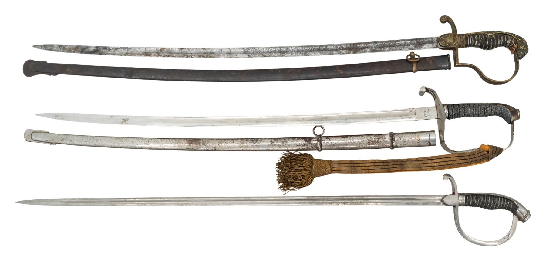 1) Bavarian officer's sword measuring 38 1/2" overall with an etched double fullered blade marked "(logo) W. K. & C." at the ricasso and "JOS. VIERHEILIGS NACHE" on the spine. The etcheing on the blade includes foliate motifs with "In Treue Fest" on each side. Plated hilt with a wire wrapped sharkskin grip and a canted pommel. No scabbard. CONDITION: light wear throughout. 2) German lion head saber measuring 38 1/4" overall with a blade etched with foliate motifs and a ricasso mark that reads "(logo) W. K. & C.". Ornate brass hilt with crossed arms on the langet and a well done lion head pommel. Wire wrapped leather grip with a brass mounted iron scabbard. CONDITION: blade has a gray finish with oxidation. Hilt shows wear and heavy tarnish to the brass. Grip has minor damage and the wire is displaced. Scabbard is quite solid but has a uniformly oxidized finish. 3) Imperial German saber measuring 37 1/4" overall with a plain blade marked "WEYERSBERG KIRSCHBAUM SOLINGEN". Plated steel hilt with wire wrapped sharkskin grip and an elaborate gold bullion Prussian sword knot. Plated steel scabbard. CONDITION: blade has a gray patina and the hilt shows light wear. Grip is intact with light wear and the knot is just a bid tattered. Scabbard shows some loss of finish. (02-25312/BF). NON-GUN. $400-600.