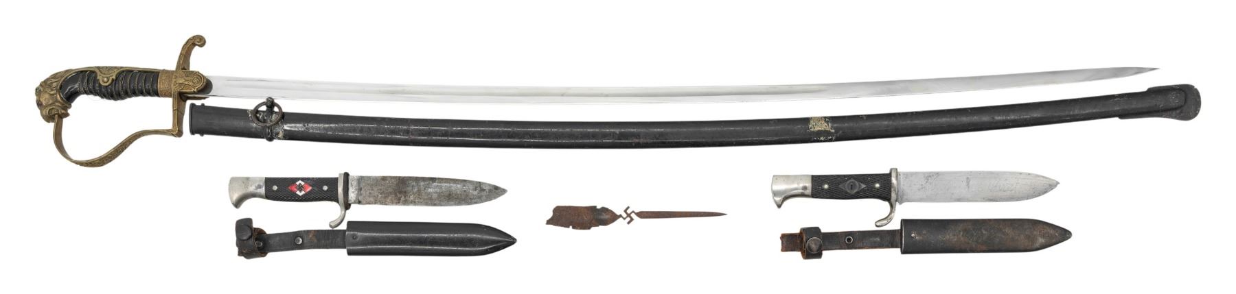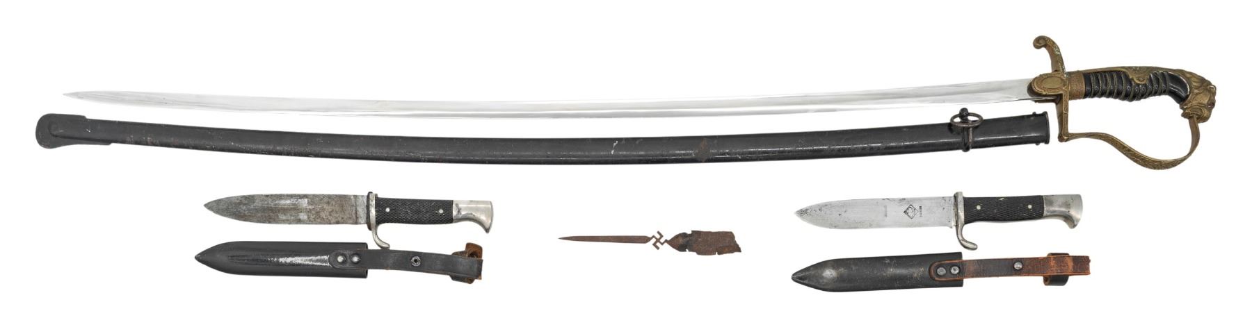 1) WWII German Army officer's sword measuring 39 1/4" overall with a plain blade marked "E. & F. HORSTER (logo) SOLINGEN". Gilded brass hilt with reverse P knuckle bow and a spread wing eagle above wreath on the langet. Nice lion head pommel with "ruby" eyes. Wire wrapped black composite grip with black enameled steel scabbard. CONDITION: blade has substantial original factory polish. Hilt shows moderate wear with only a trace of gilding remaining. Scabbard finish is about 80% intact. 2) WWII German HJ side knife measuring 10 1/4" overall with a plain blade etched "Blut und Ehre" that is marked "(logo) PUMA SOLINGEN". Plated hilt with stylized bird's head pommel. 2 piece black cross hatched grips with a missing HJ diamond on the front. Black enameled steel scabbard with leather belt loop. CONDITION: blade shows very minor sharpening and the motto is quite light but legible. Hilt shows light wear but is missing diamond. Scabbard retains some finish and the belt loop is solid. 3) WWII German HJ side knife measuring 10" overall with a plain blade that is unmarked. Plated hilt with stylized bird's head pommel. 2 piece black cross hatched grips with an inset HJ diamond on the front. Black enameled steel scabbard with leather belt loop. CONDITION: blade shows heavy sharpening. Hilt shows light wear. Scabbard retains 95% finish and the belt loop is solid. 4) A small 6 1/4" iron letter opener made from a piece of bomb shrapnel. opener has a Party symbol and a 3" blade. CONDITION: oxidized finish. (02-25795/BF). NON-GUN. $600-800.