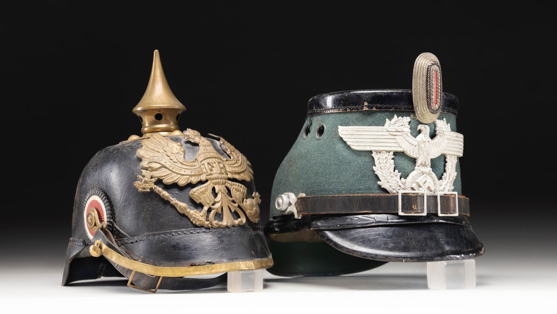 1) WWI German Prussian Infantry brass trimmed spike helmet. The spike, base, front plate, side post, visor trim, spine, and chin strap ends are all brass. There is a national cockade on the right and the left cockade and side post are missing. CONDITION: helmet is relatively solid with no extra holes. The brass has a rich patina and is undamaged. The visor trim is loose and the liner is a bit worn. 2) A good WWII German green felt covered black leather trimmed Police shakp. The front has a large aluminum Police eagle and the side posts are also aluminum. Complete chinstrap and elongated cockade at the top front. Tan leather sweatband. CONDITION: shako has a good look with light wear. The vent screens on the right side are missing. Interior foam under the sweatband is deteriorated. (02-25447/BF). NON-GUN. $600-900.