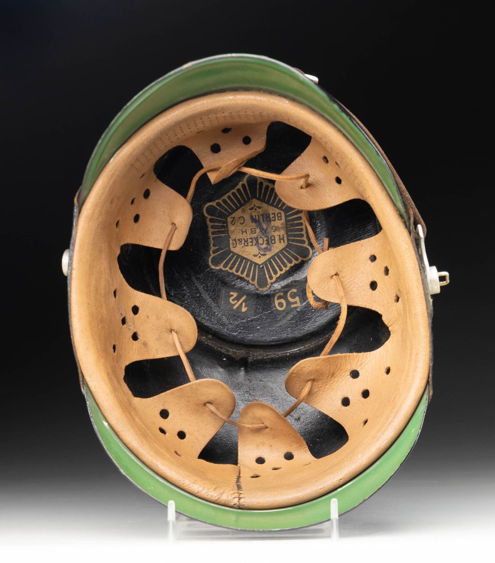 This well worn WWII German Police shako has a green felt body with a black leather trim. Large Police eagle front plate and metal cockade at the top of the front. Complete chinstrap. 8 tongue brown leather liner. The interior is marked " H. BECKER & Co G. M. B. H. BERLIN C 2 ". CONDITION: the felt has a few noticeable moth nips and the leather is in good shape. The cockade is a bit banged up. Markings clear. (02-25336/BF). NON-GUN. $400-600.