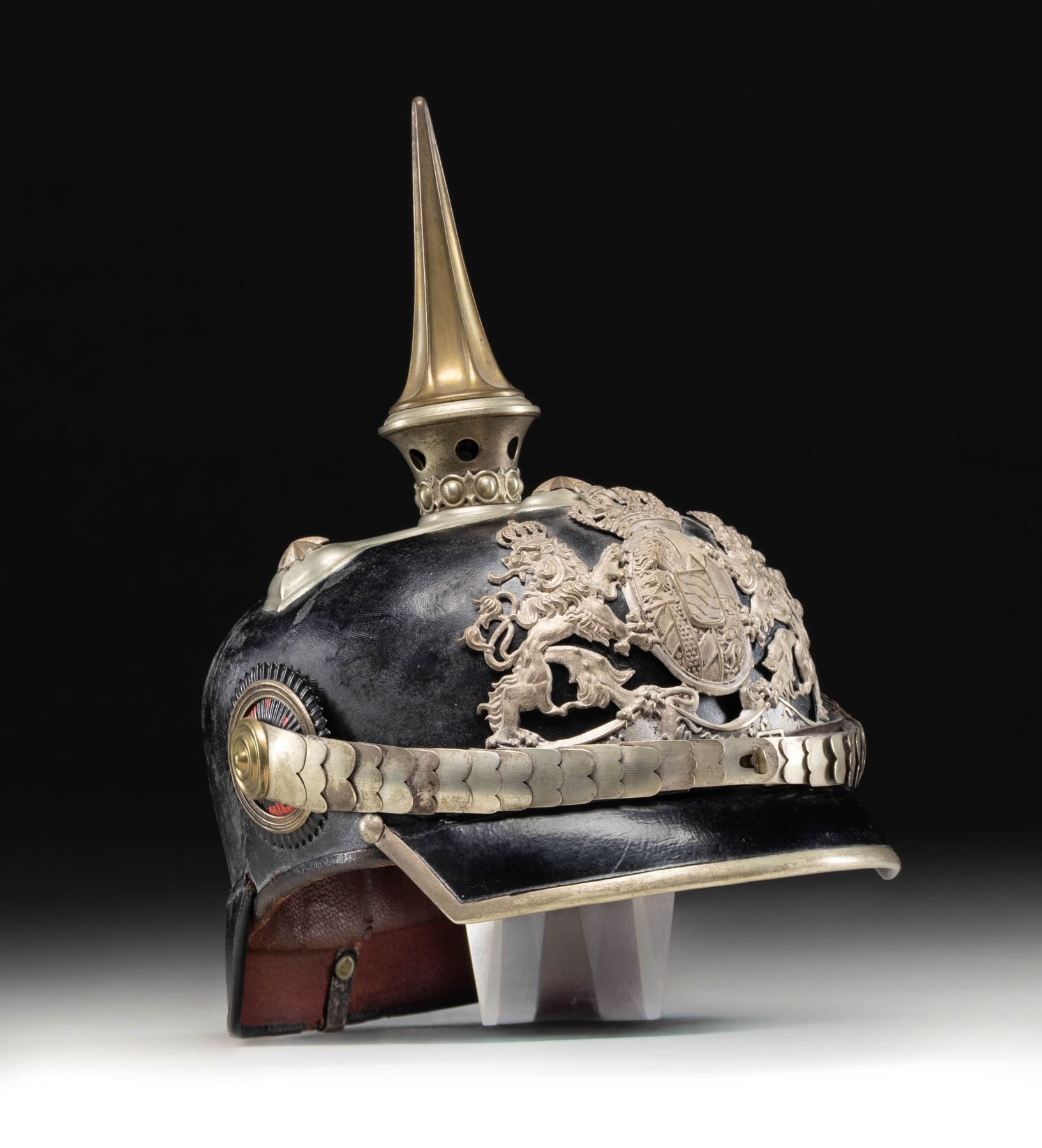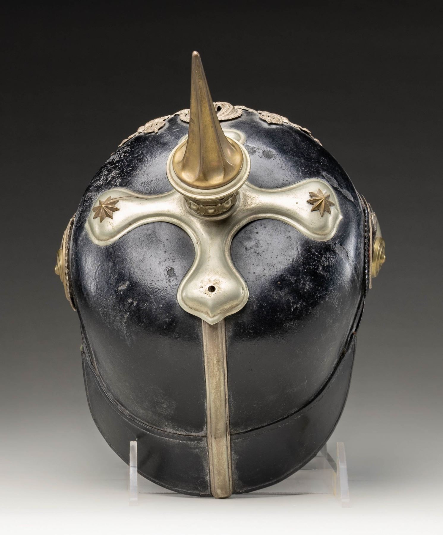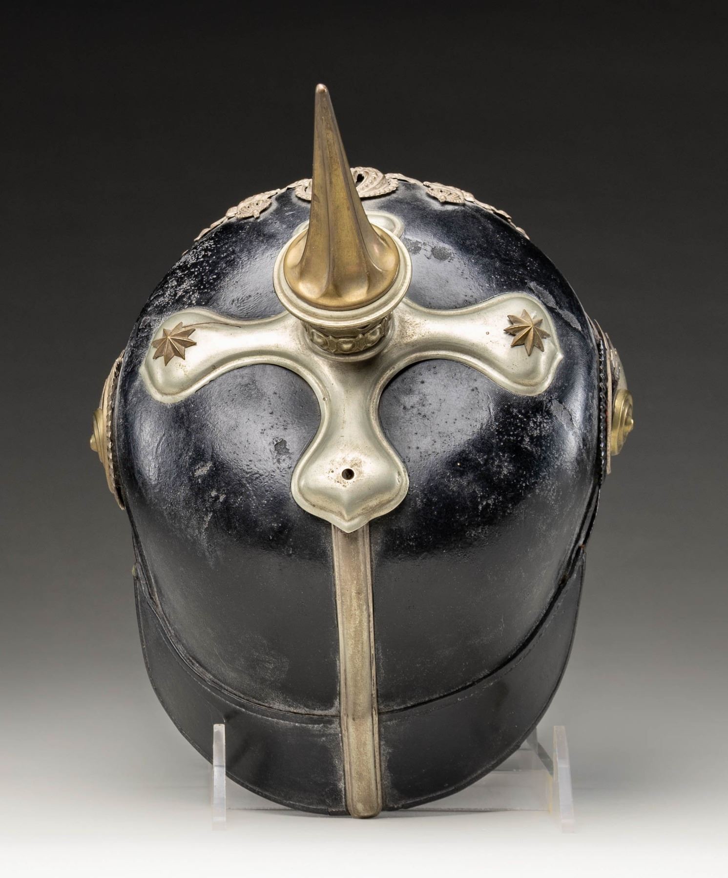 A beautiful imperial German officer's spike helmet from Bavaria. The helmet stands about 10 1/2" in height and measures about 9 3/4" front to back. It shows a slivered spike with a gilded top secured by 3 of 4 8-pointed stars. Silvered front plate, chin scales, spine, and trim. Correct national and Bavarian kokarden. Brown leather sweatband with a brown grosgrain officer's liner. CONDITION: helmet is solid and has a good shape. There are scuffs to the leather that could be improved with a kind cleaning. Metal has a good tarnished appearance and the interior shows generally light wear. No extra holes in the body. (02-24626/BF). $1000-1600.