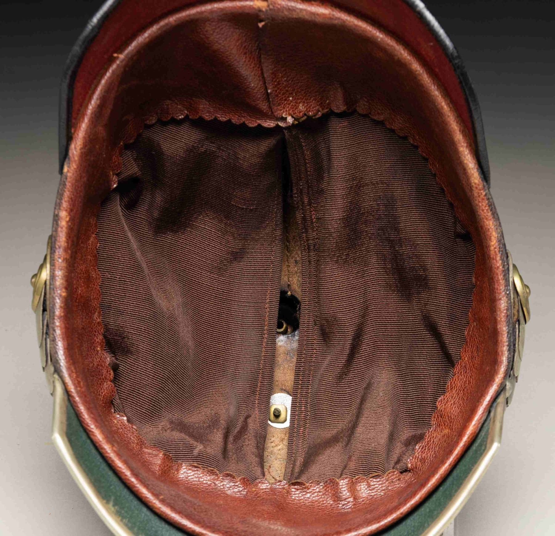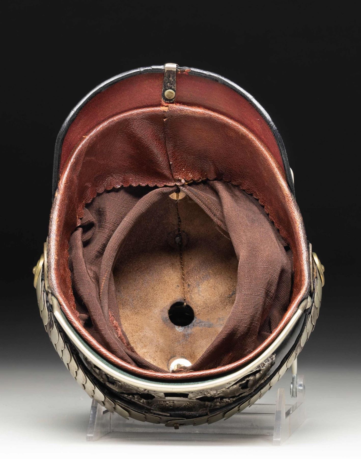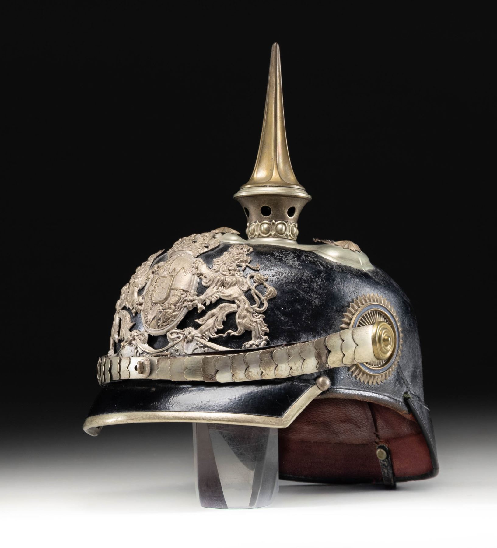 A beautiful imperial German officer's spike helmet from Bavaria. The helmet stands about 10 1/2" in height and measures about 9 3/4" front to back. It shows a slivered spike with a gilded top secured by 3 of 4 8-pointed stars. Silvered front plate, chin scales, spine, and trim. Correct national and Bavarian kokarden. Brown leather sweatband with a brown grosgrain officer's liner. CONDITION: helmet is solid and has a good shape. There are scuffs to the leather that could be improved with a kind cleaning. Metal has a good tarnished appearance and the interior shows generally light wear. No extra holes in the body. (02-24626/BF). $1000-1600.
