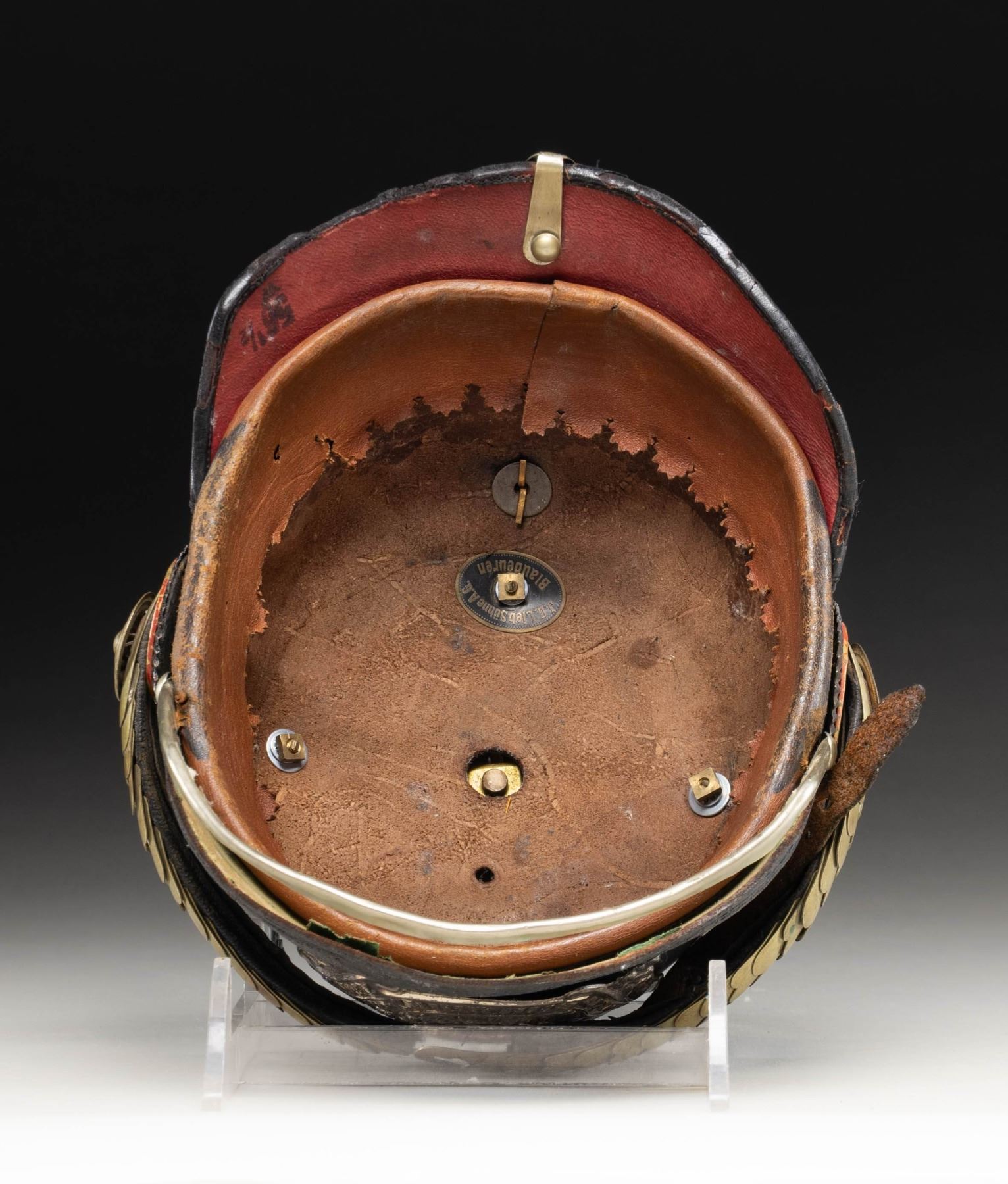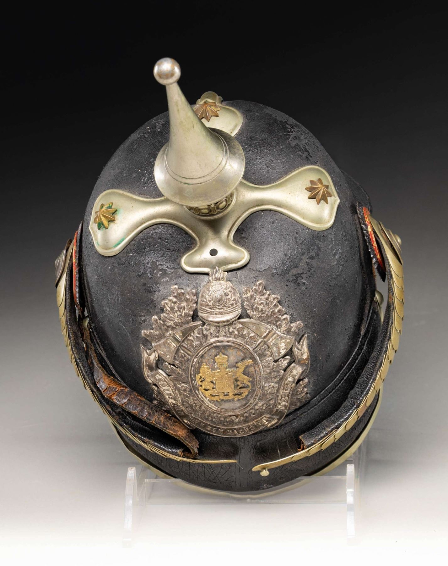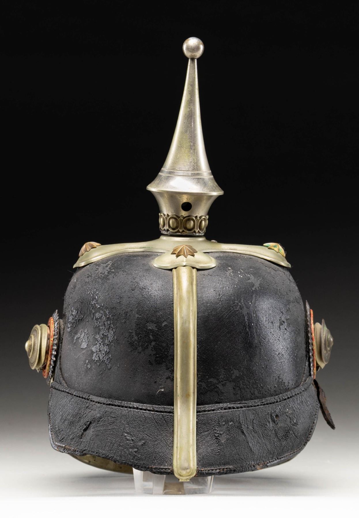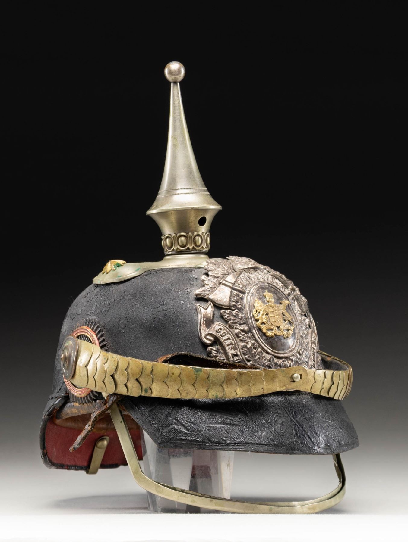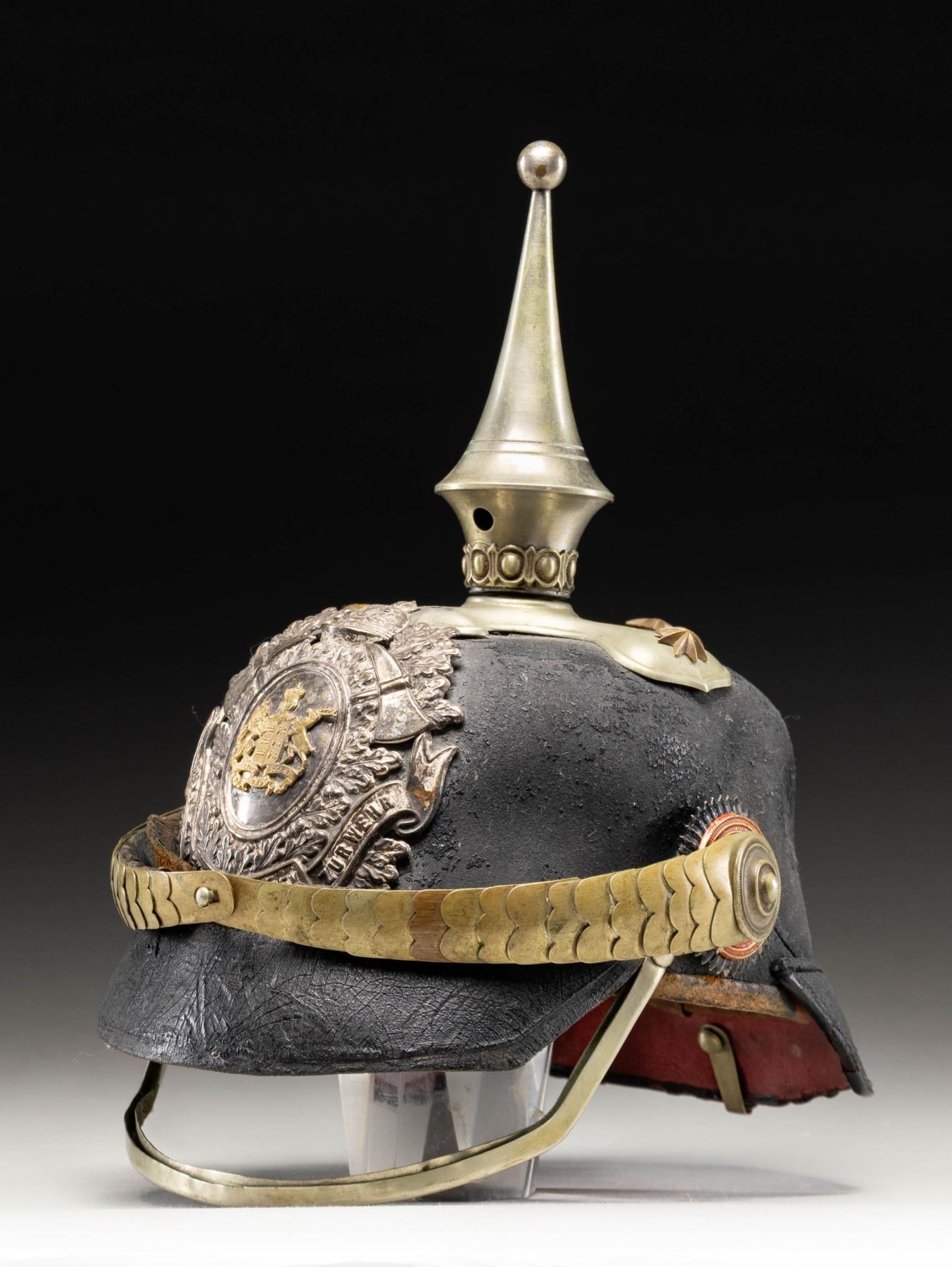 SPIKE HELMET. A good imperial German fire official's spike helmet from Wurttemberg. The helmet stands about 10 1/2" in height and measures about 9 " front to back. It shows a slivered ball topped spike secured by 3 of 4 8-pointed stars. The silvered front plate has a central gilded Wurttemberg crest. The chin scales, spine, and trim are all silvered. Non-matching Wurttemberg kokarden with no national kokard. Brown leather sweatband with no grosgrain liner. CONDITION: helmet is solid but the finish on the leather body has degraded. The front visor has shrunk and pulled away from the trim piece. Metal has a good tarnished appearance and the interior shows generally light wear. No extra holes in the body. (02-25755/BF). NON-GUN. $300-500.