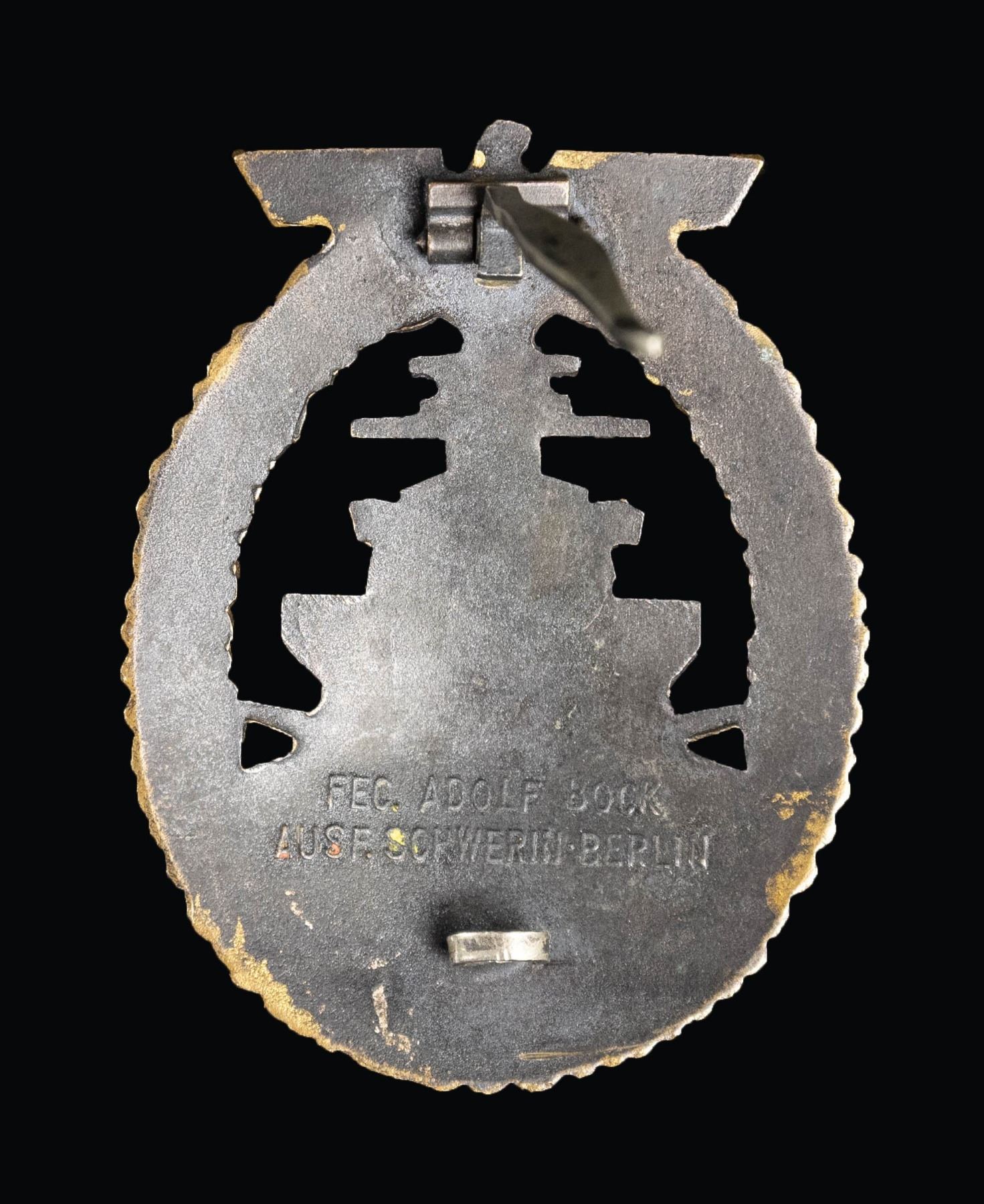 A nice original WWII German Kriegsmarine High Seas Fleet Badge with a gilded wreath and eagle surrounding a darkened battleship. The reverse is marked "FEC.ADOLF BOCH AUSF. SCHWERIN-BERLIN". CONDITION: light wear. PROVENANCE: Estate Collection of John "Jack" Dhooghe. (02-25571/BF). NON-GUN. $300-500.