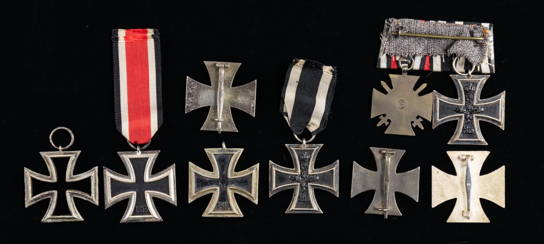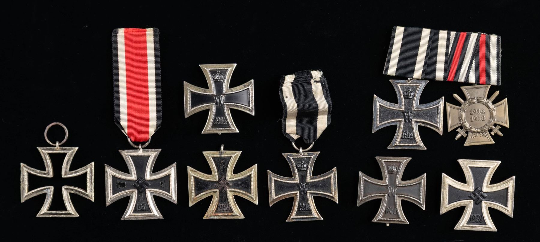 This group of German Iron crosses includes 1 vaulted WWI 1st class Iron Cross with a non-magnetic center, 1 flat WWI 1st class Iron Cross with a non-magnetic center, 1 flat WWII 1st class Iron Cross with a non-magnetic center, 1 WWII 2nd class Iron Cross with ribbon and a magnetic center, 1 WWII 2nd Iron Cross with no ribbon and a magnetic center, 1 WWI 2nd Iron Cross with a ribbon and a magnetic center, 1 Outer frame for a 2nd class Iron Cross, and 1 Medal bar containing a 2nd class Iron cross with a magnetic center and a 1914-1918 cross with swords. CONDITION: all medals generally show light wear. (02-25434/BF). NON-GUN. $500-800.