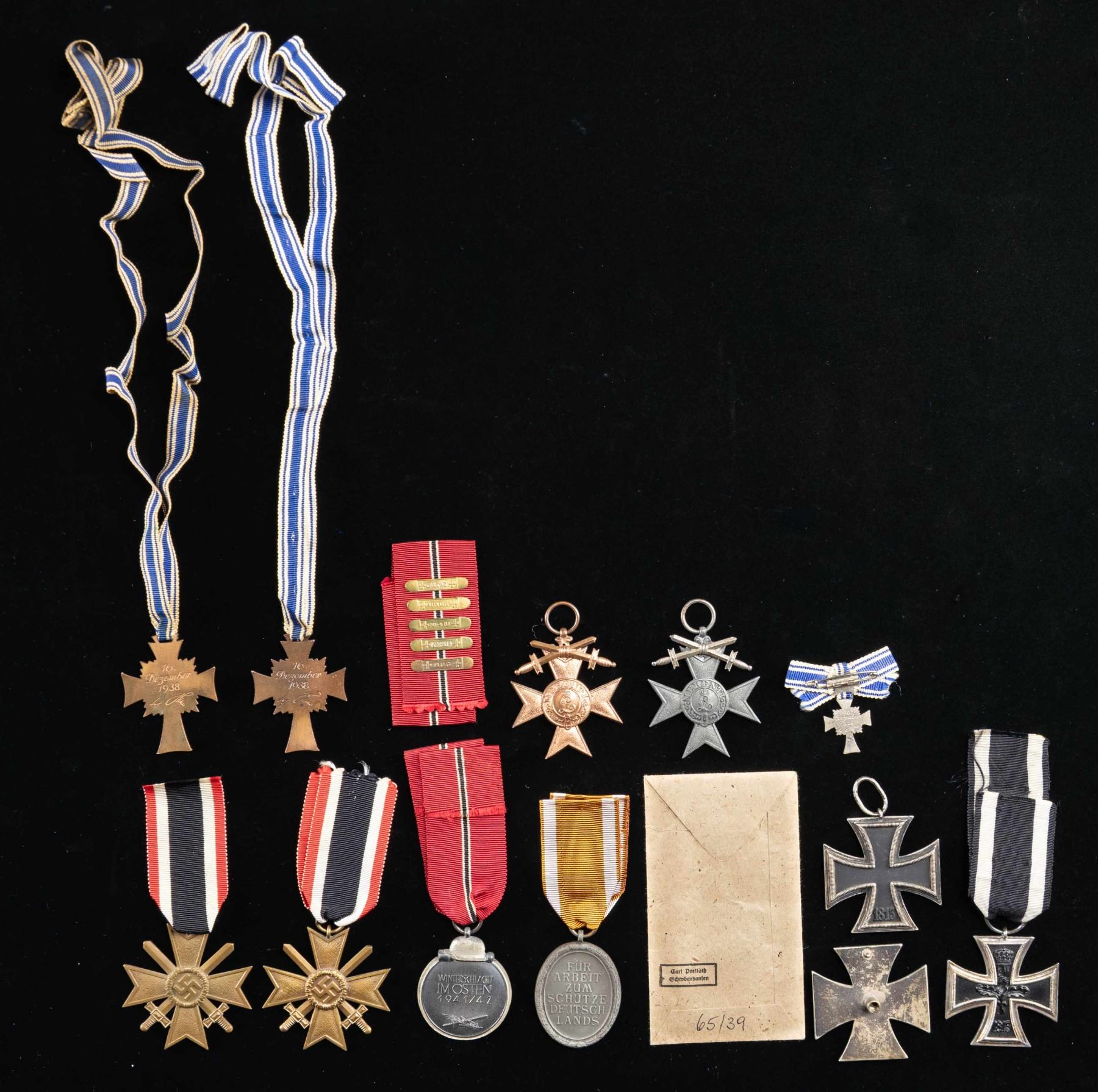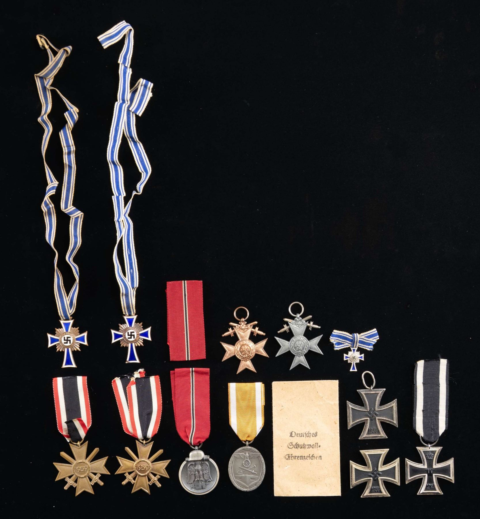 This attractive lot includes 1 Westwall medal with ribbon and issue envelope, 1 Russian Frond medal with ribbon, 2 Bronze Mother's Crosses with ribbons, 2 War Merit crosses with swords and ribbons, 1 miniature Silver Mother's cross with ribbon, 1 WWII 2nd class Iron Cross without ribbon, 1 WWI Bavarian Military Merit cross with swords and no ribbon in gilded brass, 1 WWI Bavarian Military Merit cross with swords and no ribbon in pot metal, 1 Russian Front medal ribbon only, 1 WWI 2nd class Iron Cross with ribbon, and 1 WWII 1st class Iron Cross screw back with no screw. CONDITION: all medals generally show light wear and are complete except as noted. (02-25339/BF). NON-GUN. $600-800.