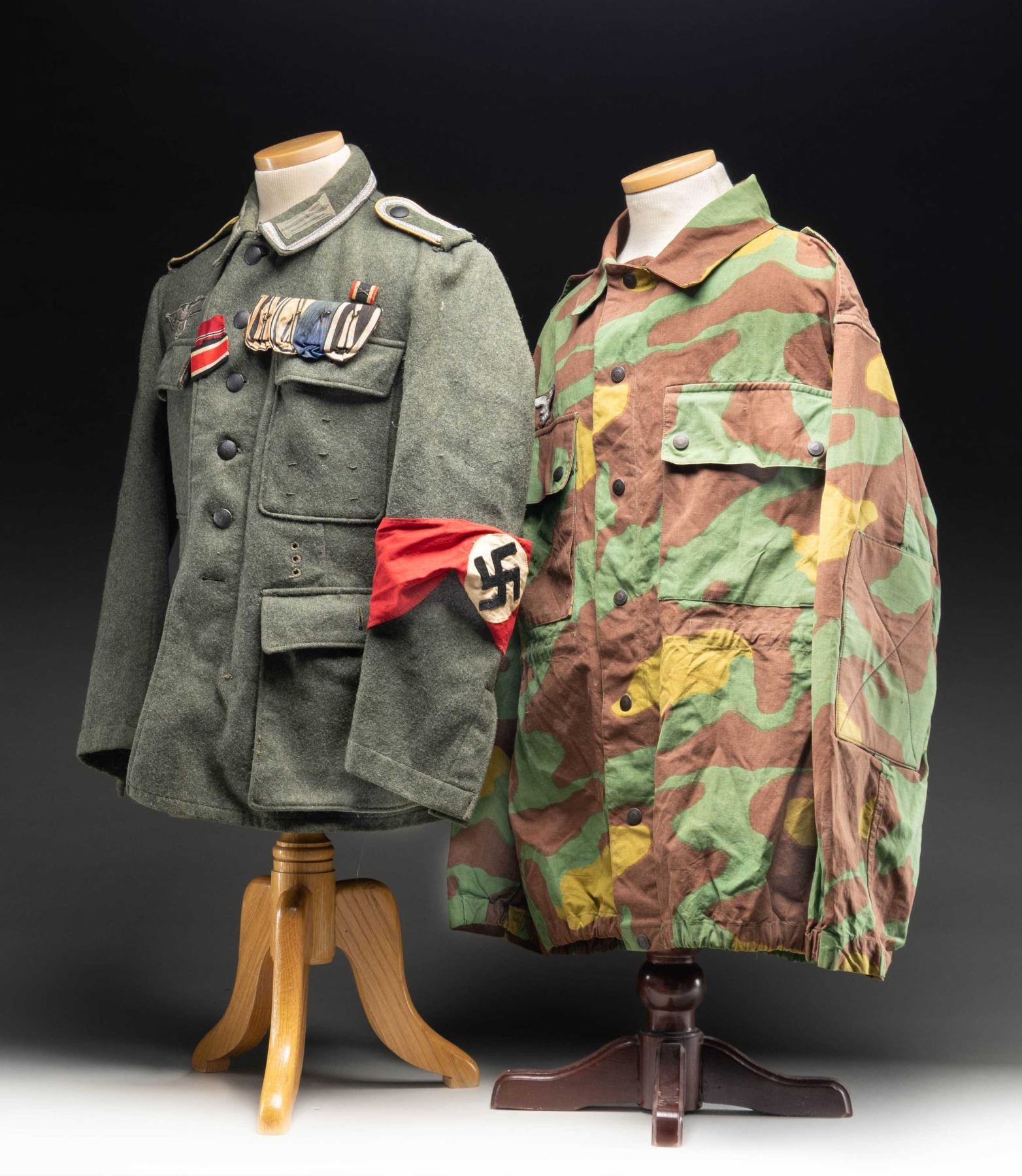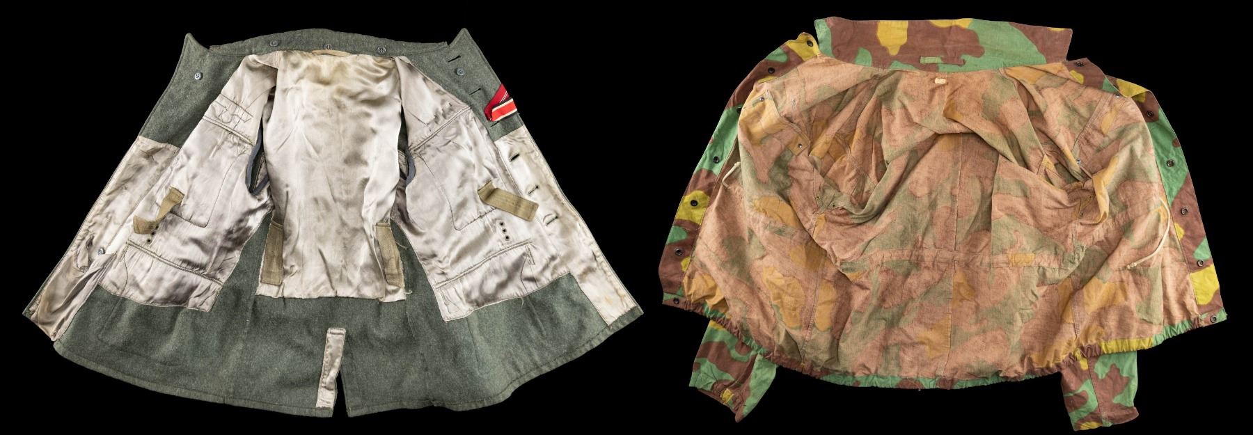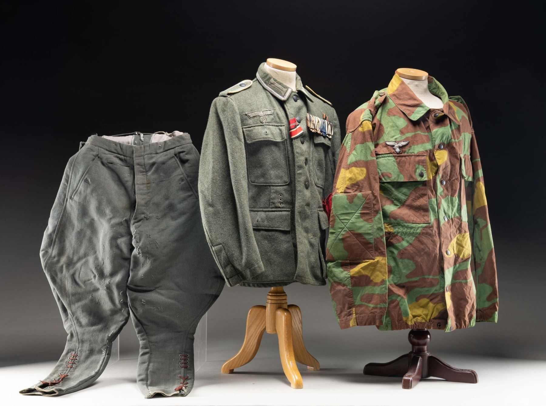 This lot contains both real and reproduction items that have likely been used as costumes at one time. The first item is an original winter weight army 6 button tunic with original corporal shoulder straps and collar tabs. The breast eagle is original but likely added later. There are 2 button hole ribbons for the Iron Cross and Russian Front medal. A 4 award WWI medal bar, with no medals, has been added along with a WWII ribbon bar for the War Merit cross with Swords. There is an original Party armband on the left sleeve that has been sewn many times. The second item is a post WWII Italian Army camouflage jacket with a Luftwaffe breast eagle. Lastly, there is a pair of military style pants that appear to be East German or Russian in origin. CONDITION: tunic show light wear with some moth evidence. Camo has light wear. Pants show moderate wear. (02-25620/BF). NON-GUN. $400-700.
