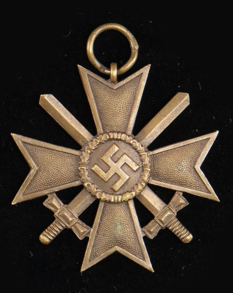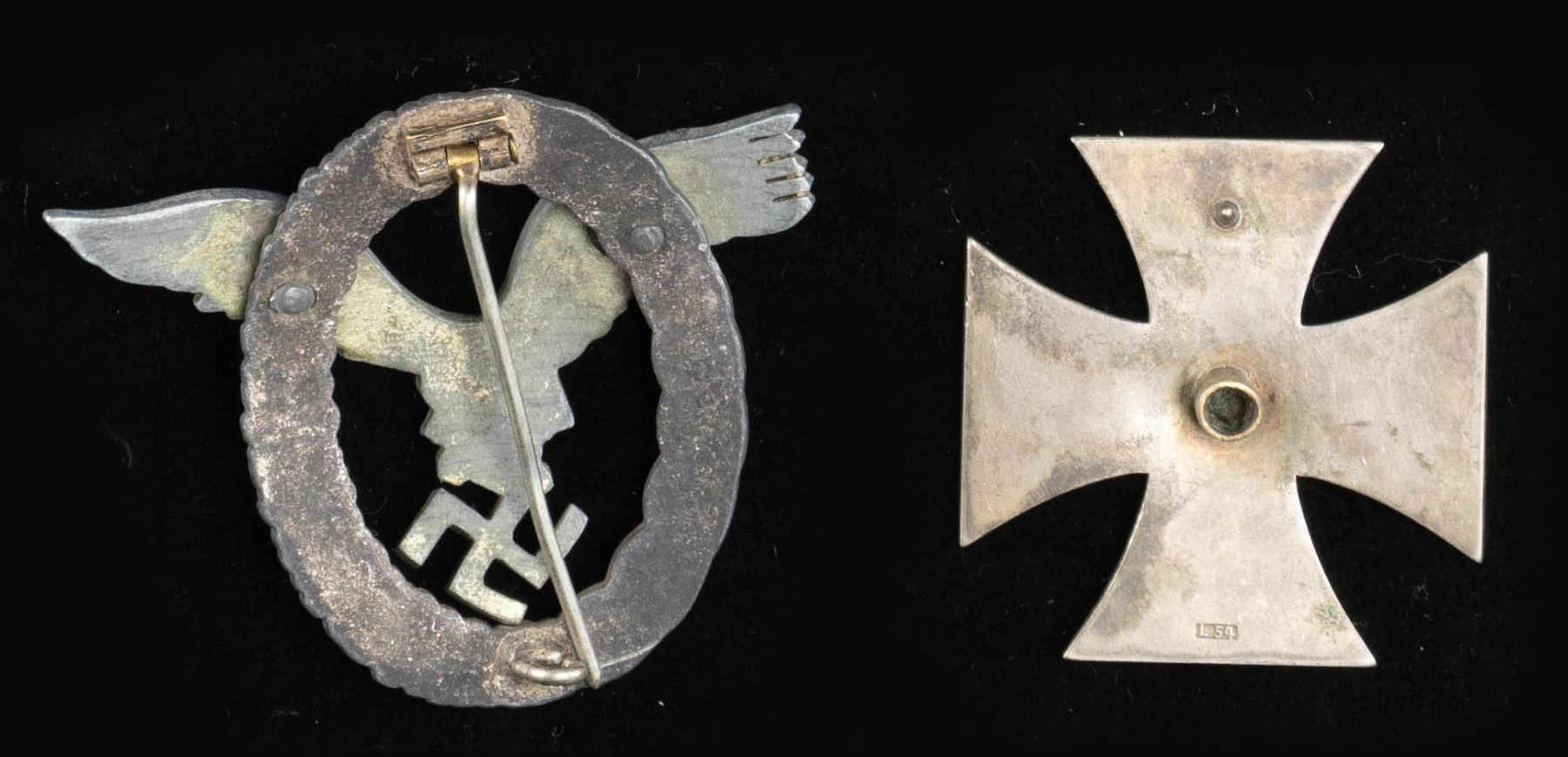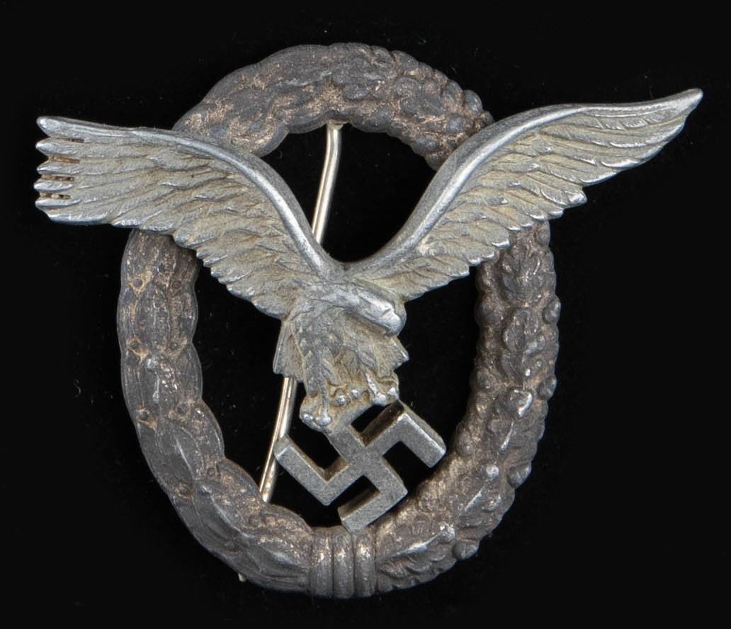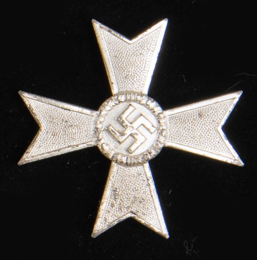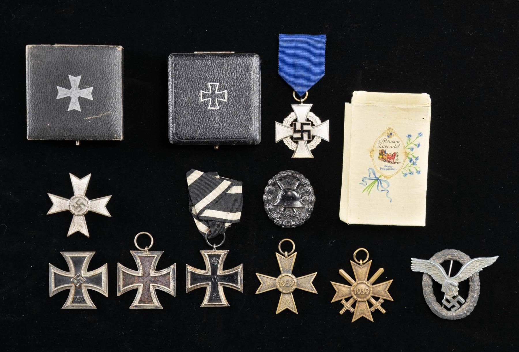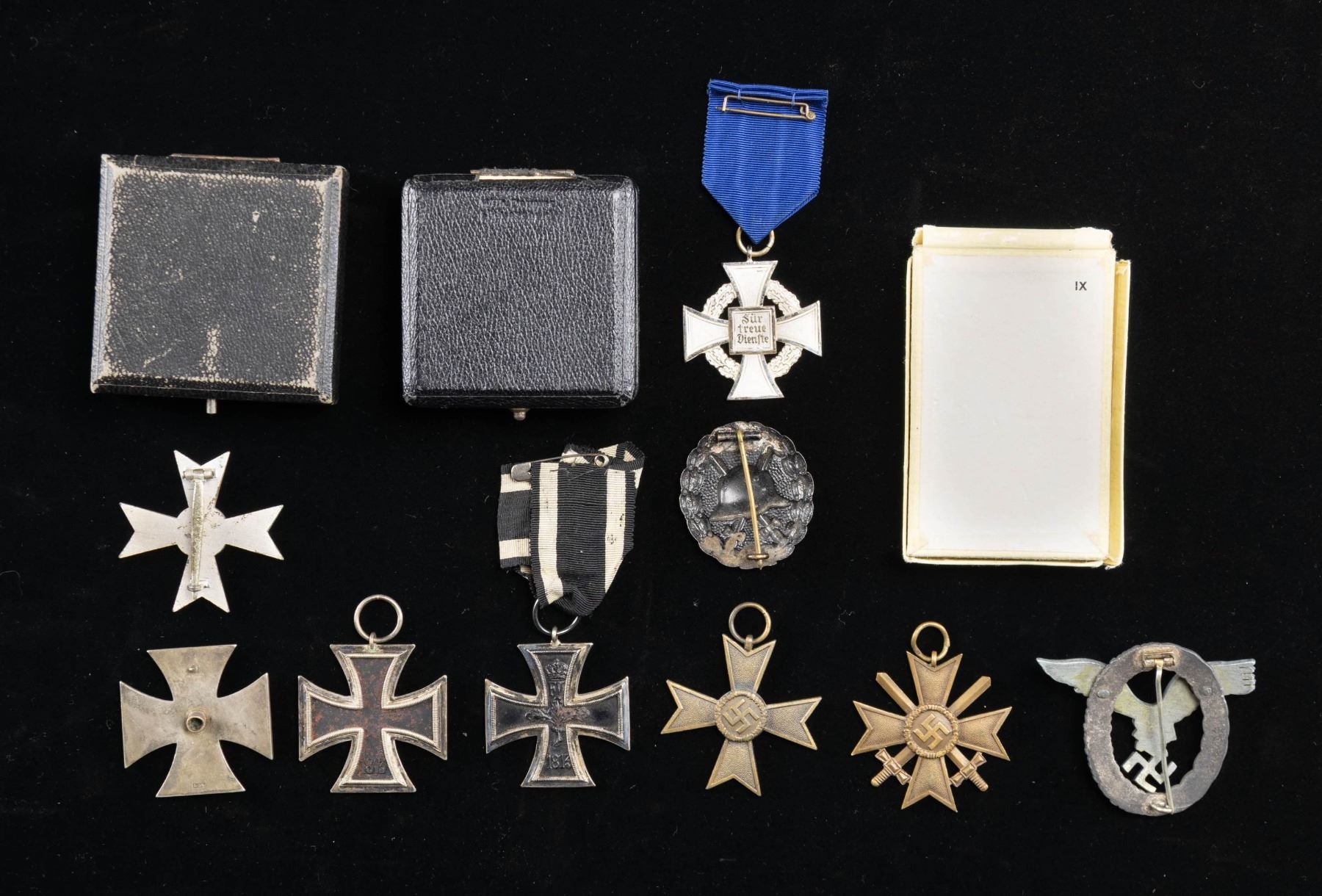 This fine lot of WWII German medals and badges includes 1 WWII 1st class Iron Cross award box with no award, 1 WWII War Merit cross 1st class without swords in its original box of issue, 1 WWII War Merit cross 2nd class with sword and no ribbon, 1 WWII War Merit 2nd class without swords and no ribbon, 1 WWI 2nd class Iron Cross with ribbon, 1 WWII 25 year Faithful Service medal with ribbon, 1 WWI Black Wound badge, 1 WWII 2nd class Iron Cross with no ribbon, 1 WWII 1st class Iron Cross in a screw back style missing the attachment screw, 1 WWII Pilot & Observer's badge of questionable authenticity with 2 rivet construction and a narrow pin. CONDITION: all items show expected wear except as noted. (02-25623/BF). NON-GUN. $500-750.
