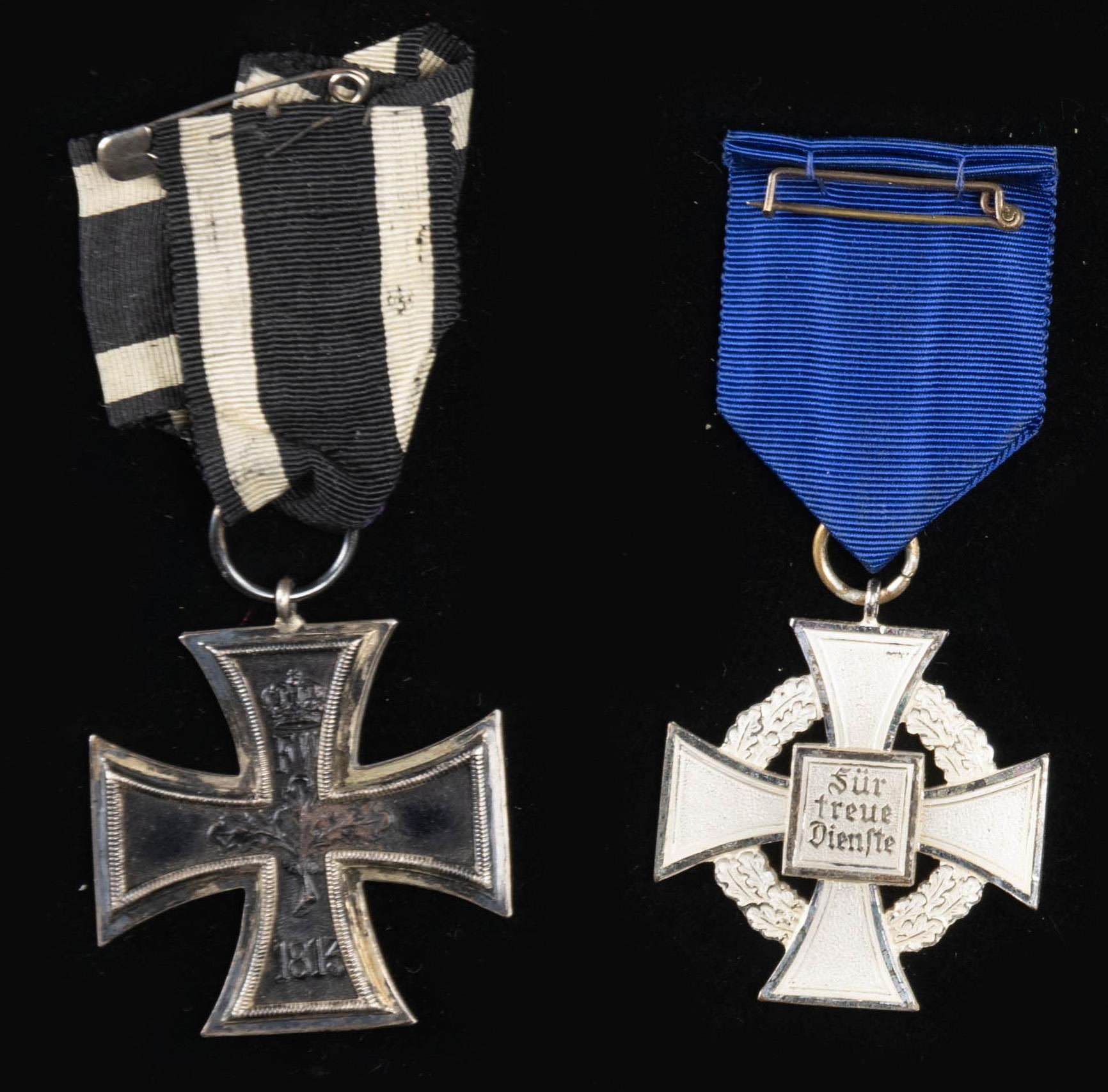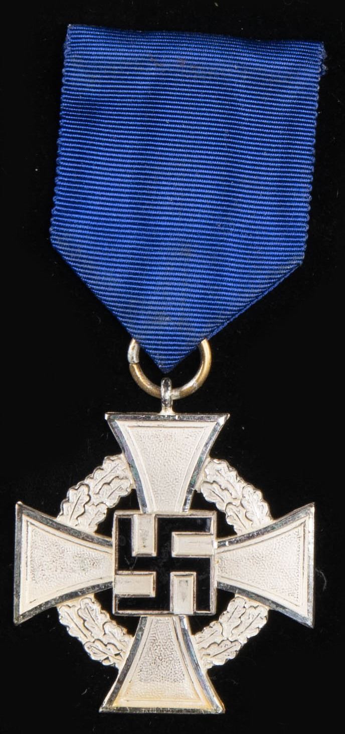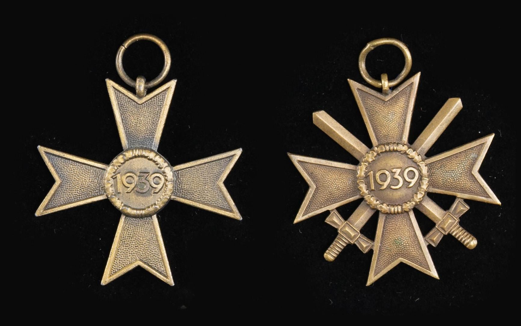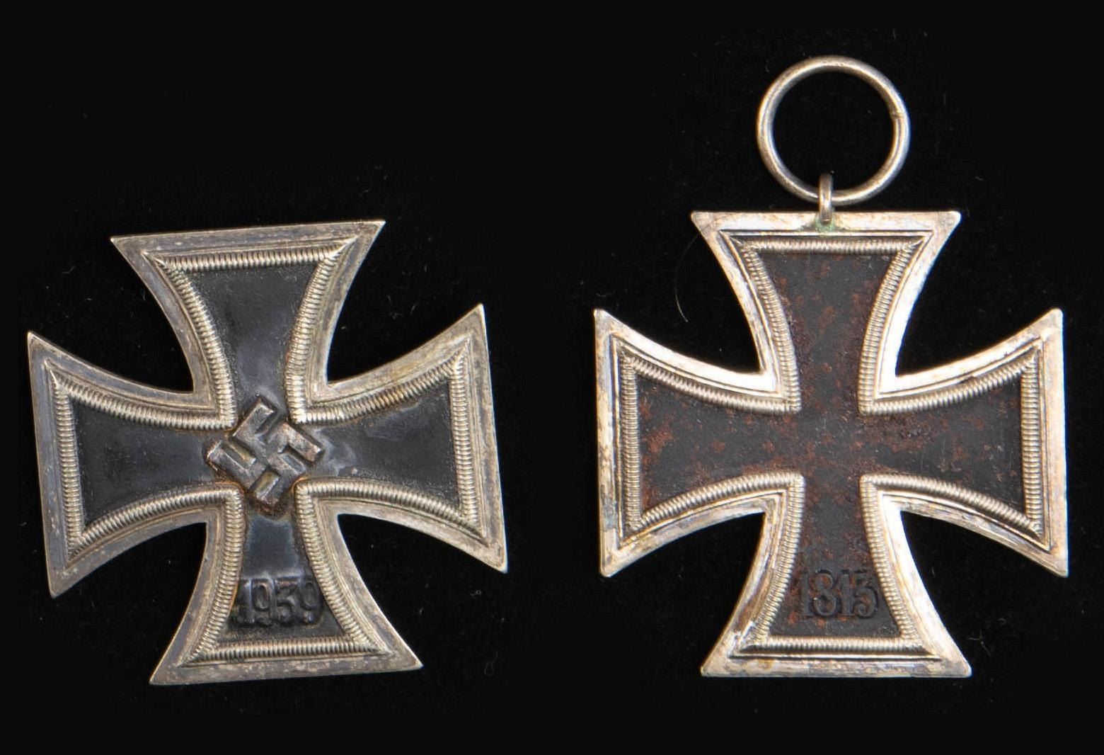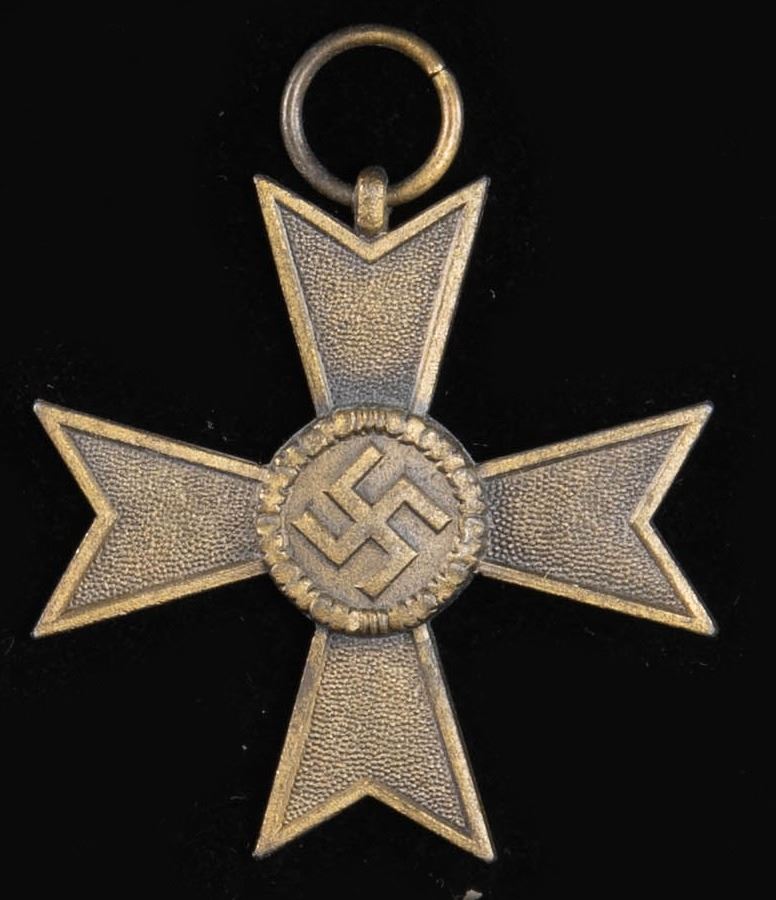 This fine lot of WWII German medals and badges includes 1 WWII 1st class Iron Cross award box with no award, 1 WWII War Merit cross 1st class without swords in its original box of issue, 1 WWII War Merit cross 2nd class with sword and no ribbon, 1 WWII War Merit 2nd class without swords and no ribbon, 1 WWI 2nd class Iron Cross with ribbon, 1 WWII 25 year Faithful Service medal with ribbon, 1 WWI Black Wound badge, 1 WWII 2nd class Iron Cross with no ribbon, 1 WWII 1st class Iron Cross in a screw back style missing the attachment screw, 1 WWII Pilot & Observer's badge of questionable authenticity with 2 rivet construction and a narrow pin. CONDITION: all items show expected wear except as noted. (02-25623/BF). NON-GUN. $500-750.