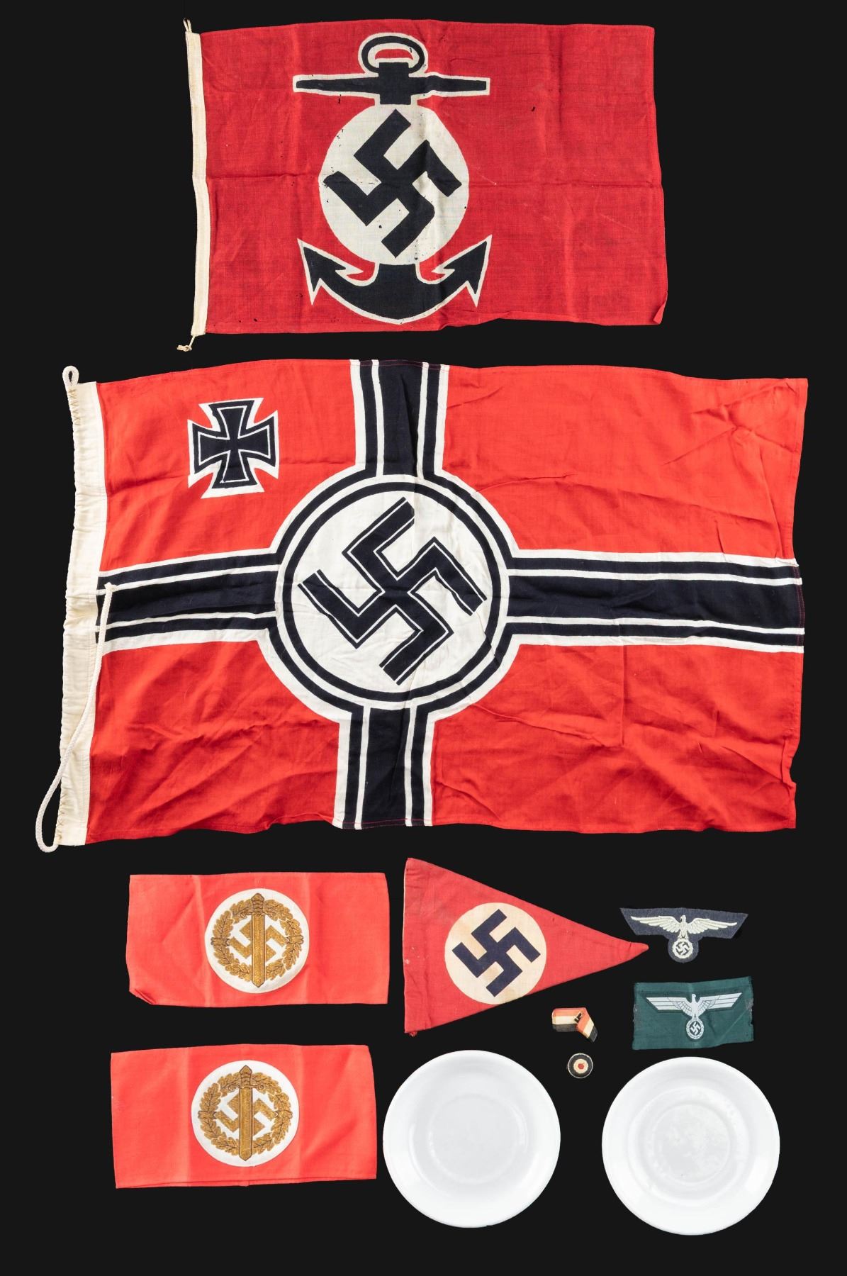 This lot contains 1 small WWII battle flag measuring 36" x 23", 2 White 5 3/4" diameter saucers with Party eagles on the back along with Bavaria 1941, 1 Party pennant measuring 8" in length, 1 Naval Water Sports Association small boat flag measuring 22 1/2" x 14 1/2", 1 Panzer breast eagle, 1 early SS breast eagle, 1 Patriotic ribbon, 1 Cockade in sewn cloth, and 2 Wehrmannschaft armbands. CONDITION: all items show light to moderate wear unless otherwise noted. (02-25435/BF). NON-GUN. $450-650.