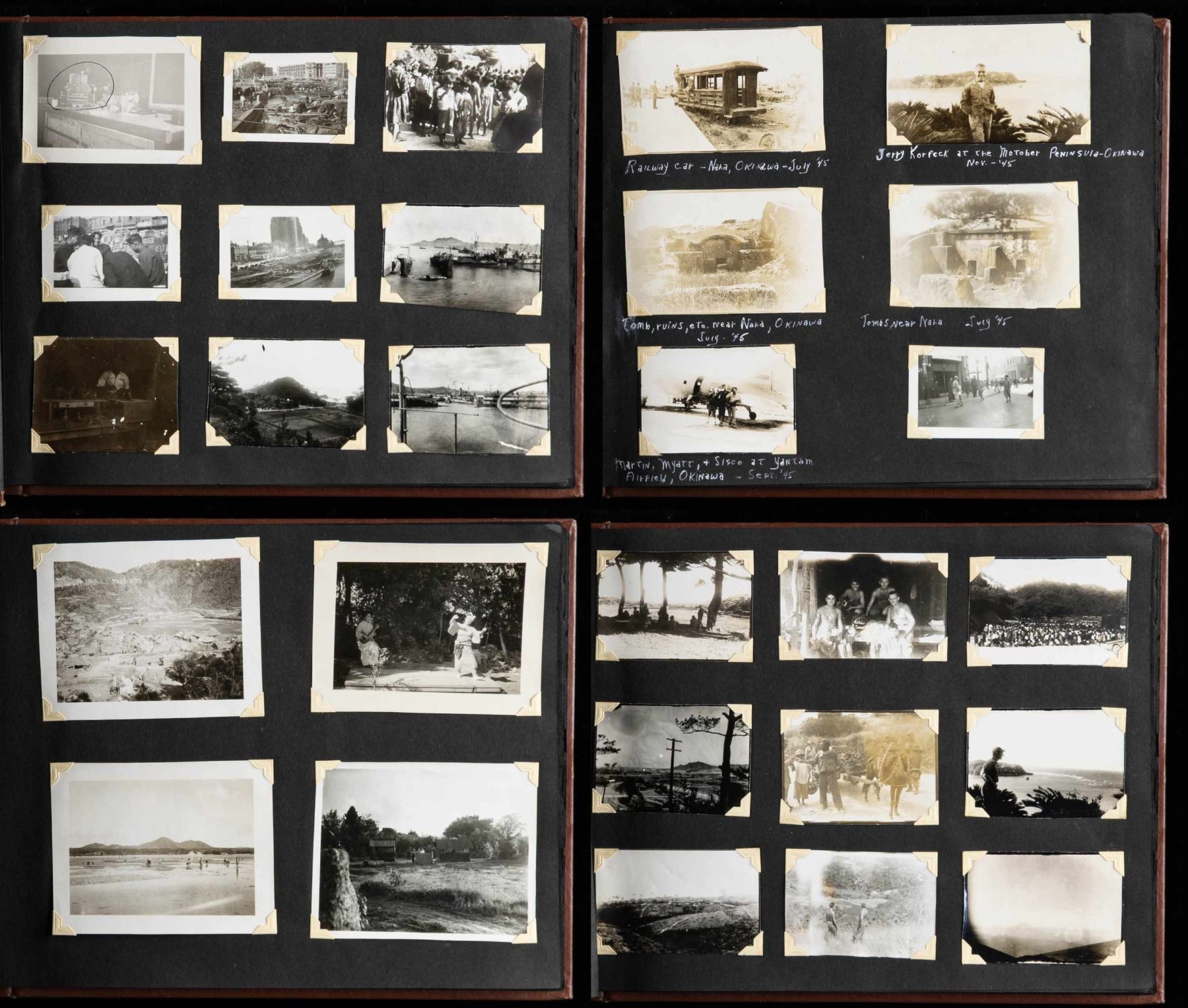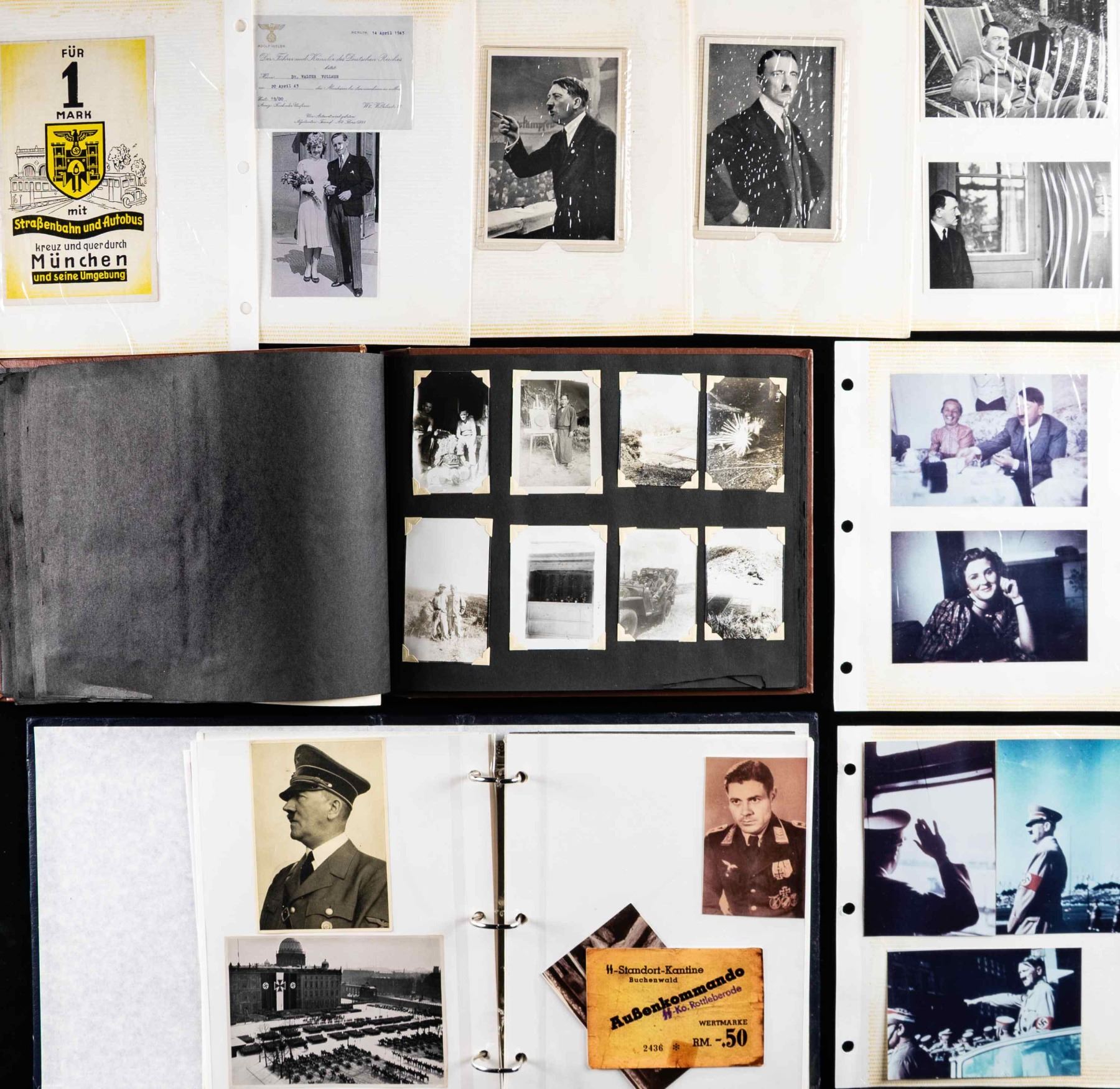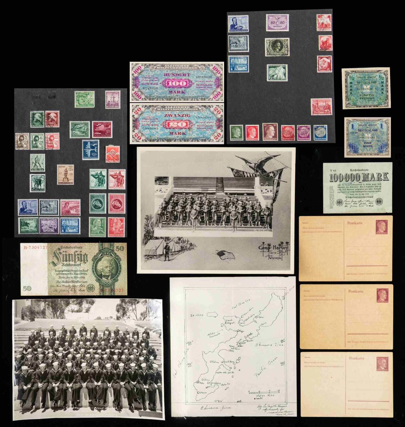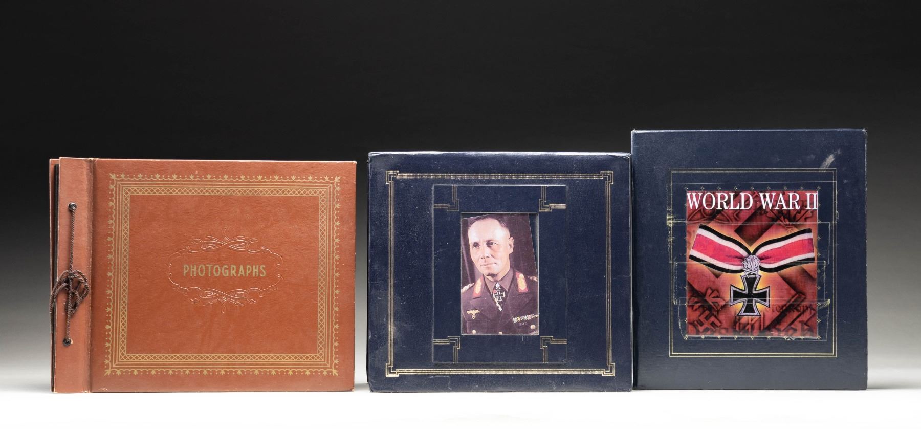 1) Large photo album with small photographs from Okinawa and possibly other locations in the Pacific Theater. CONDITION: photos are well preserved. 2) Photo album put together with modern post WWII prints and postcards relating WWII Germany. The album also contains 4 pieces of occupation currency and a selection of WWII German stamps. CONDITION: like new. 3) A large album containing modern post WWII photographic prints and postcards relating to WWII Germany. The album also contains photographs of award documents for German WWII medals. CONDITION: like new. (02-25340/BF). NON-GUN. $200-400.
