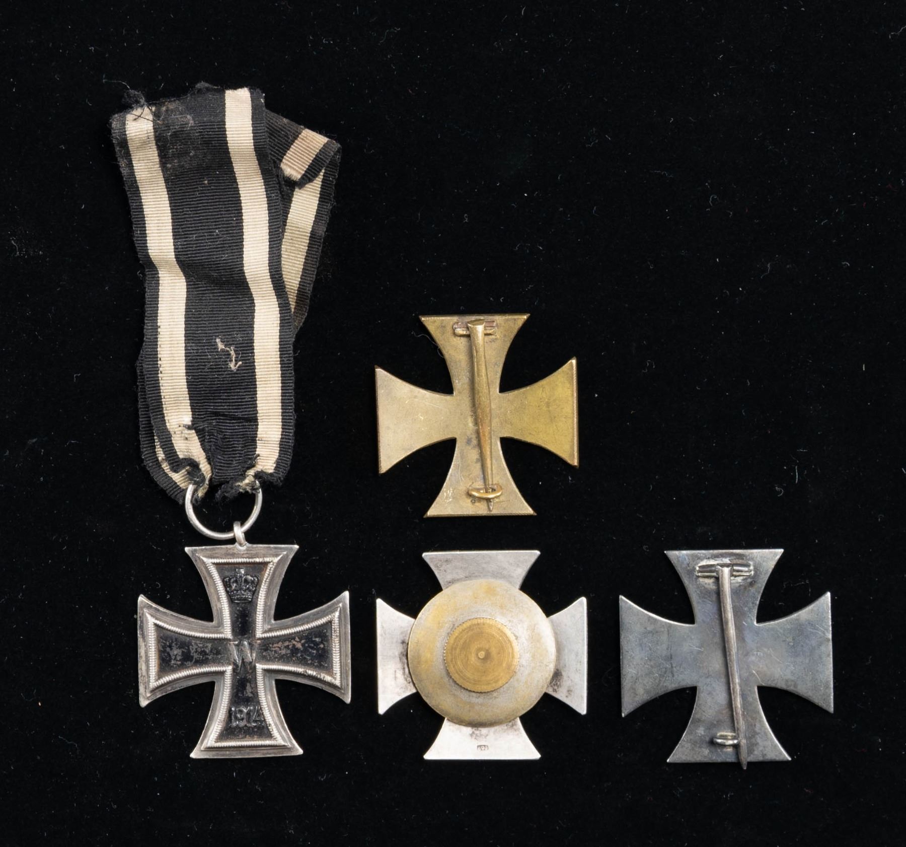 This group consists of 1 vaulted WWI 1st class screw back Iron Cross, 1 flat WWI 1st class pin back IUron Cross, 1 WWI 2nd class Iron Cross with ribbon, and 1 WWI Brunswick War Merit cross 1st class. CONDITION: all items show use and light overall wear. (02-26116/BF). NON-GUN. $500-750.