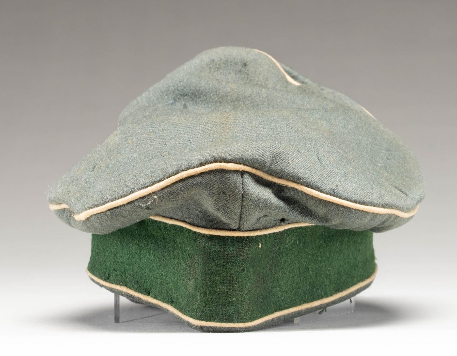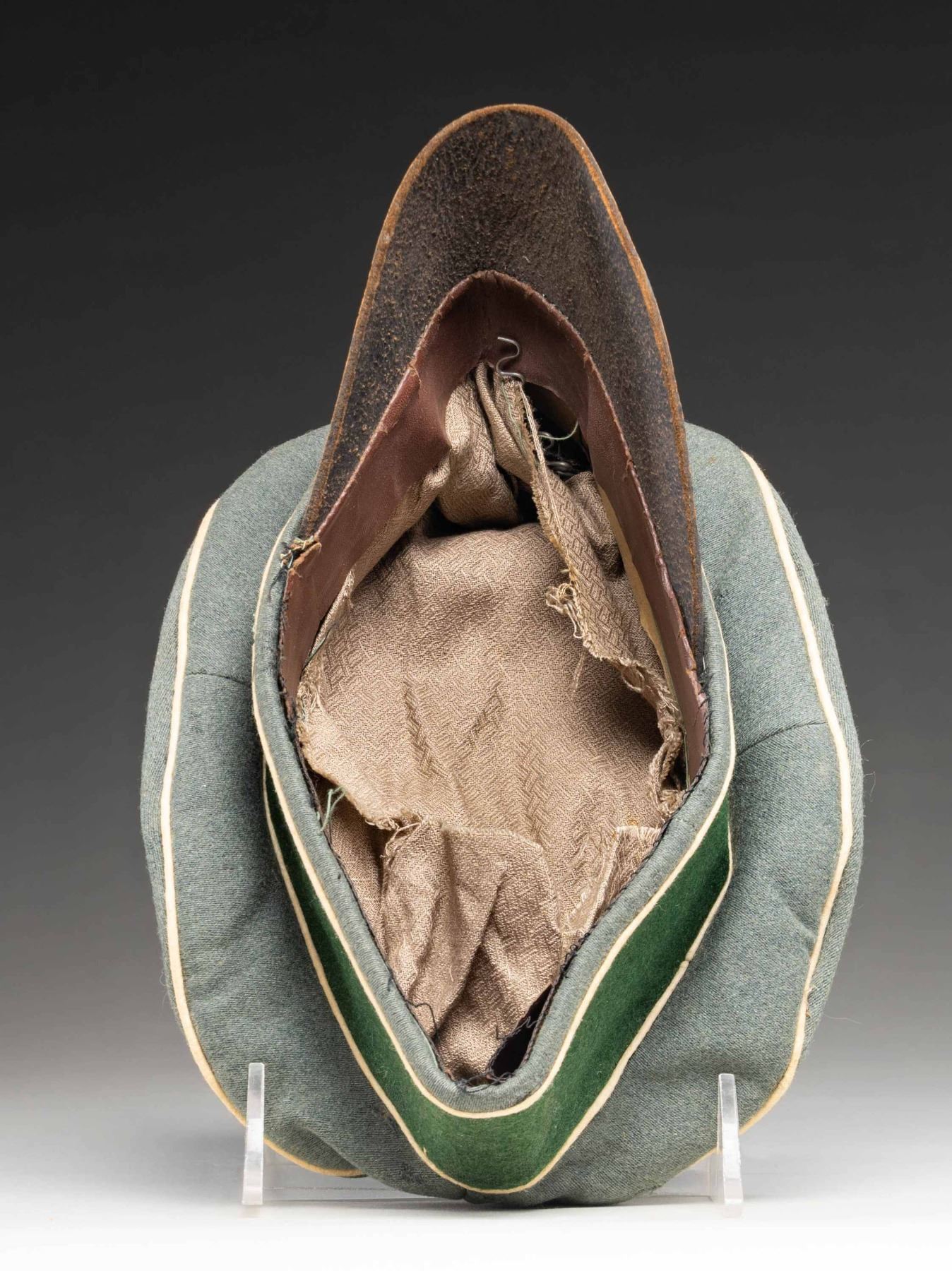 A good example of a scarcer early WWII officer's field cap in sage green with white piping for infantry. This is a crusher type cap with no real form and a rough heavy leather visor. There is a sewn cloth eagle at the peak and a cloth wreath with cockade at the front of the band. Leather sweatband and the lining appears to be cotton. CONDITION: cap does show some moth nips but no major holes. Visor is a bit loose. Both the sweatband and the lining are present but partially detached. (02-26118/BF). NON-GUN. $600-900.