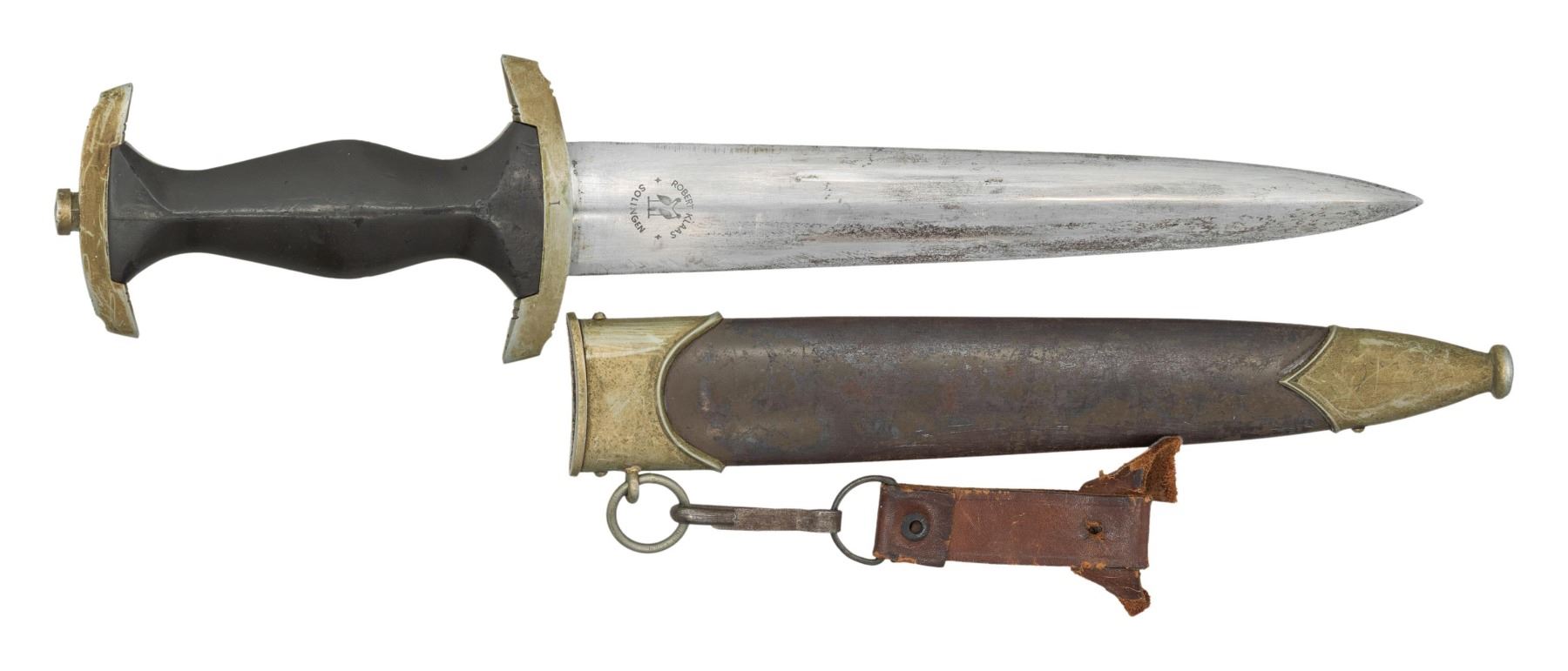 This is a parts WWII German SS dagger assembled after the war from original and post war parts. The blade is original and is etched "Meine Ehre Heisst Treue" with a marking on the reverse that reads "\ROBERT KLASS (logo) SOLINGEN". The authentic pommel guard is paired with an authentic crossguard that is stamped "I" on the reverse. The grip is hard plastic as produced in the post war era. The original scabbard appears to have been made for an SA dagger but had a black finish put on it to match the SS dagger. There is a non-issue hanger attached. CONDITION: blade is a bit worn and has been sharpened. The guards are dirty and tarnished. The grip shows expected wear. The scabbard has lost most of its blackened refinish but retains brown anodizing. The ball at the tip is dented. (02-24209/BF). NON-GUN. $400-600.