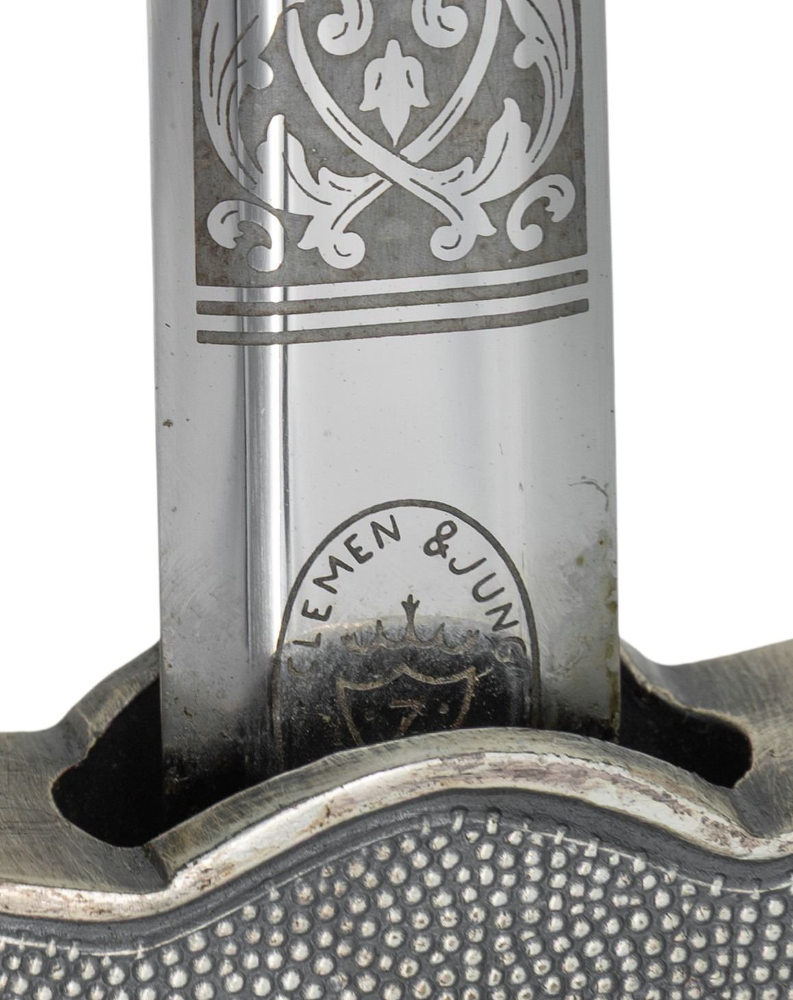 A very pleasing reproduction 2nd model German Luftwaffe presentation dagger of WWII measuring 16 5/8" overall with an etched blade marked "CLEMEN & JUNG (logo) SOLINGEN.". Etching includes scroll work with a Luftwaffe eagle and a panel that reads "Fur langjahrige treue Dienste der Generalstab." Plated eagle crossguard and oak leaf embellished globular pommel. Cream colored wire wrapped grip. plated scabbard. CONDITION: blade retains original factory polish. Hilt shows light wear. Grip shows light wear. Scabbard generally shows light wear. (02-25413/BF). NON-GUN. $200-350.
