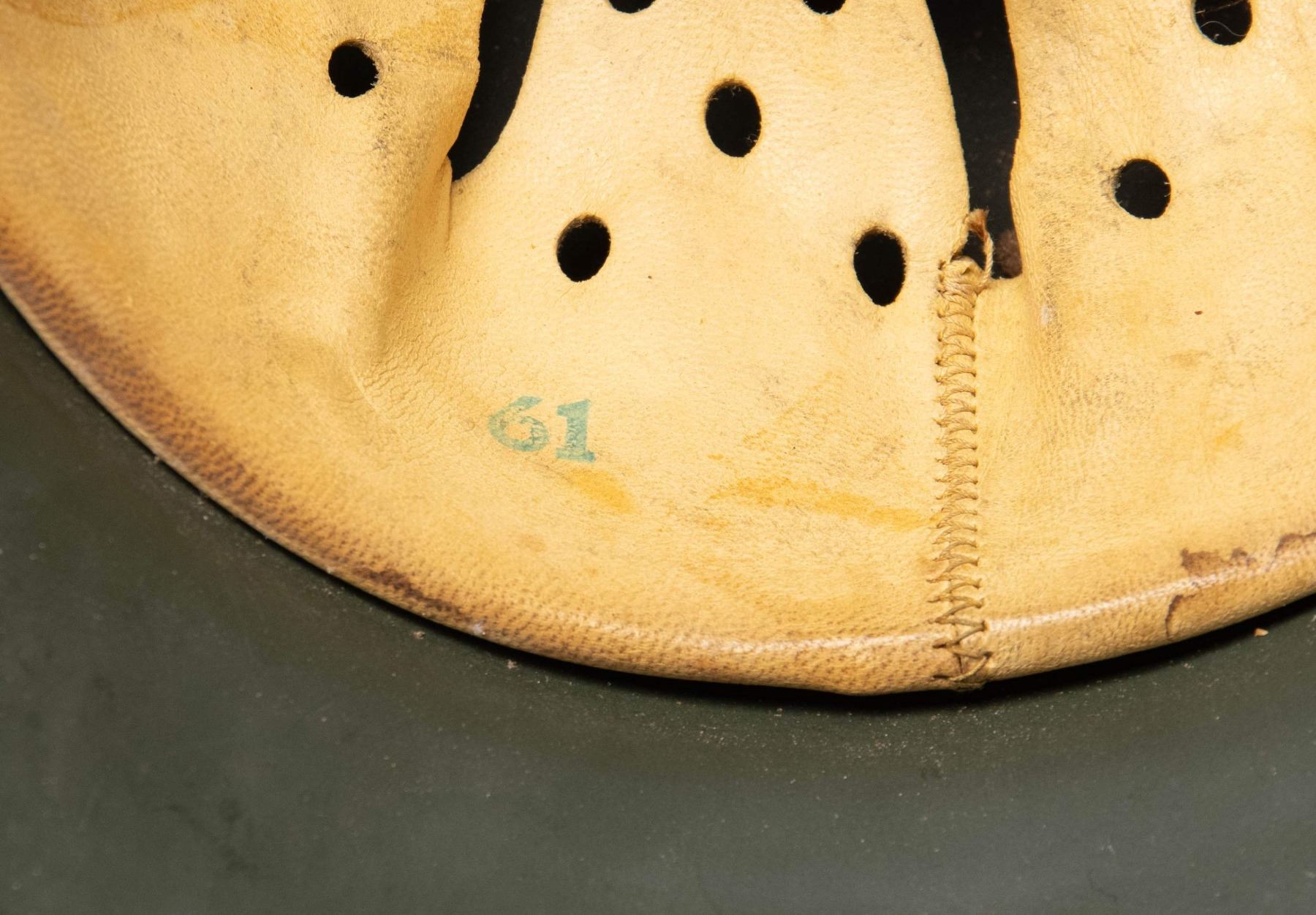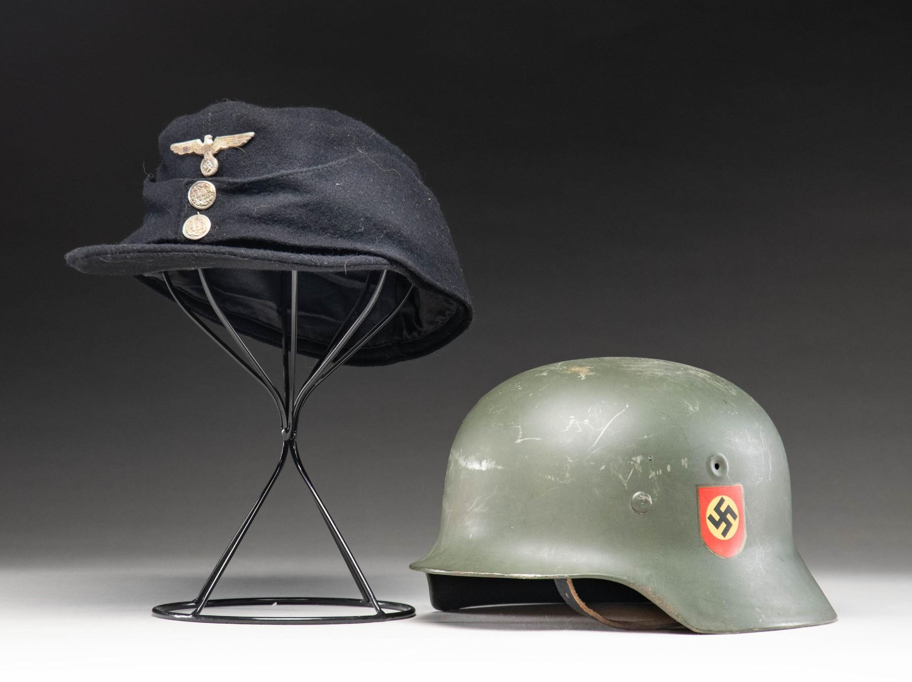 1) German WWII style Waffen SS helmet in green paint with a National decal on the left and an SS decal on the right. This helmet emulates an M1940 style but is clearly a reproduction. Tan liner with a black leather chin strap. There are no interior stampings. CONDITION: very light wear. 2) WWII German style SS m43 cap in black wool with a black cotton liner. The front has a metal SS eagle and 2 small SS buttons on the front of the flap band. A well made hat, but a reproduction nonetheless. CONDITION: light wear. (02-24218/BF). NON-GUN. $200-400.