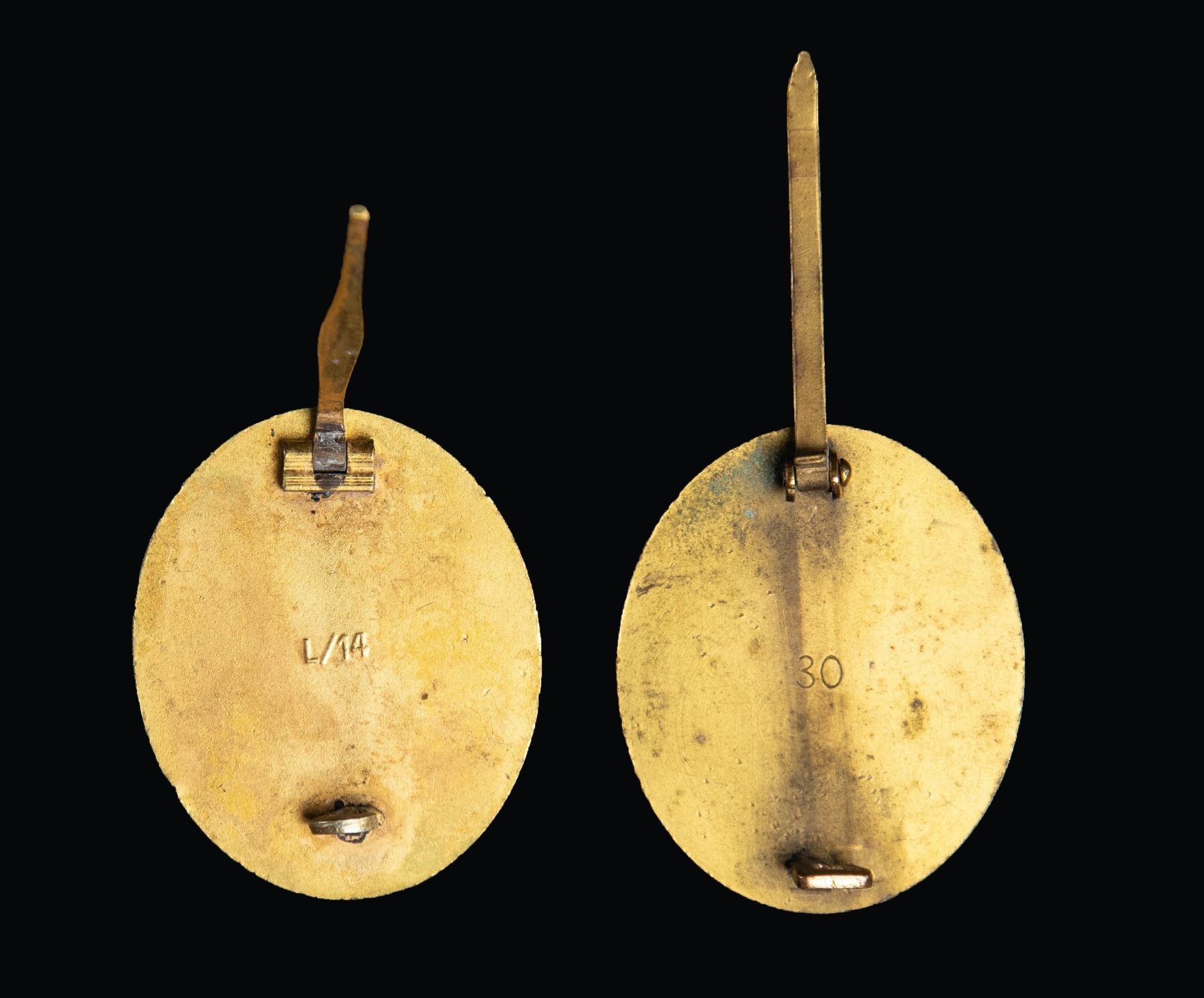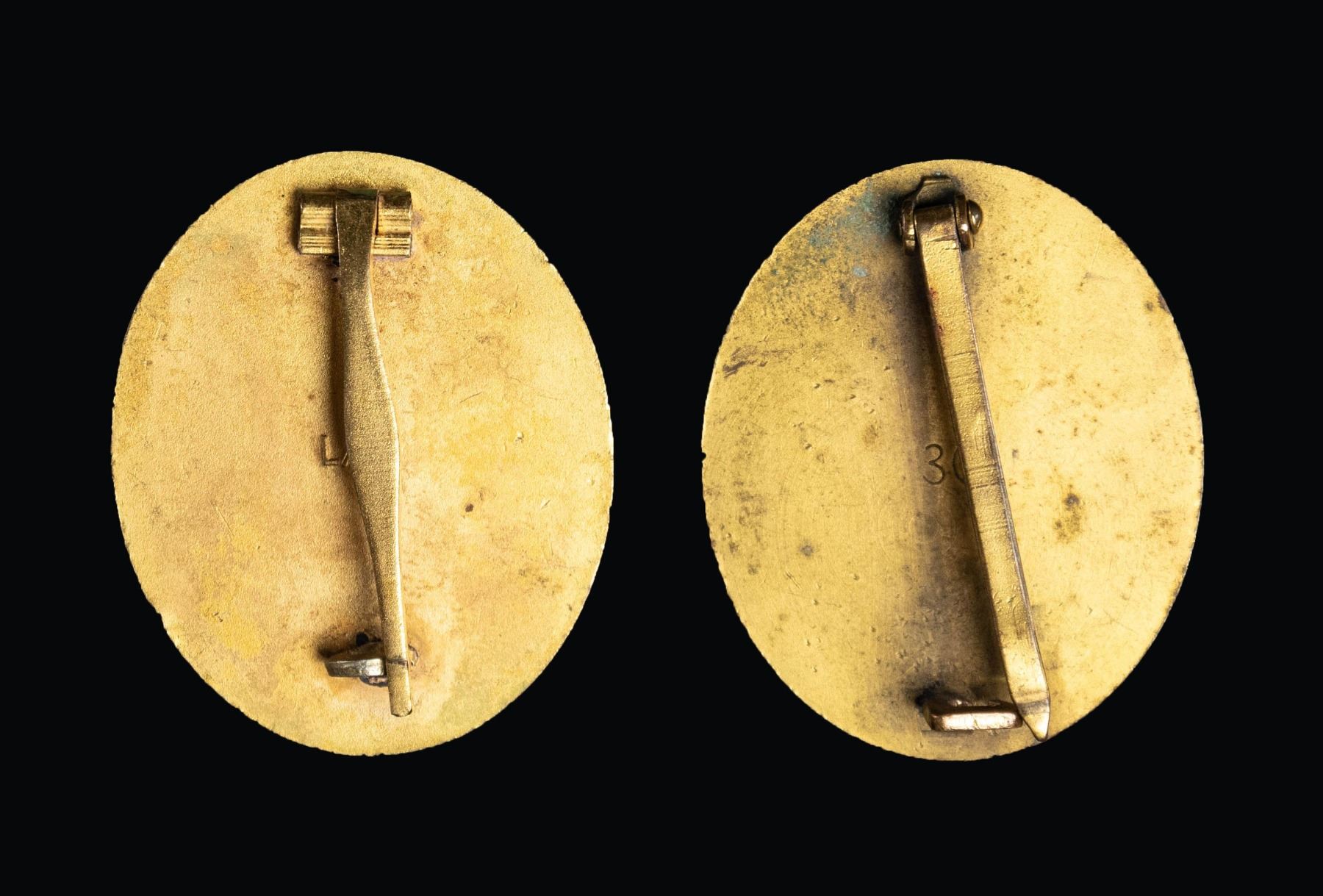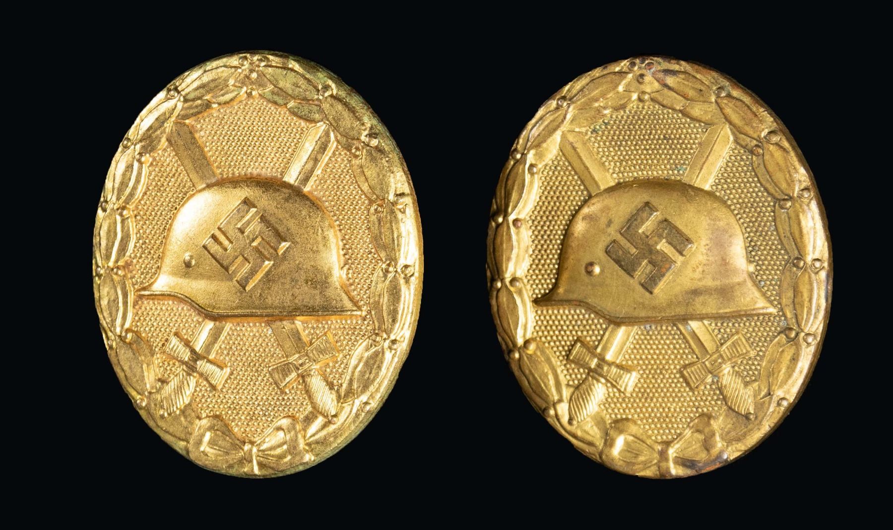 A fine authentic WWII German Gold Wound badge marked "30" on the reverse for Hauptmunzamt of Wien. Accompanying this is a reproduction example marked "L/14" on the reverse. CONDITION: both badges show light wear. PROVENANCE: Estate Collection of John "Jack" Dhooghe. (02-25573/BF). NON-GUN. $200-350.
