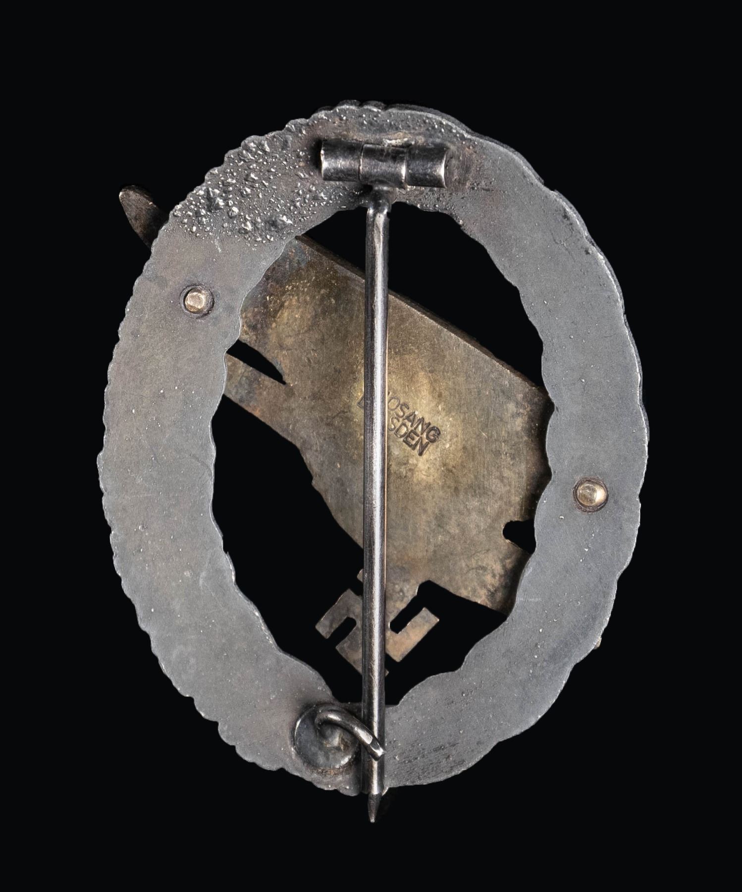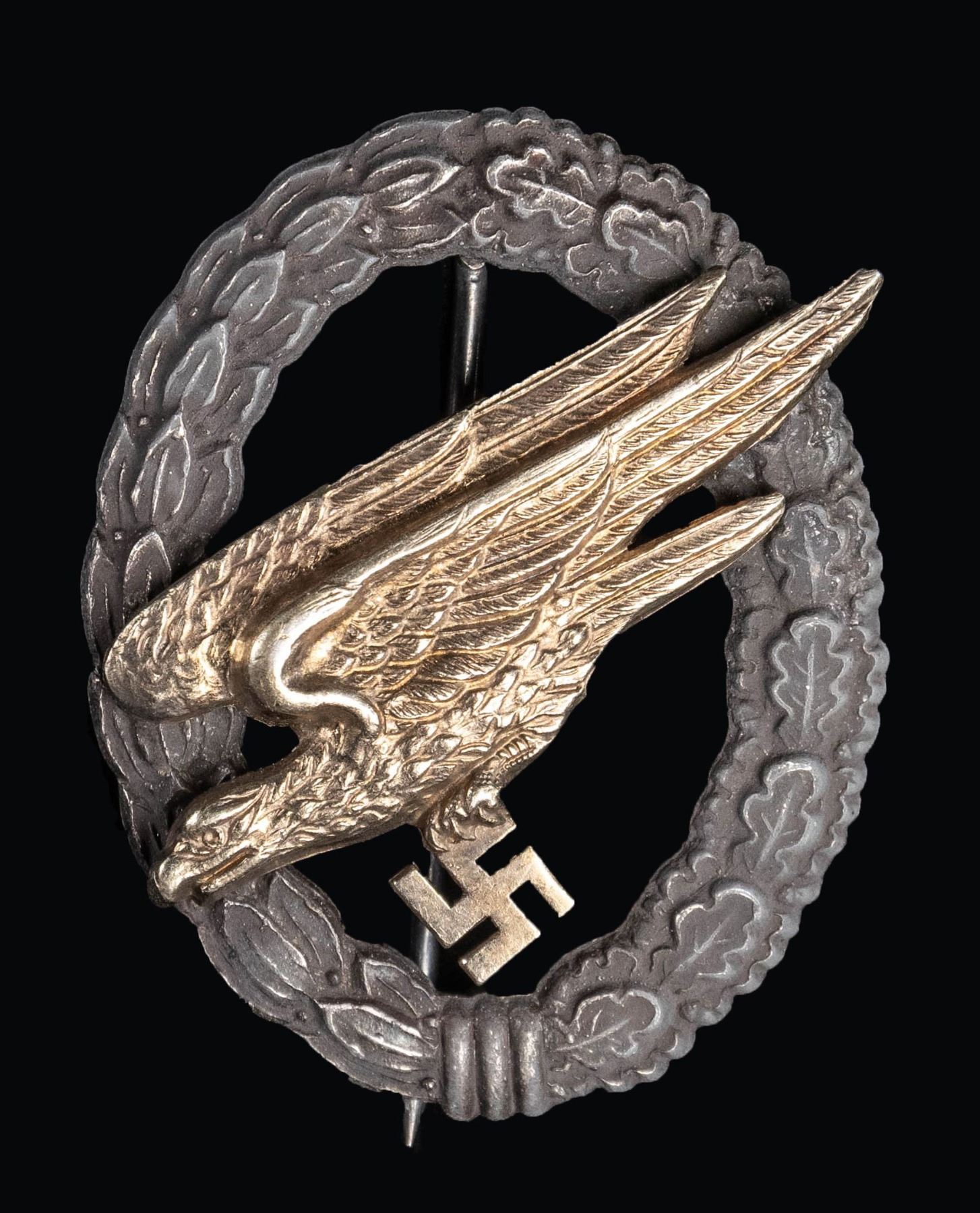 A quality reproduction of a WWII German Luftwaffe Paratrooper Badge marked on the reverse "G. H. OSANG DRESDEN". CONDITION: very light wear. PROVENANCE: Estate Collection of John "Jack" Dhooghe. (02-25572/BF). NON-GUN. $50-100.