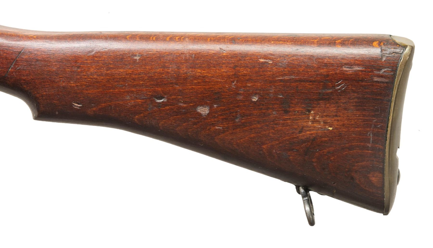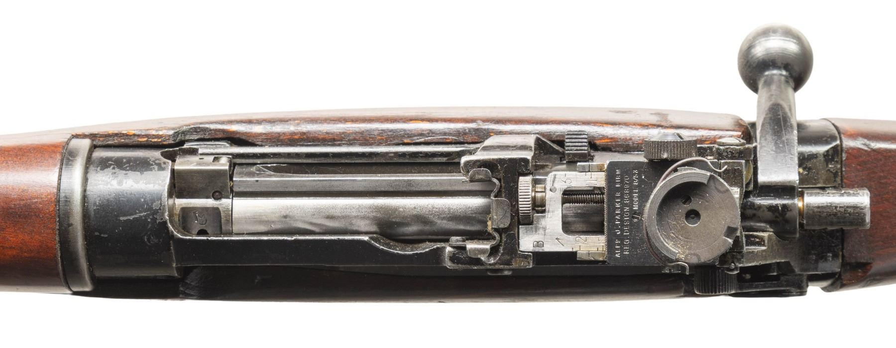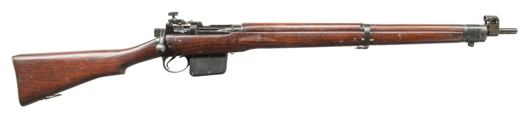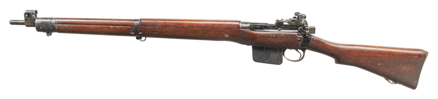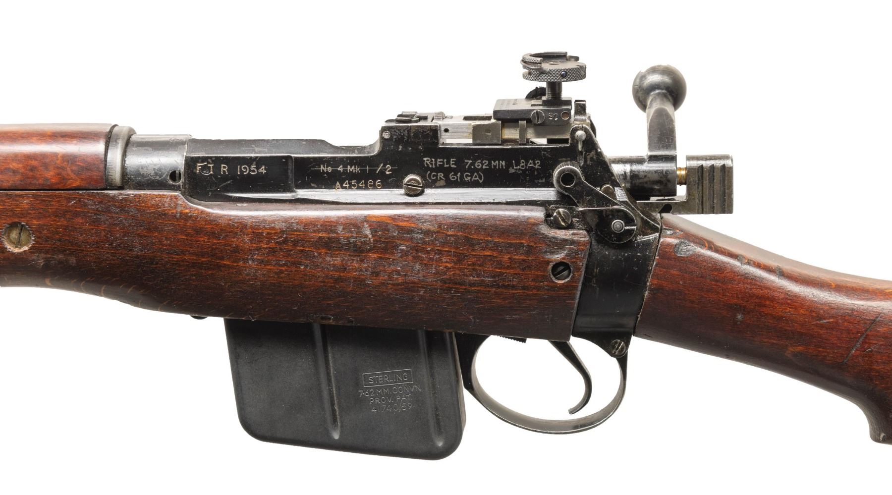 Cal. 7.62 NATO. S# A45486. Bbl. 25 1/5" with British sale proofs. Globe front sight. A.J. Parker 8/53 rear sight. Matching numbers on receiver, bolt handle & forend. Underside of bolt handle has 1954 date. No 4. Mk1/2 converted to 7.62 NATO with Sterling mag & made to resemble an L8A2 rifle. Left side of receiver has "FTR 1954", "No. 4 Mk 1/2" & "RIFLE 7.62MM L8A2 (CR61GA) markings that were likely applied after import into US. Right side of socket has Broad Arrow over 1954 date. Suncorite finish. Hardwood stock set with Indian style transverse reinforcement screw & bottom mounted sling swivels. MAGS: 1-10 rd. Sterling made. CONDITION: stock set has added finish with some green paint on toe, a couple light chips, scattered dings & handling marks. Metal retains 70% Suncorite finish with scattered flaking on the exposed edges. Action functions properly when hand cycled. Very good plus bright bore. (25-5215/MJC). CURIO. $500-800.