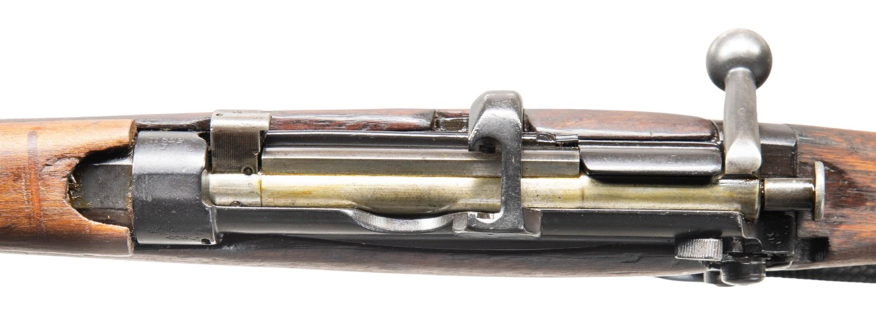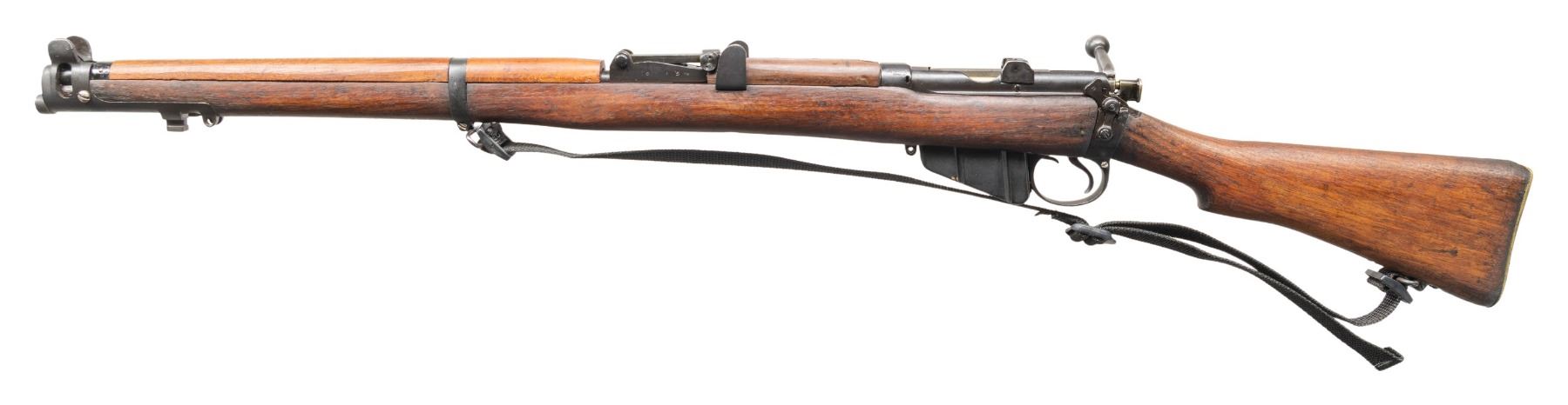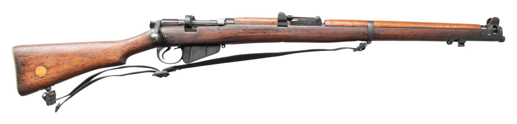 Cal. 303 Brit. S# I55911. Bbl. 25 1/2". Standard SMLE sights. Nosecap is mismatched & forend number is illegible but other visible parts have been arsenal renumbered to match receiver. Right rear of receiver has Century import marking. Right side of socket has BSA SHTLE III* markings & 1916 date. Left side of socket has 1939 arsenal rework date. Arsenal rework blue finish. Hardwood stock set with bottom mounted sling swivels, modern black nylon sling & filled in disc slot. MAGS: 1-10 rd. arsenal force matched to match receiver. CONDITION: stock set has an arsenal cleaned appearance with a couple armorer repairs, a couple moderate gouges, scattered dings & handling wear. Metal retains 92% arsenal rework blue with scattered edge wear, handling marks & some fading. Action functions properly when hand cycled. Bore shows some scattered frosting but strong rifling. (25-6582/MJC). CURIO. $300-500.