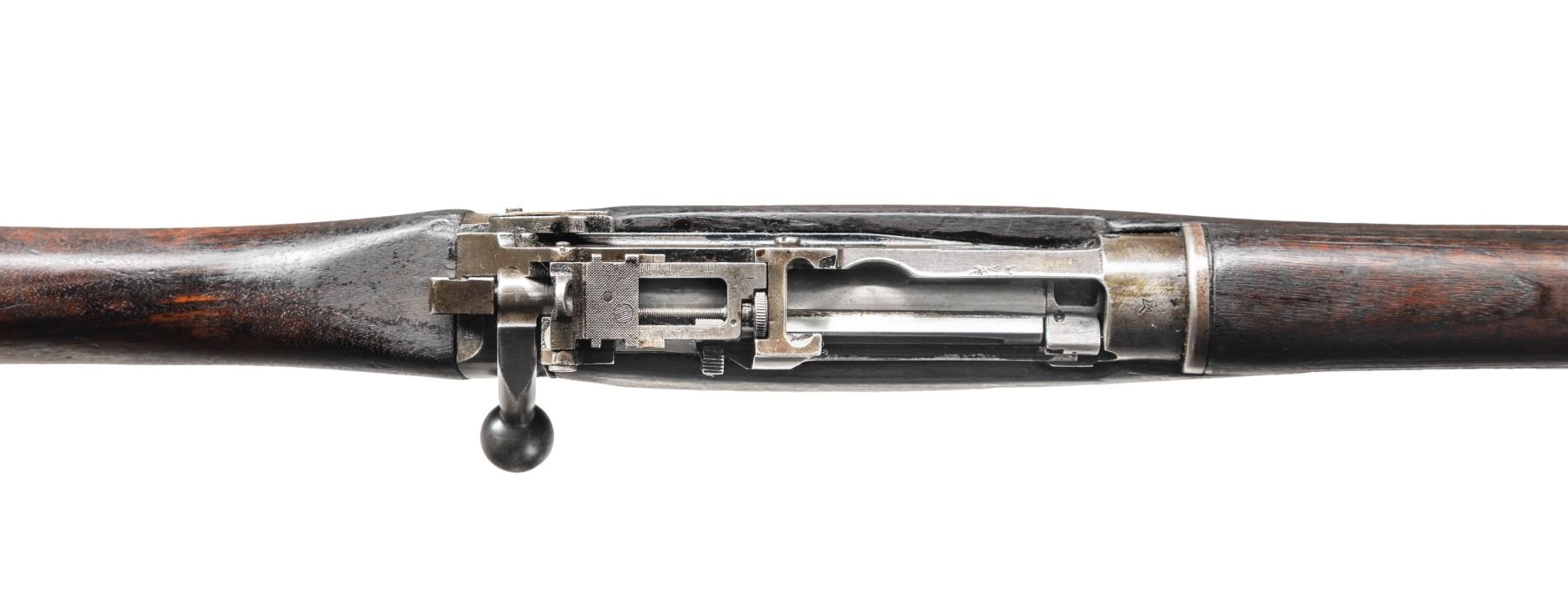 Cal. 303 Brit. S# T34665. Bbl. 25 1/2" with TGI import marking. Blade front sight with protective ears. Ladder aperture rear sight graduated to 1300yds. Matching numbers on bolt & socket. Other parts appear mismatched or unnumbered. Left side of socket has 1943 date, serial number & BSA M/47 marking. Receiver ring has five pointed star marking. Hardwood stock set with bottom mounted sling swivels. MAGS: 1-10 rd. numbered to a different gun. CONDITION: stock set has an arsenal rework appearance with a couple armorer splice repairs on butt, some chipping around buttplate tang, overall heavy finish wear, dings, abrasions & handling marks. Metal is mostly a silvery-gray color with traces of Suncorite finish, some denting on bottom of mag, scattered oxidation, handling marks Action functions properly when hand cycled. Bright very good plus bore with some light frosting. (25-6581/MJC). CURIO. $300-500.