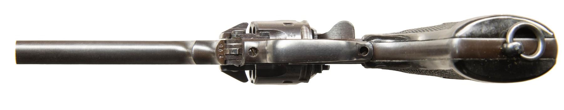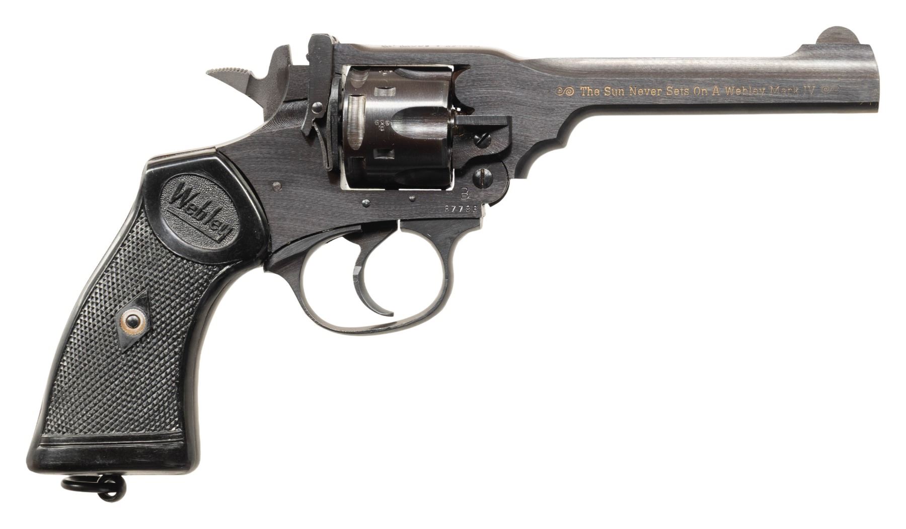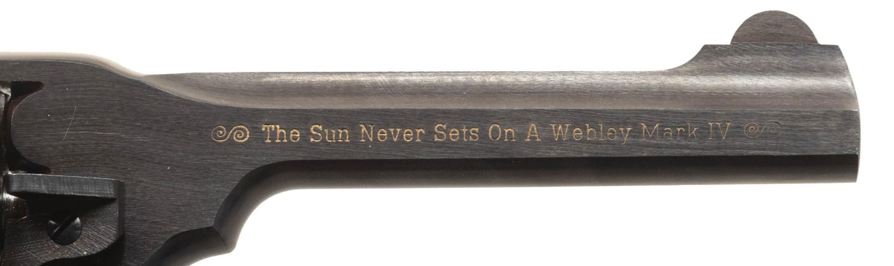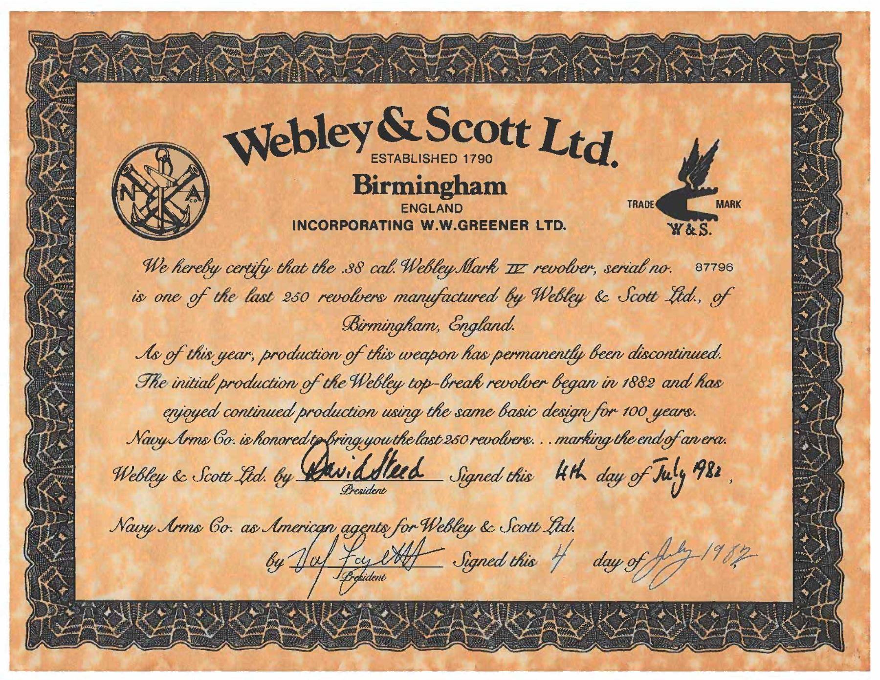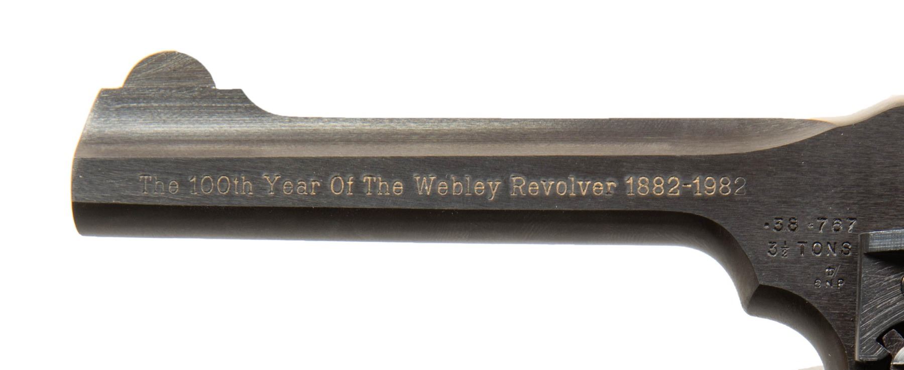 OF THE WEBLEY" DOUBLE ACTION REVOLVER WITH BOX, CASE, & CERTIFICATE. Cal. 38/200. S# 87796. Bbl. 5". 1 of the last 250 Mark IV double action revolvers mfg. by Webley & Scott to commemorate 100 years of the Webley revolver. The left side of the bbl. is marked "The 100th Year of The Webley Revolver 1882-1982", with "The Sun Never Sets on A Webley Mark IV" on the right. Top strap of the bbl. is marked "WEBLEY & SCOTT LTD/ MADE IN ENGLAND" with "MARK IV .38" marked on the left. Bbl. and cyl. exhibit assorted British proofs. Metal components exhibit a brushed blue finish overall. Frame is mounted with 2-piece Webley checkered black synthetic grips, featuring a lanyard swivel and ring on the butt. Fixed blade front sight with integral square notch rear sight on bbl. latch. All serialized parts are matching and include the frame, bbl., as well as the cyl. UNATTACHED ACCESSORIES: cardboard box containing a wood display case. Display case features a yellow felt lined interior, with a black and gold "Webley & Scott/ ESTABLISHED 1790/ Birmingham/ ENGLAND/ INCORPORATING W.W. GREENER" label on the interior of the lid. Revolver is also accompanied by a certificate, listing this revolver by S# and signed on the 4th of July, 1982 by the company president, indicating that this example was one of the last 250 Mark IV revolvers produced by Webley & Scott. CONDITION: extremely fine, with metal components retain virtually all of their original factory blue finish, exhibiting few light superficial marks from handling and storage. Bluing shows areas that are showing through to brown that are only visible when viewed beneath a light, though this does not appear to be from wear. Cyl. exhibits no dragline. Brilliant mirror bore, retaining well defined rifling throughout. Proper manual mechanics (with action open to preserve cyl. condition). Grips are excellent overall. Box shows several tears to the lid, but otherwise remains sound. Case is very good, exhibiting a few superficial marks from handling and storage. (25-6576/MLW). MODERN. $500-800.