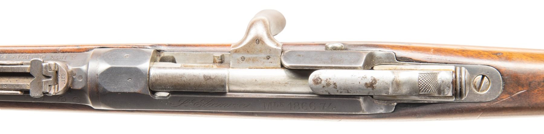 Cal. 11mm Gras. S# M18263. Bbl. 20" dated 1876. Blade front sight. Ladder rear sight graduated to 1100m. Both action screws are numbered "87" but other visible numbered parts are matching to bbl. Left side of receiver has "St. Etienne M1866-74" & "M80" markings. Consignor states this rifle was Greek issued but no visible Greek markings. The Greeks did indeed use Gras variants including some made by Steyr. Arsenal blue finish. Hardwood stock set with bottom mounted sling swivels & brass hardware. Replacement ramrod present. CONDITION: refinished stock set has added varnish with faint cartouches, some light chipping, scattered dings, scratches & handling marks. Brass parts have been cleaned to bright with some pitting, varnish overrun, dings & oxidation. Balance of metal retains 70% arsenal rework blue with scattered oxidation, fading to gray, edge wear, varnish overrun & handling marks. Action functions properly when hand cycled. Very good bore with strong rifling. PROVENANCE: From the PMRB Collection. (01-28402/MJC). ANTIQUE. $600-900.