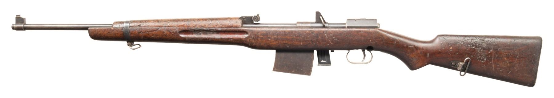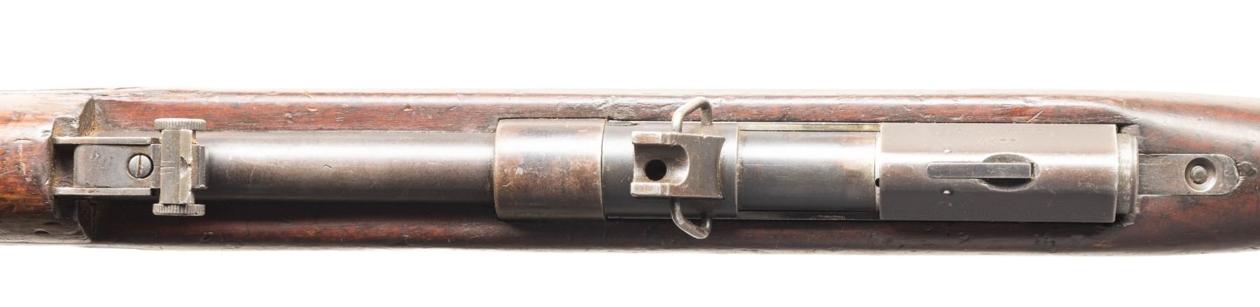 Cal. 22 LR. S# 0047. Bbl. 25 5/8". Blade front sight. Adjustable rear sight. Scarce Beretta made rimfire Training rifle for Egypt based on the Hakim rifle. Left side of receiver has translated electropencil serial number but no visible import markings present. Receiver has various Arabic markings as well as "MADE IN ITALY" in English. Blued finish. Hardwood stock set with white painted Arabic markings on right of butt & left side sling swivels. MAGS: 1-10 rd. CONDITION: stock has a darkened appearance with scattered dings, some chipping, overall handling marks, scratches & some rough areas. Metal retains 40% arsenal blue with overall thinning, fading to gray, edge wear, handling marks & some oxidation. 6Action functions properly when hand cycled. Very good bore with strong rifling. PROVENANCE: From the PMRB Collection. (25-5905/MJC). CURIO. $400-600.