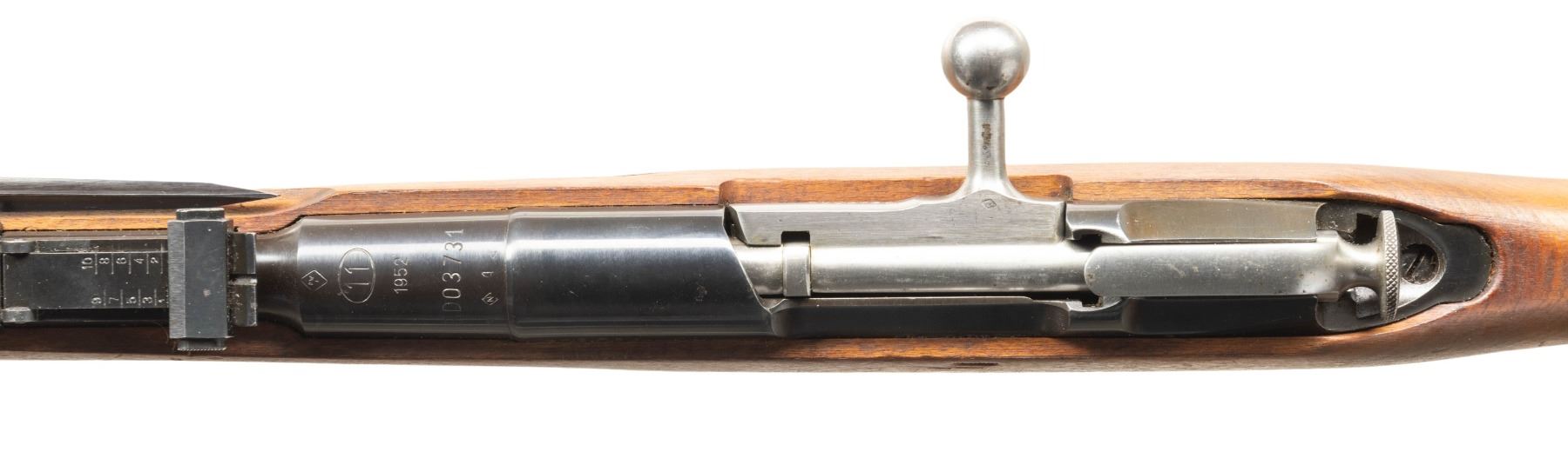 Cal. 7.62x54R. S# BD3731 (Importer). Bbl. 20 1/2" with Century import marking. Standard M44 sights. All matching numbers. Bbl shank has 1952 date & Radom circle 11 markings. Left side of receiver has importer added serial number. Blued finish. Beech stock set. Folding spike bayonet present. No cleaning rod present. CONDITION: stock shows some light dings & handling marks. Metal retains 97% arsenal blue with some light oxidation on buttplate, edge & light handling wear. Action functions properly when hand cycled. Bright very good plus bore with strong rifling. (25-6598/MJC). CURIO. $300-500.