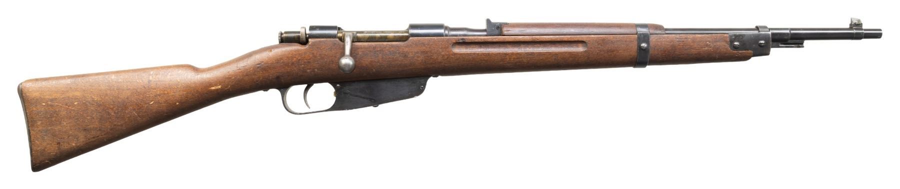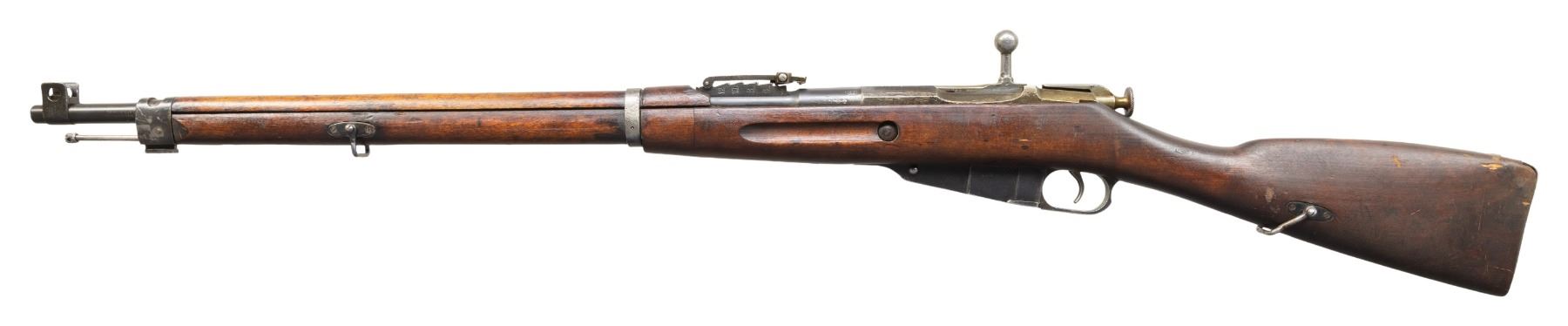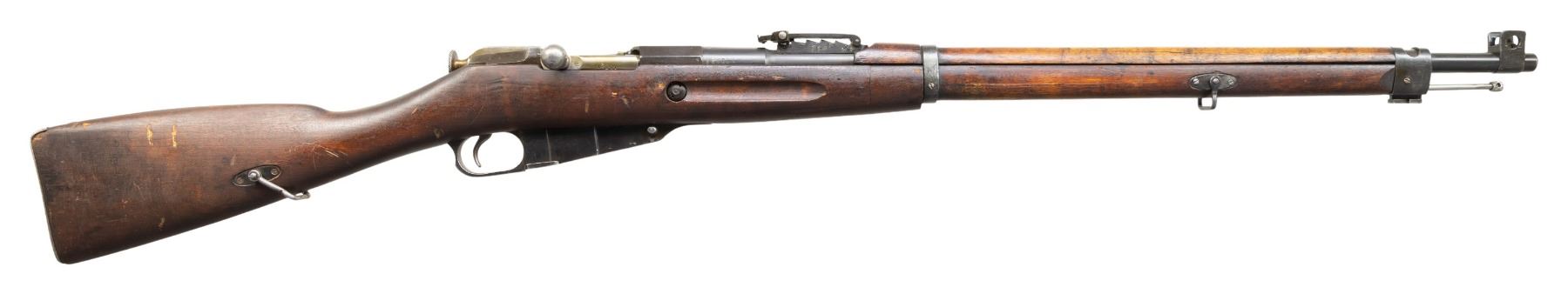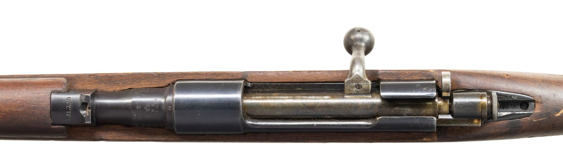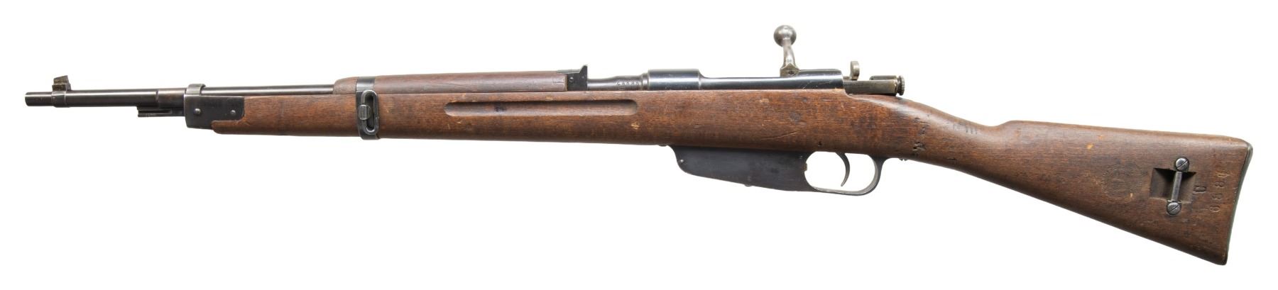 2) Finn Marked M38 Terni Carcano. S# C6886. Bbl. 19". Tall blade front sight. Fixed rear sight. Matching numbers on bbl. & stock. 1938 dated bbl. with two Finn "SA" stamps & Terni arsenal marking. Arsenal blue finish with bolt assembly having a case colored appearance. Beech stock set with left side sling provisions. Left side of butt has strong 1939 dated Terni roundel. CONDITION: stock shows scattered dings, scratches, handling marks & some finish loss. Metal retains 90% arsenal blue with scattered fading, light oxidation, edge wear, a few dings & handling marks. Action functions properly when hand cycled. Very good bright bore with strong rifling. PROVENANCE: From the PMRB Collection. (25-5835/MJC). BOTH CURIO.
