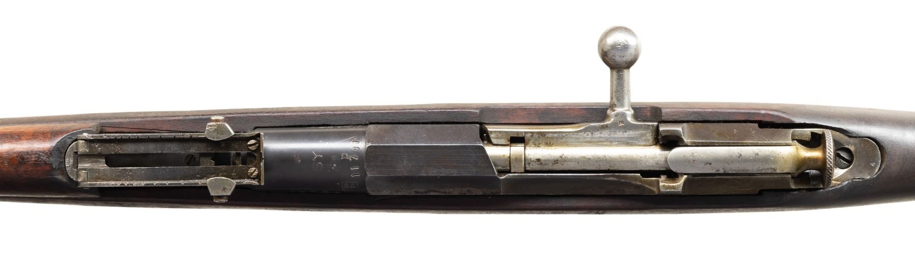 1) Finnish M28 Mosin Nagant Bolt Action Rifle. Cal. 7.62x54R. S# 11781. Bbl. 27" with Marathon import marking. Blade front sight with protective ears. M91 style rear sight with Finnish graduations. Matching numbers on bbl. shank & bolt. Other parts are mismatched as-is typical for Finn Mosins. Bbl. shank has "SY" ""D" & boxed "SA" markings. RIght side of bbl. has lined-out "S56239" Civil Guard District. Arsenal blue finish. Hardwood stock set with bottom mounted sling swivels & rounded finger joints. Cleaning rod present. CONDITION: stock set has arsenal rework finish with a thin 5" crack on handguard, some small plug repairs, a few light gouges, scattered dings, handling marks & scratches. Metal retains 60% arsenal blue with left side of receiver & rear band being cleaned to bright with pitting & oxidation, scattered edge wear, silvering, oxidation & handling marks. Action functions properly when hand cycled. Very good bright bore with a counterbore at muzzle, strong rifling & some light frosting. (25-5816/MJC).
