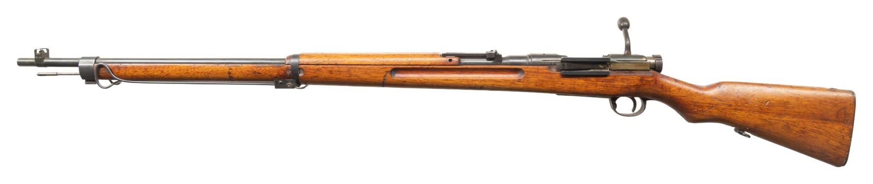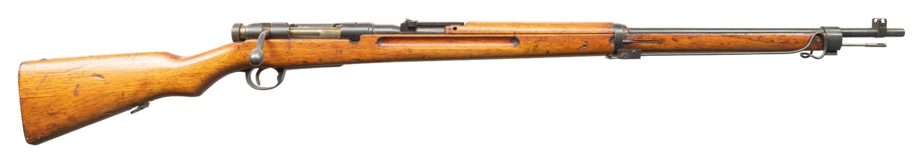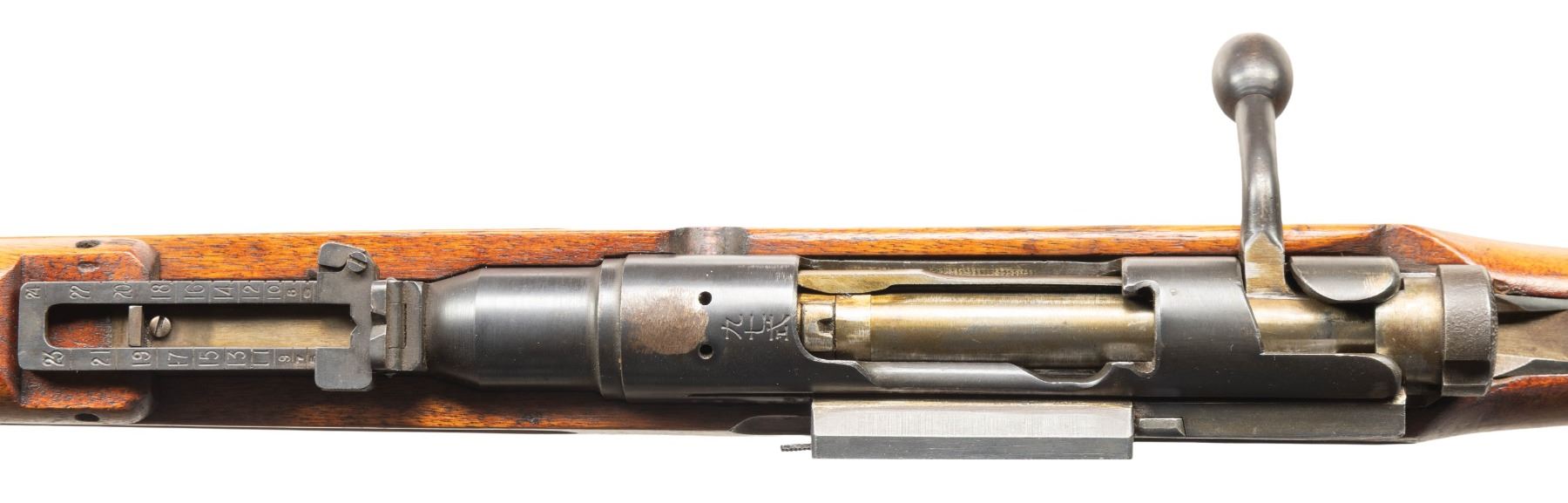 Cal. 6.5 Jap. S# 7309. Bbl. 31 1/2". Blade front sight with protective ears. Ladder rear sight graduated to 2400m. Matching numbers on receiver, turned down bolt handle, extractor, safety & floorplate. Other visible parts are unnumbered. Receiver ring has ground mum & Type 97 markings. Left side of receiver has properly offset Kokura markings & serial number. Scope base present but no mount or scope. Blued finish with strawed small parts. Asian hardwood stock set with two piece butt & bottom mounted sling swivels. Underside of butt has strong Kanji markings. Monopod & cleaning rod present. CONDITION: stock retains a strong original finish with scattered dings, handling marks, scratches & some light finish loss on butt. Metal retains 92% original blue & strong straw with scattered fading, handling marks & light oxidation. Action functions properly when hand cycled. Bright near excellent bore. (25-6870/MJC). CURIO. $1,000-1,500.