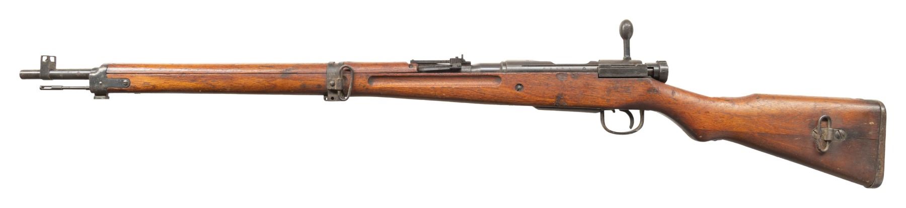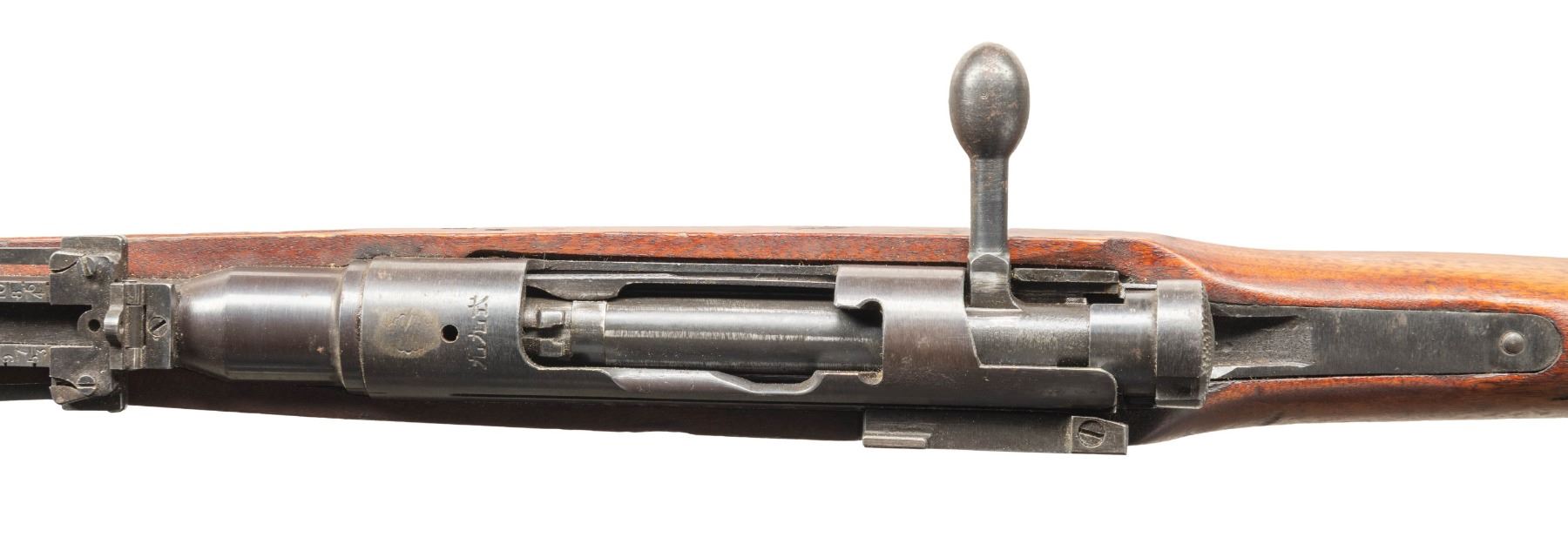 Cal. 7.7 Jap. S# 81006. Bbl. 25 1/2". Blade front sight with protective ears. Ladder aperture rear sight graduated to 1500m with AA wings. All visible matching numbers. Receiver top has ground mum & Type 99 markings. Left side of receiver has Kokura & 21st series markings. Blued finish. Asian hardwood stock set with two piece butt & left side sling swivels. Underside of stock has strong Kanji markings. Cleaning rod present. CONDITION: stock set shows scattered dings, a few abrasions, scratches, small chips, handling marks & staining. Metal retains 30% original blue with overall fading to gray, scattered oxidation, handling marks & notable edge wear on front end. Action functions properly when hand cycled. Very good plus bright bore. (25-6184/MJC). CURIO. $200-400.