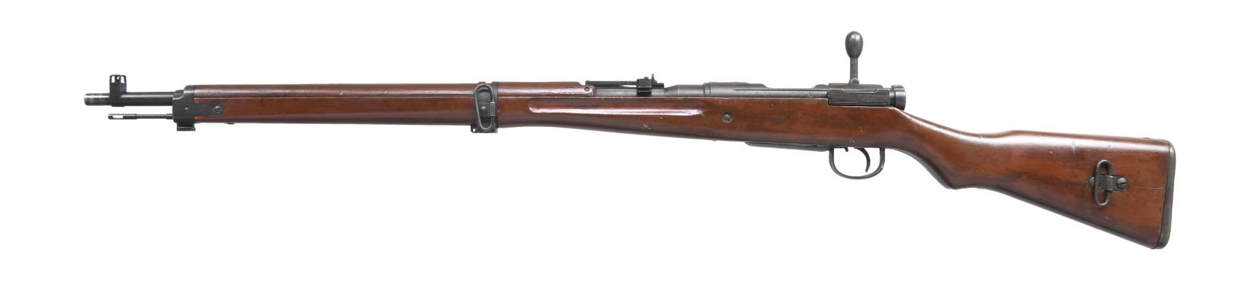 Cal. 7.7 Jap. S# 4278. Bbl. 25 1/2". Blade front sight with protective ears that are bent. Ladder aperture rear sight graduated to 1500m that is missing its AA wings. All matching numbers including firing pin. Receiver top has ground mum & Type 99 markings. Left side of receiver has Nagoya & second series symbols. Blued finish. Asian hardwood stock set with two piece butt & left side sling swivels. Cleaning rod present. CONDITION: sanded stock has thickly added finish with a couple chips, scattered dings, flaking, handling marks & scratches. Metal is mostly gray with scattered oxidation, edge wear, touch up finish & traces of original blue. Action functions properly when hand cycled. Bright near excellent bore. (25-2802/MJC). CURIO. $250-400.