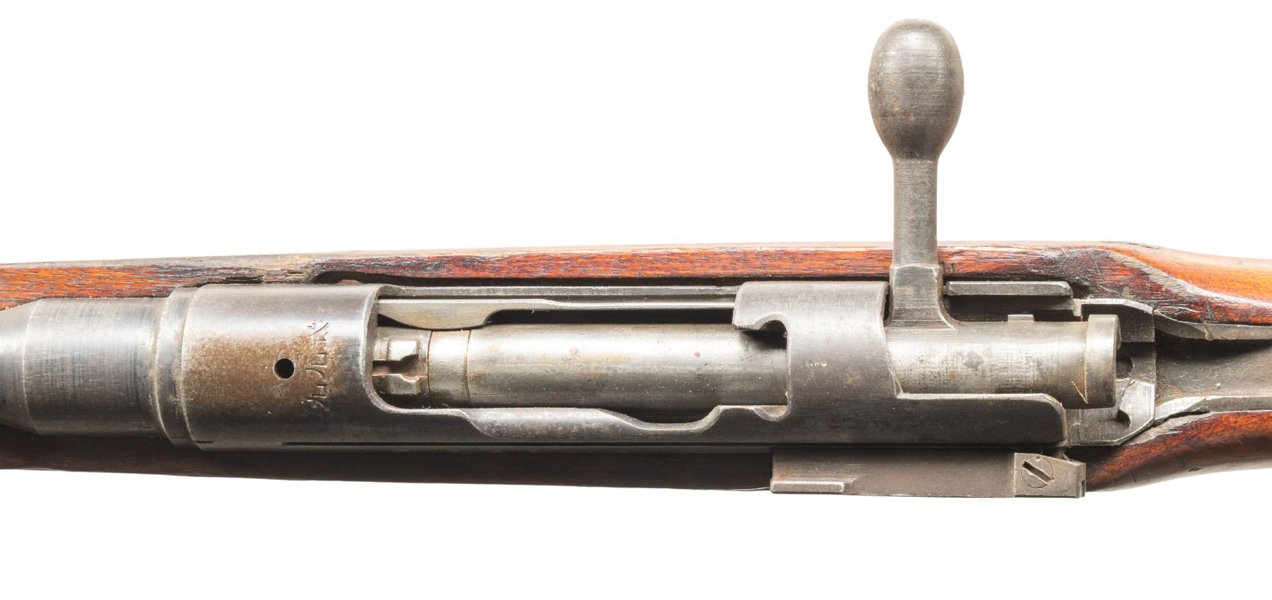 Cal. 7.7 Jap. S# 73792. Bbl. 25 1/2". Blade front sight with ears. Ladder aperture rear sight graduated to 1500m with AA wings. Matching numbers on receiver & bayonet lug. Bolt parts are mismatched with safety & firing pin missing. Receiver top has ground mum & Type 99 markings. Left side of receiver has Kokura & 21st series symbols. Blued finish. Asian hardwood stock set with two piece butt & left side sling swivels. Cleaning rod present. Stock has a loose duffel cut under rear band & rear half of handguard is missing. CONDITION: stock set shows a couple gouges, some paint remnants, scattered dings, scratches & handling marks, Metal is turning gray with scattered oxidation more heavy on bottom metal, scattered traces of original bluing, edge wear & staining. Bolt is operational when hand cycled but is missing safety & firing pin. Bore shows scattered dried grease & oxidation but has visible rifling. (25-6181/MJC). CURIO. $200-300.