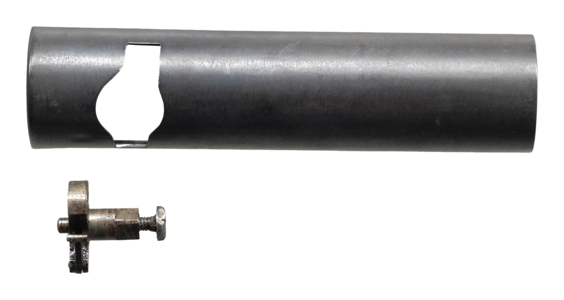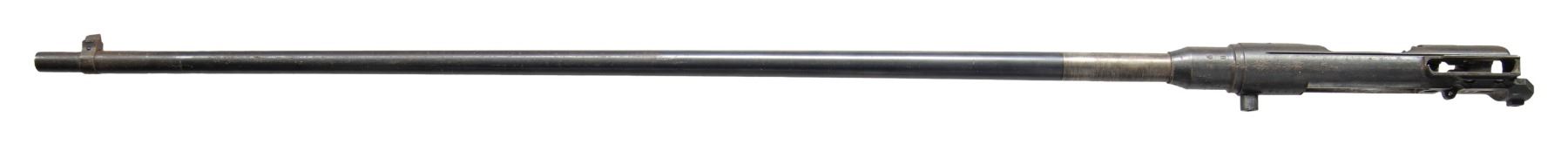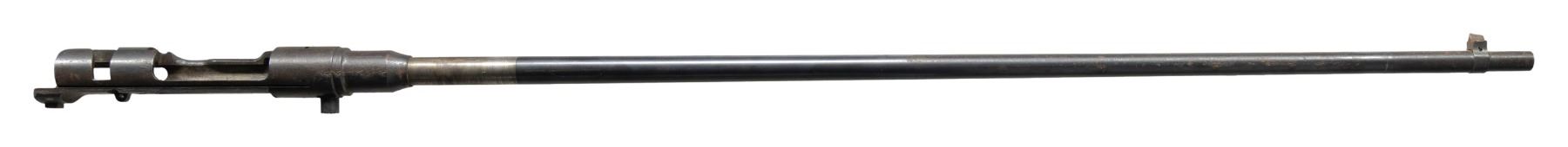 Cal. 6.5 Jap. S# 911850. Bbl. 31". This lot consists of a barreled Type 38 receiver with front sight & separate dust cover that is numbered differently than receiver's assembly number. No other parts present. Mum is intact & left side of receiver has Tokyo arsenal marking. CONDITION: metal shows some light tool marks on bbl., scattered oxidation & pitting along its length. Bore shows scattered pitting & frosting but strong rifling. (25-3063/MJC). MODERN. $75-150.