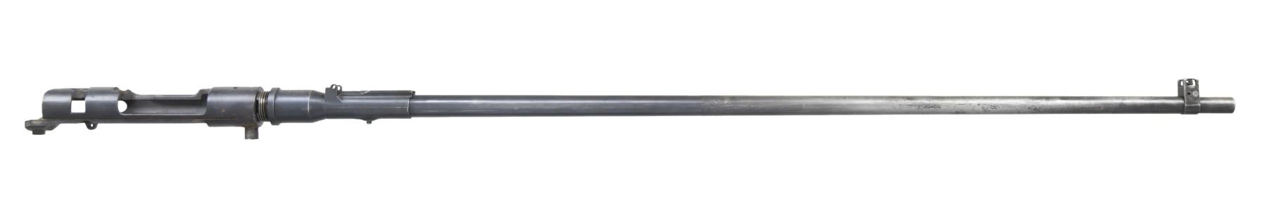 Cal. 6.5 Jap. S# 11019. Bbl. 31 1/2". Blade front sight with protective ears. No rear sight present. 24th series Kokura Type 38 receiver with bbl. that is not screwed in properly. Chamber is plugged. Ground mum. No other parts present. Blued finish. CONDITION: metal shows a large area turned to a silvery gray on front half, scattered pitting, oxidation & strong traces of bluing. Dark bore with scattered oxidation & pitting. (25-3062/MJC). MODERN. $25-50.