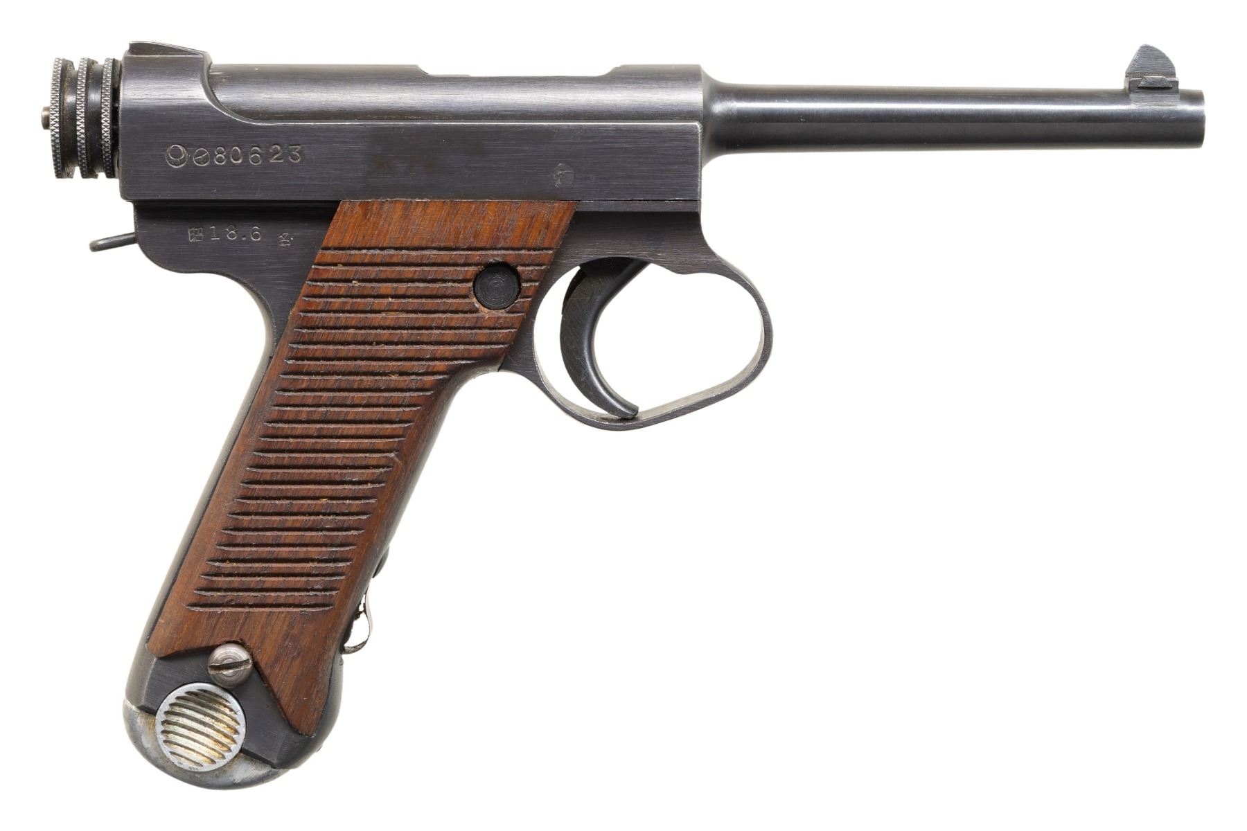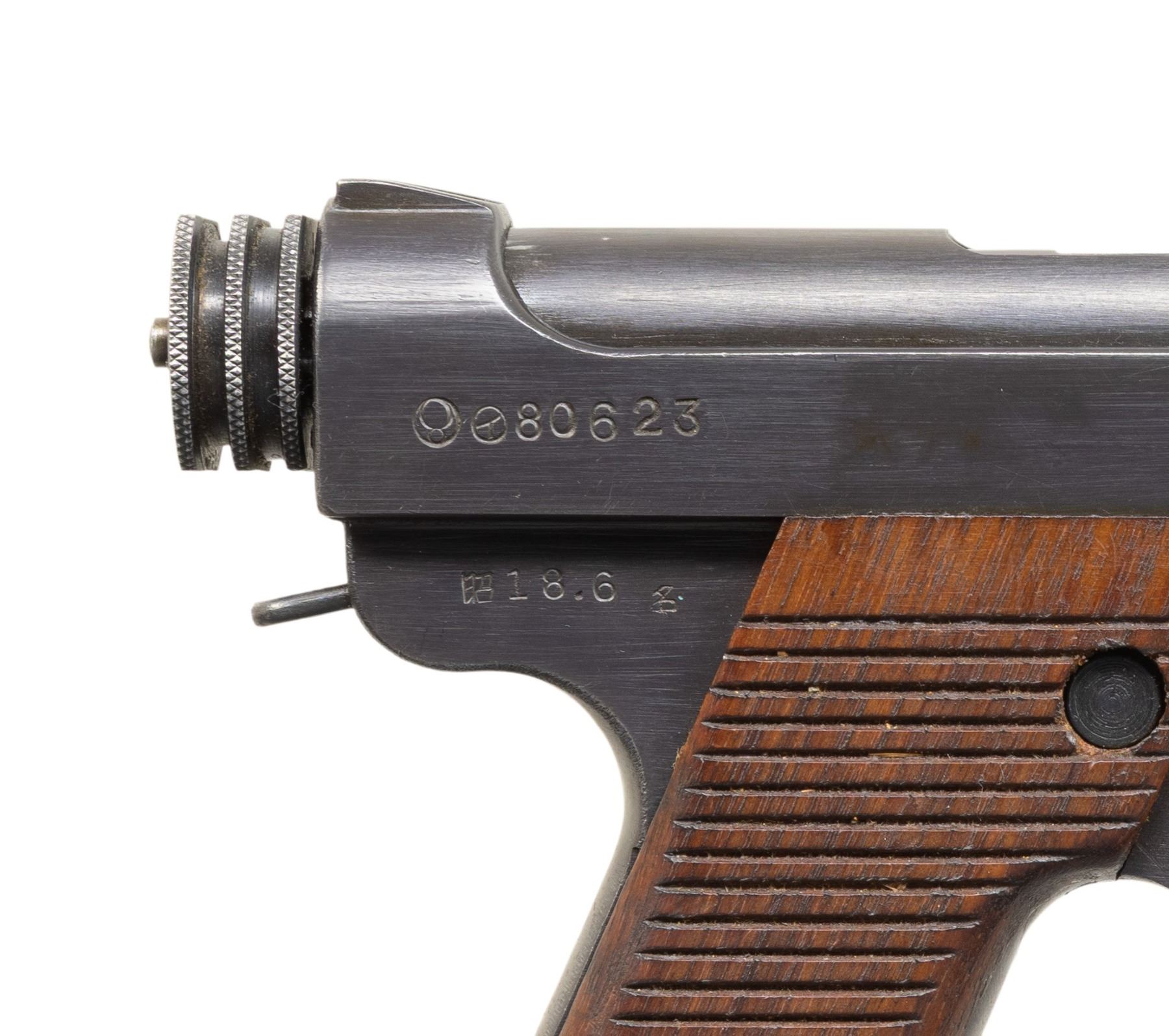 SERIES I TYPE 14 NAMBU SEMI-AUTOMATIC PISTOL. Cal. 8mm Nambu. S# 80623. Bbl. 4 9/16". Type 14 Nambu semi-automatic pistol mfg. at the Toriimatsu arsenal under Nagoya supervision in June of 1943. The left side of the frame exhibits Kanji characters denoting the model designation, with the Nagoya arsenal insignia, Series I symbol, S#, and the Showa date code "18.6" marked on the right. Metal components exhibit a salt blue finish overall, as is correct for Toriimatsu production Type 14s. Frame is mounted with 2-piece grooved wood grips. Standard dovetailed blade front sight and integral square frame notched rear sight. Large pattern trigger guard with grooved cocking knob. Matching numbers are present on the frame, mag. release button, bbl. extension, bolt, as well as the locking block. Trigger guard (S#: 126), cocking knob (S#: 192), and grips (L: 8619 / R: 8417) are mismatched, with remaining components being unnumbered. MAGS: x1 non-matching (S#: 720) blued steel 8-rd. CONDITION: metal components retain the vast majority of their original factory salt blue finish, showing some light edge wear, as well as some light superficial handling marks overall. Trigger guard shows areas of wear and thinning that are fading to brown patina, which are mostly visible when viewed beneath a light. Mirror bore, retaining well defined rifling throughout. Proper manual mechanics. Grips are very good, exhibiting some superficial handling marks and impressions from handling and storage. An extremely attractive example of a Toriimatsu Series I production Type 14 Nambu pistol. (25-6573/MLW). CURIO. $700-1,100.